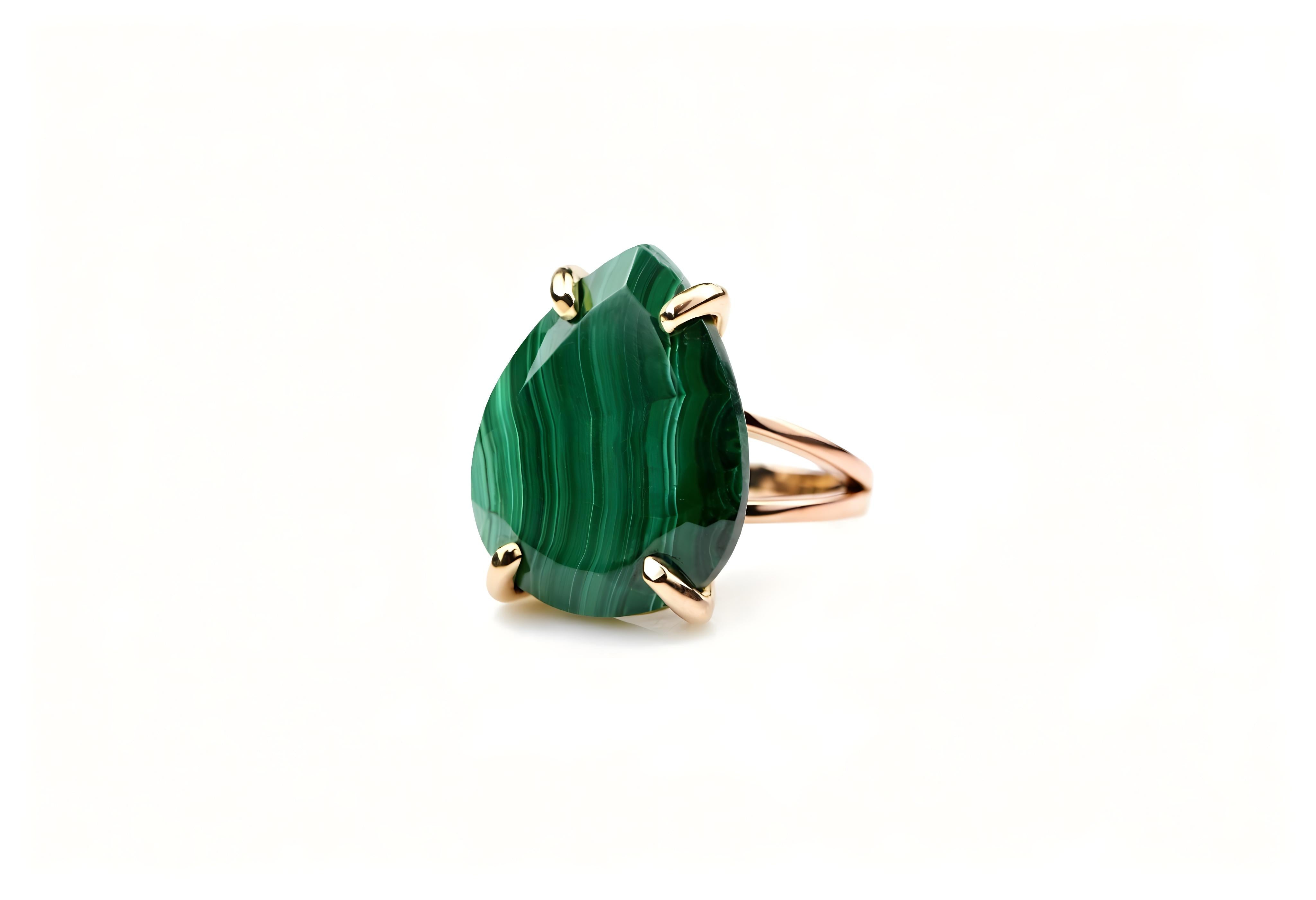 This pear-cut malachite ring brings a deep green glow and a feminine teardrop silhouette. The smooth band and lustrous gold finish highlight the natural patterns in the stone, creating a soft and graceful look on the hand. Perfect for everyday wear or for adding a meaningful touch to a dressed-up outfit, this gemstone ring is crafted for women who love colorful, refined jewelry made from semiprecious stones.