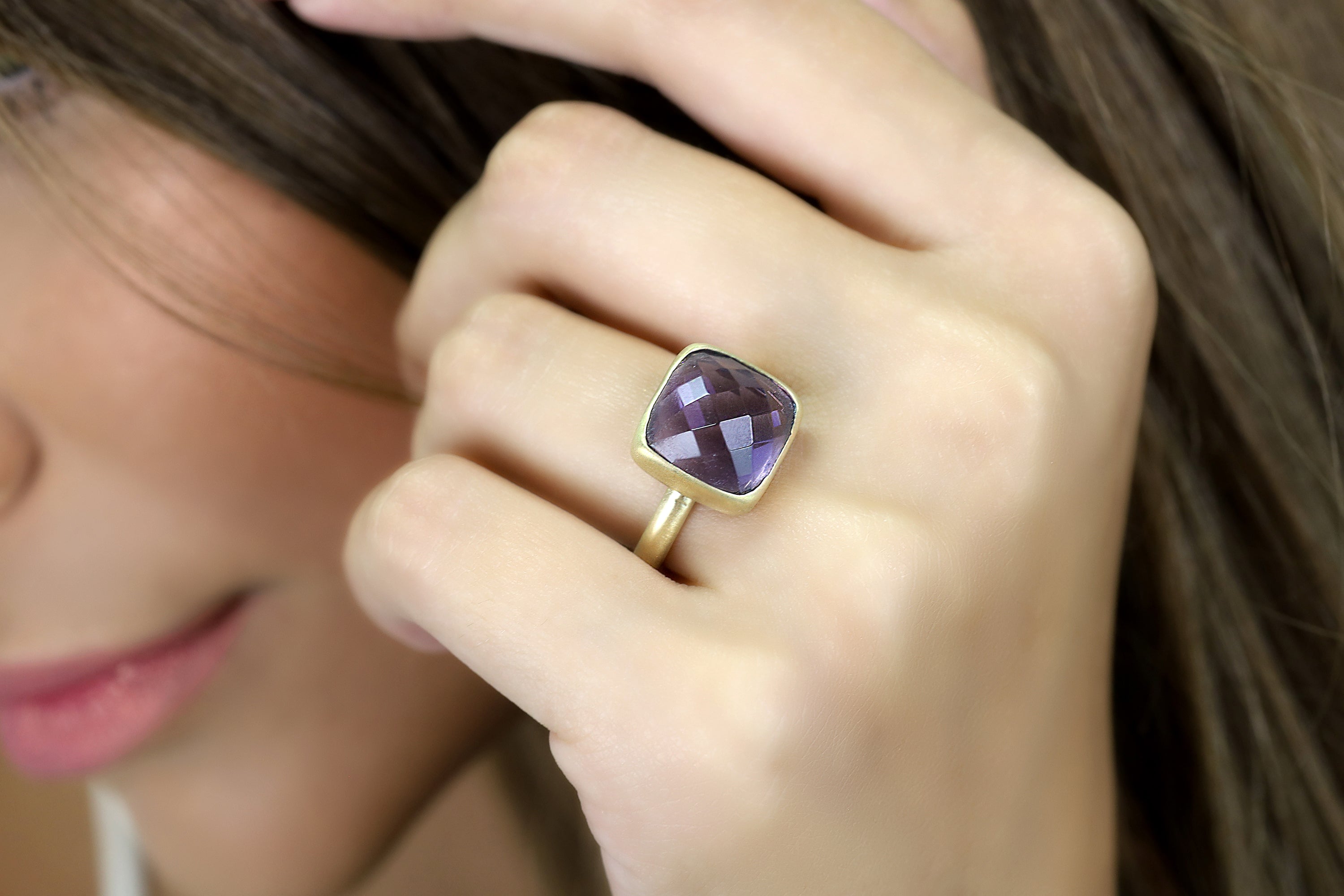 This Square Amethyst Bezel Set Ring is a timeless piece crafted in 14k gold. Featuring a vibrant purple amethyst gemstone, it celebrates February birthdays in style. The bezel setting offers a sleek, modern look, making it perfect for both everyday wear and special occasions.