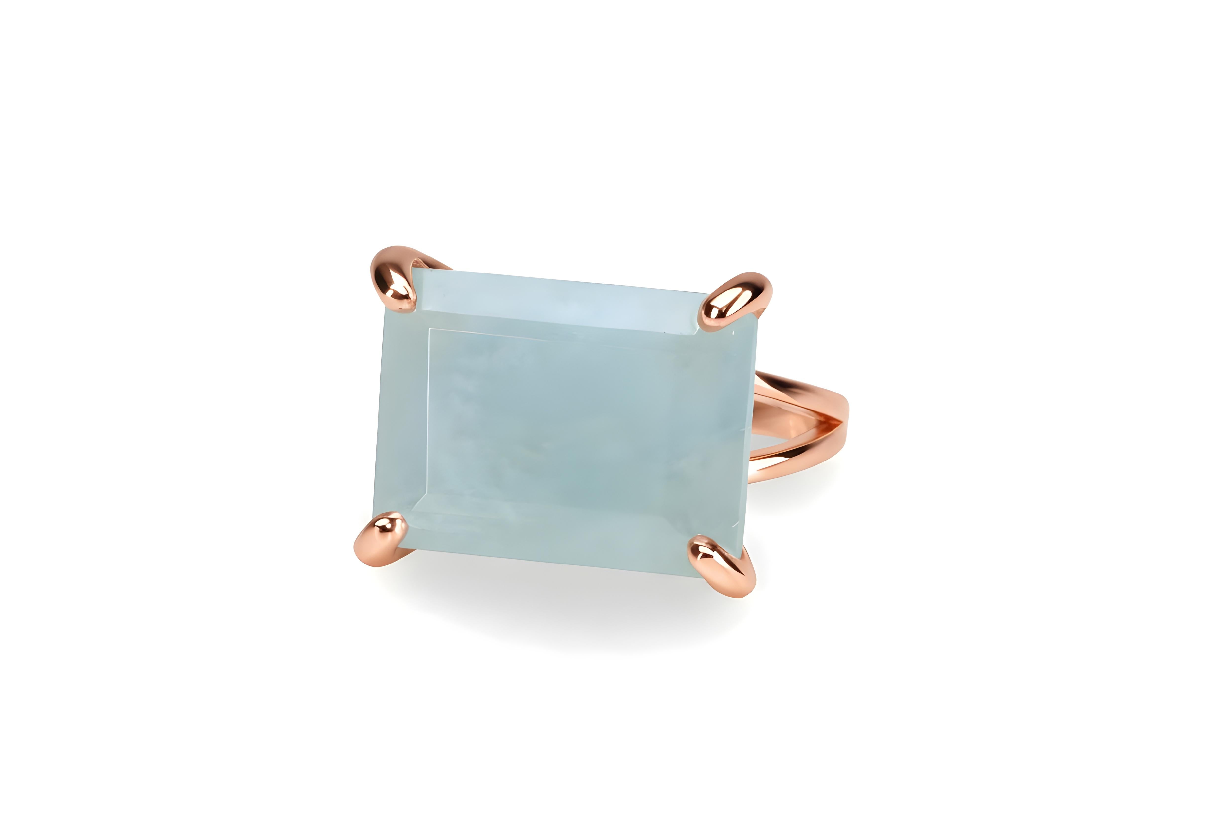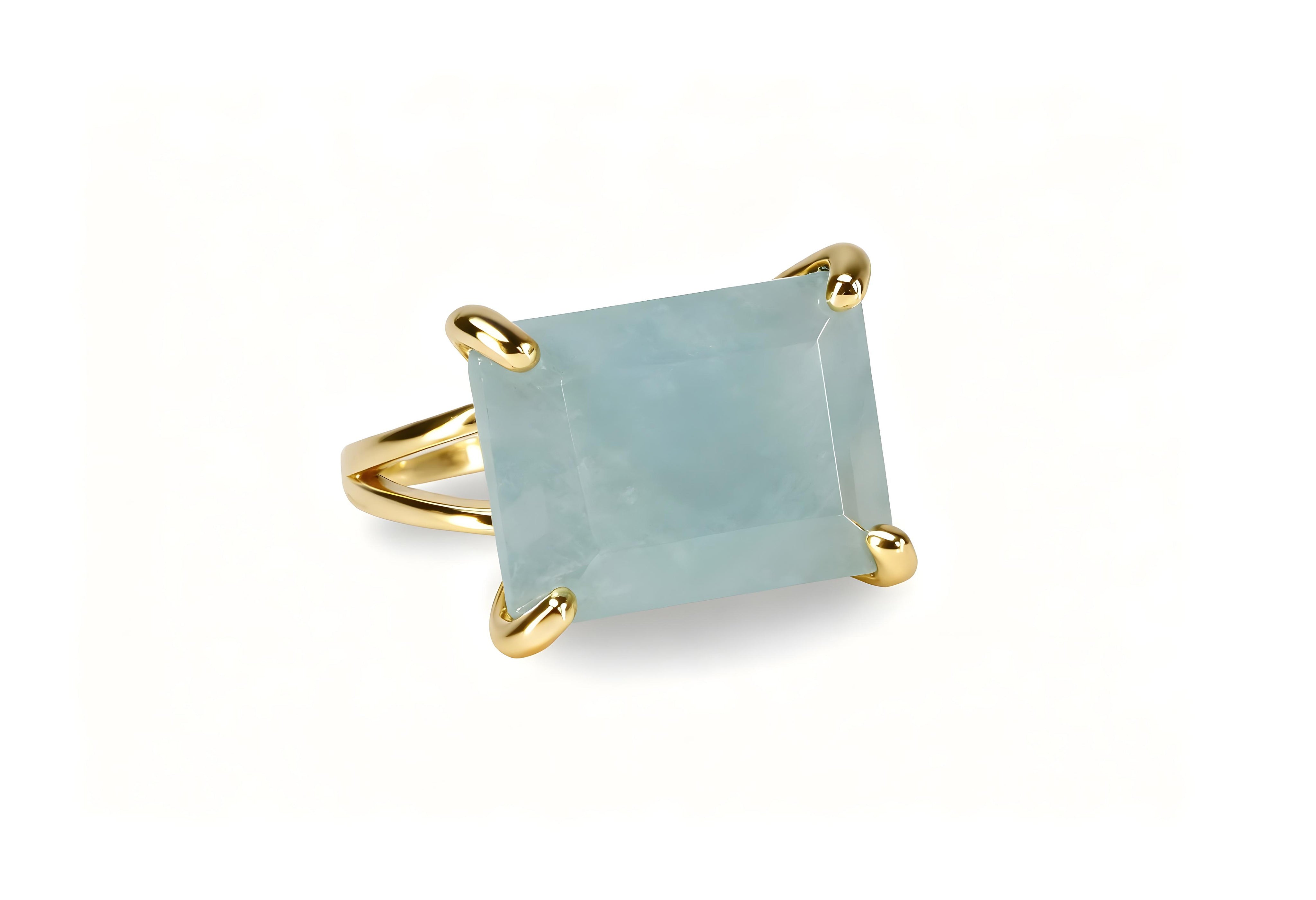 This 14k gold vermeil aquamarine ring showcases a luminous rectangular gemstone in a unique horizontal setting. The soft sky-blue tone of the aquamarine pairs beautifully with the warm gold, creating a serene and elegant aesthetic. Perfect as a March birthstone ring or a delicate statement piece, it embodies calmness, purity, and timeless sophistication.