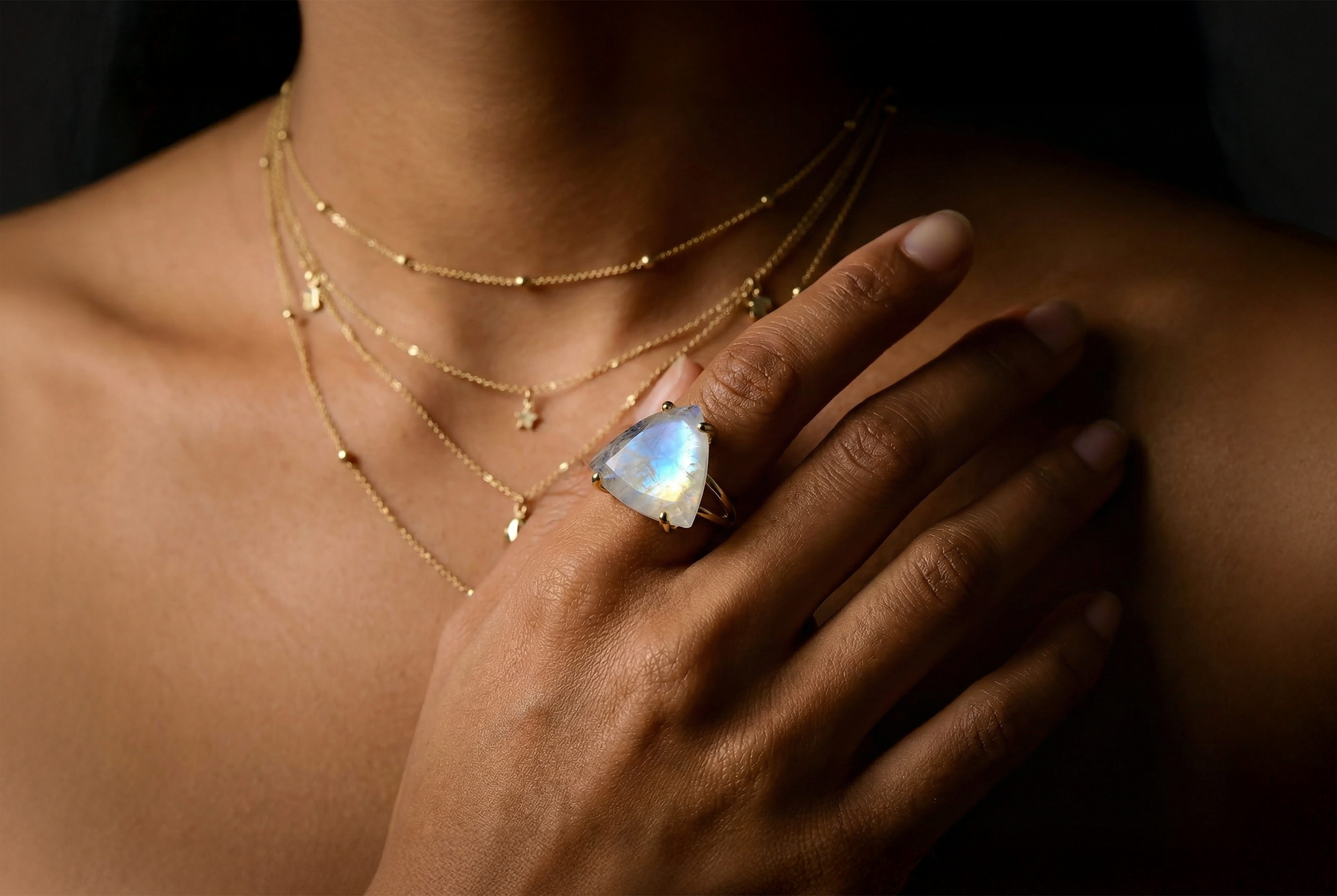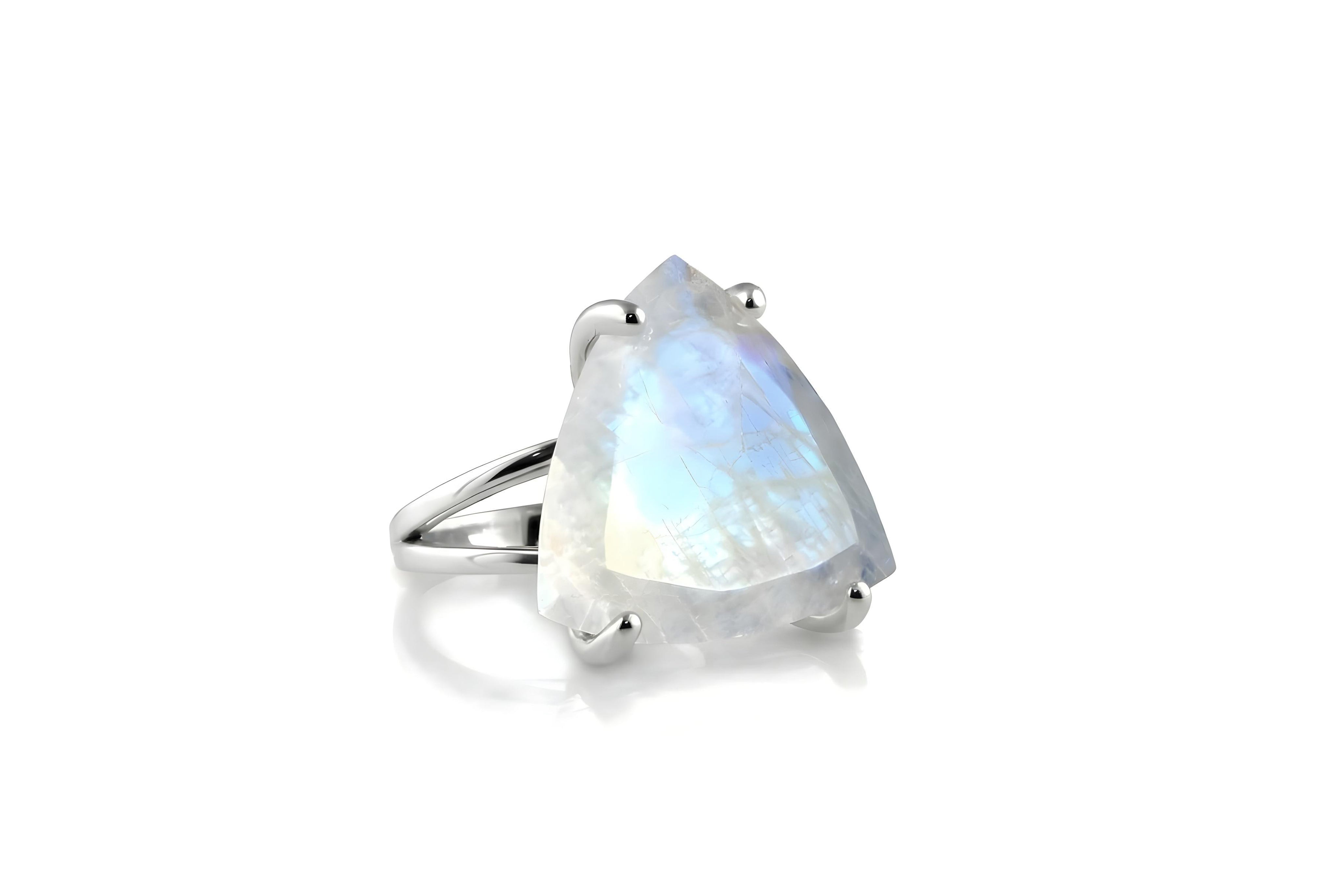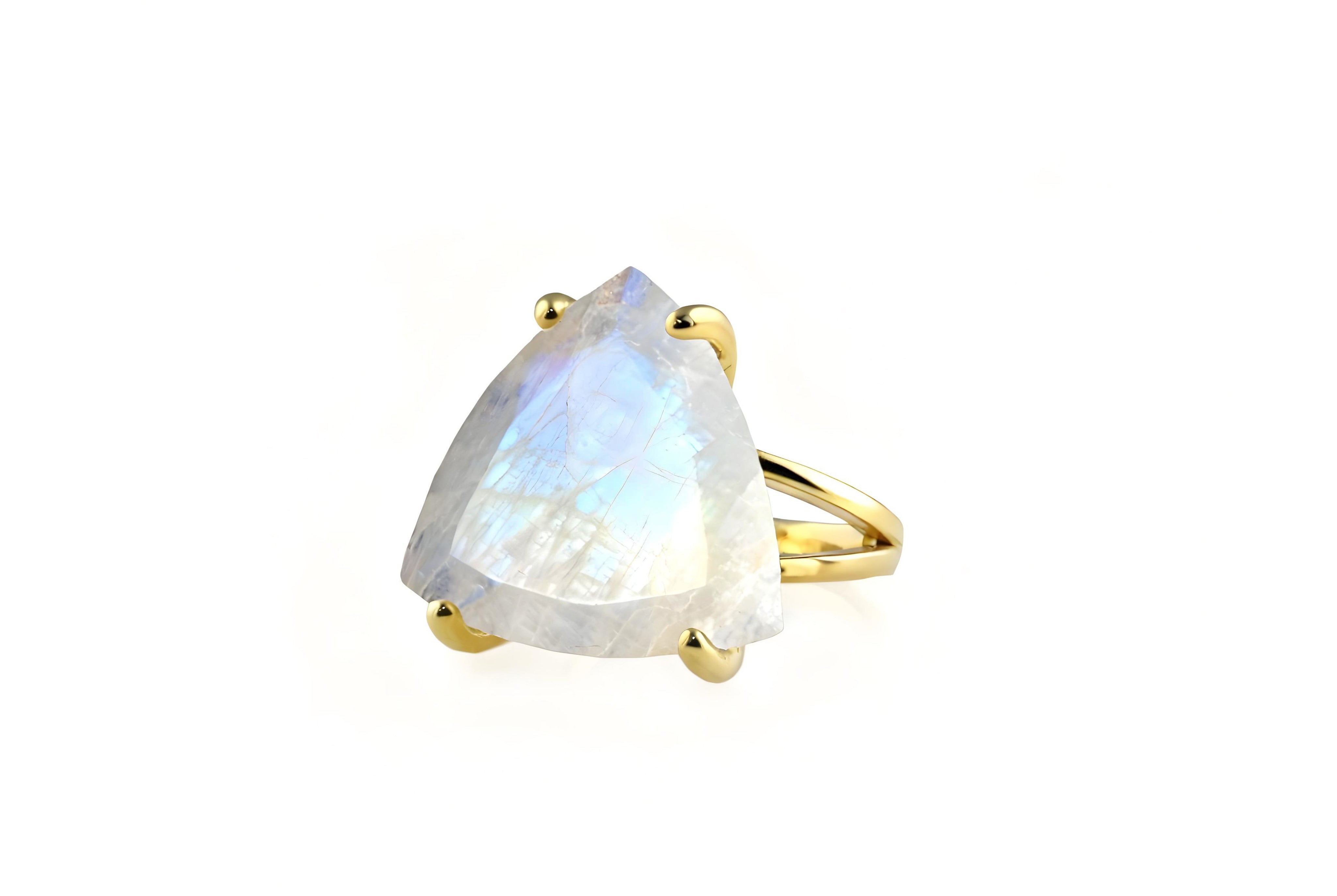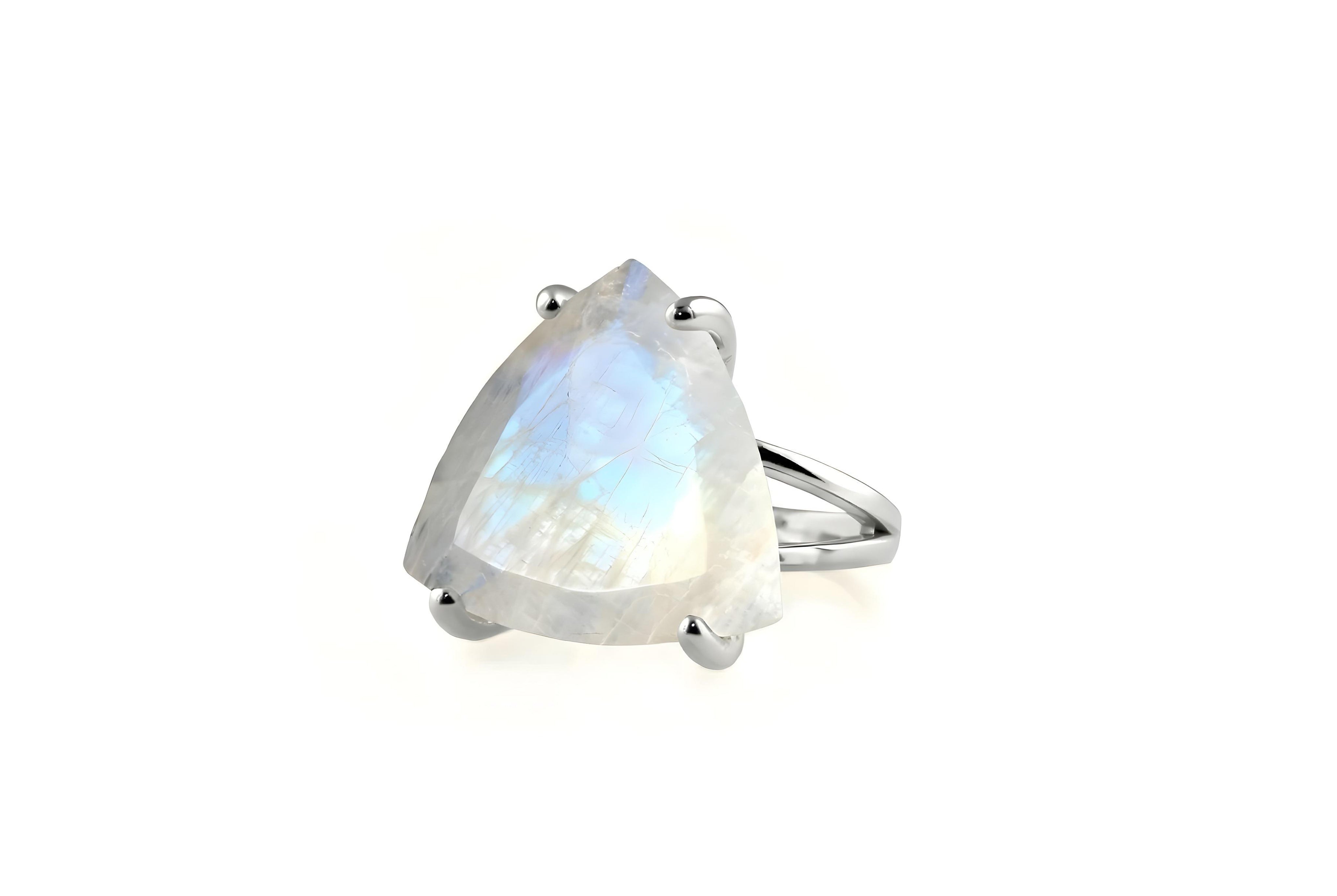 A gorgeous June birthstone ring featuring a trillion-cut Rainbow Moonstone pronged in a 925 sterling silver double band. Designed for comfort and everyday elegance, this silver jewelry for women pairs effortlessly with any outfit and style. Beautiful and eye-catching, this Moonstone jewelry piece invites you to awaken the moonchild within.