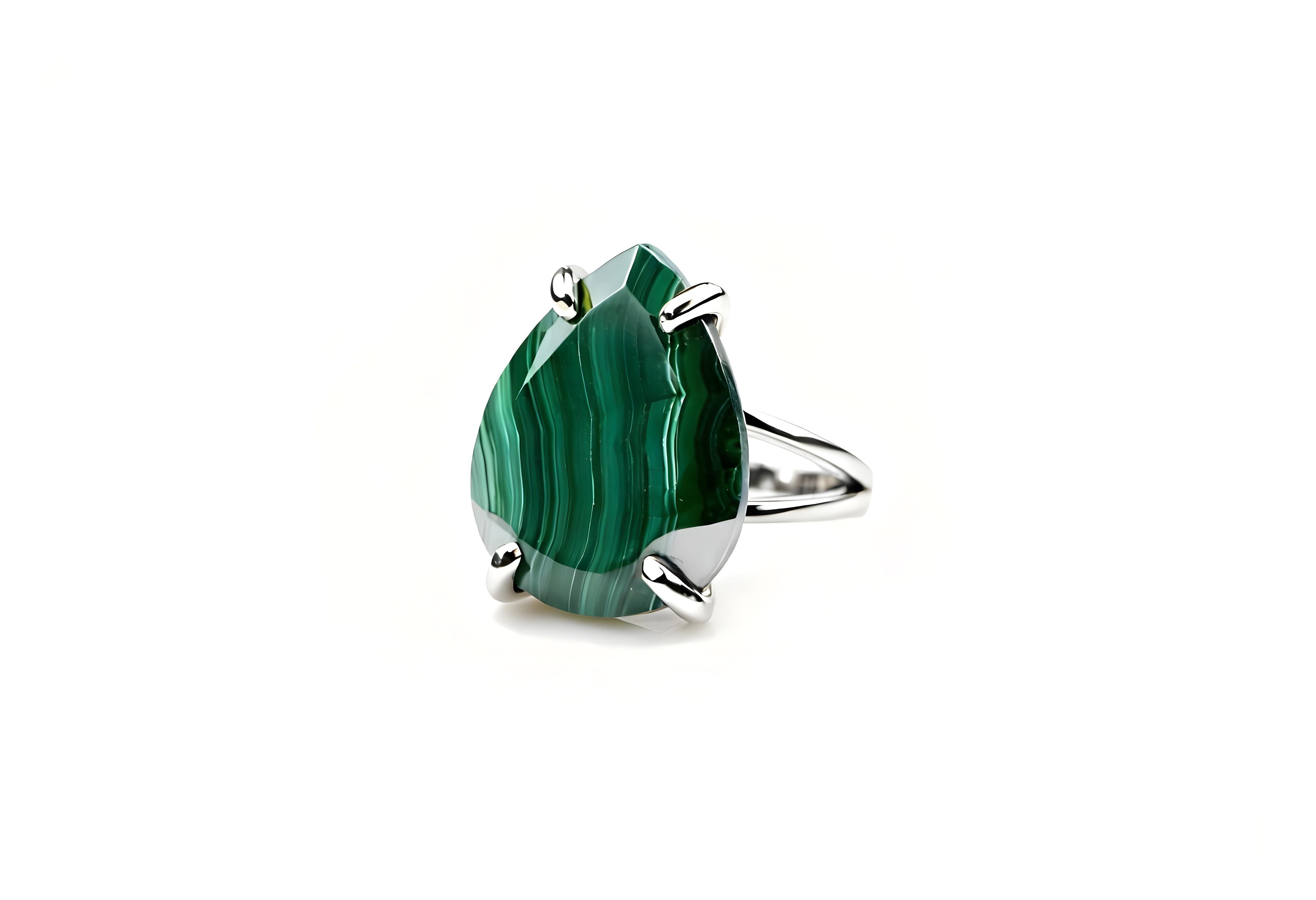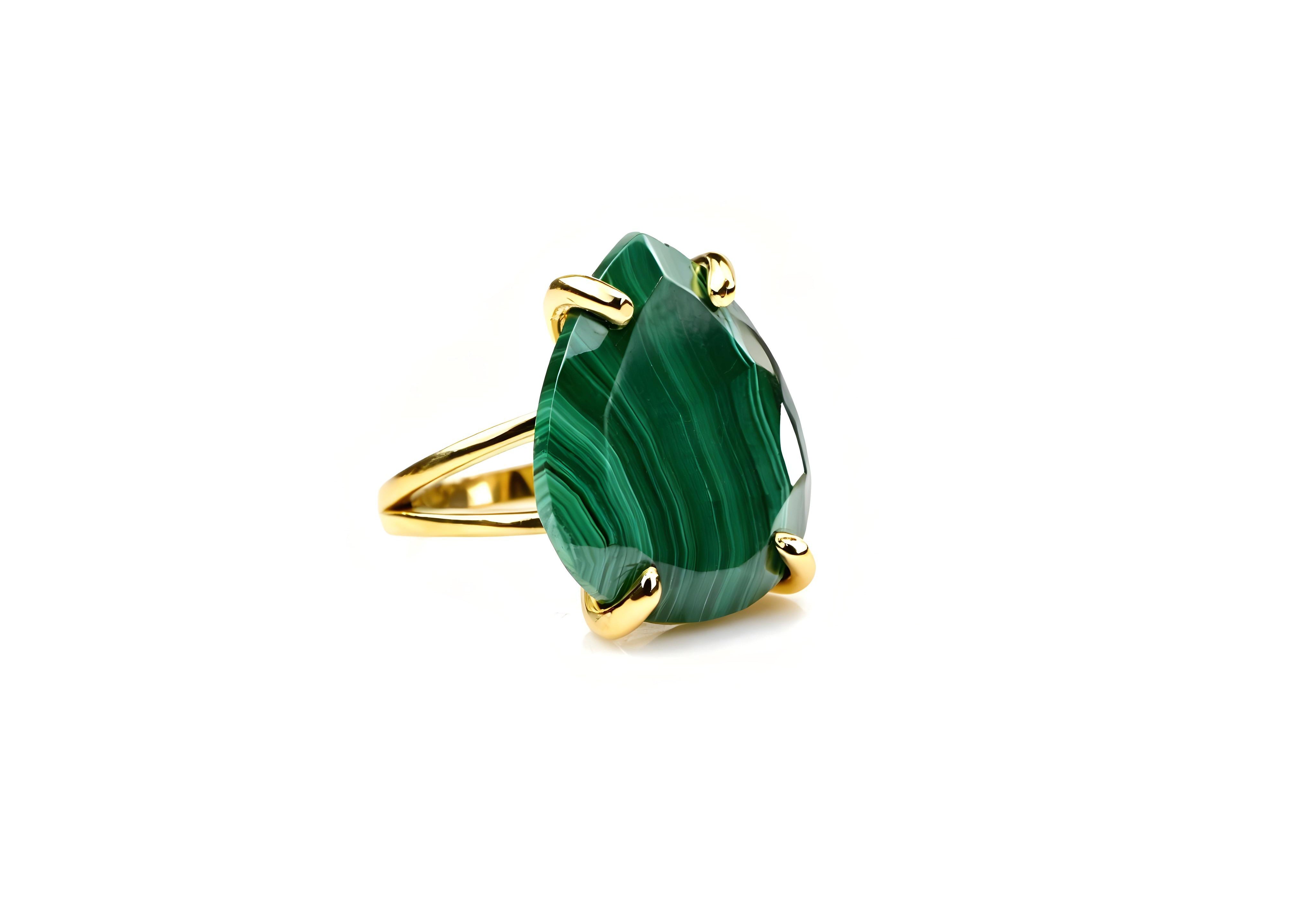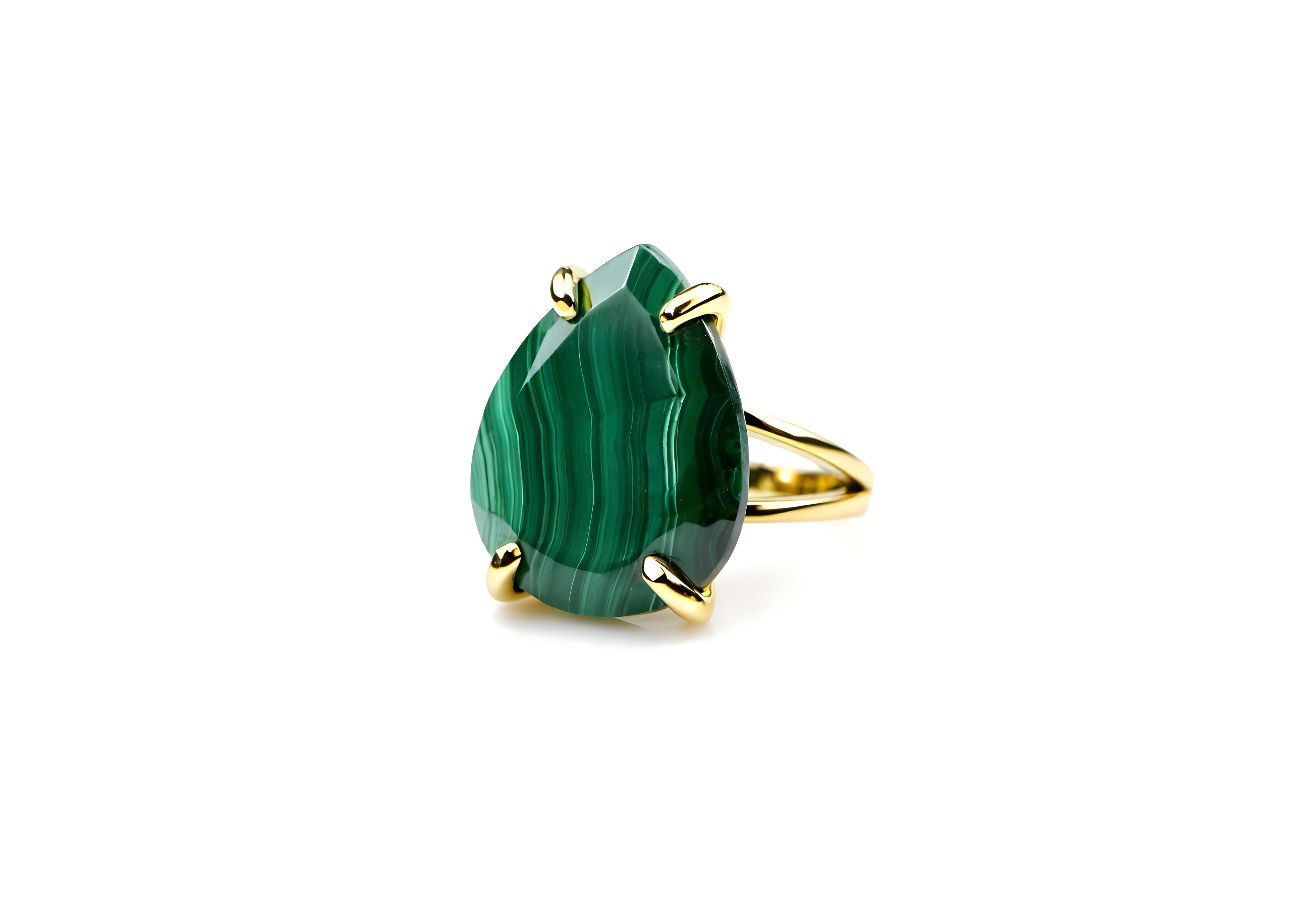 This pear-cut malachite ring brings a deep green glow and a feminine teardrop silhouette. The smooth band and lustrous gold finish highlight the natural patterns in the stone, creating a soft and graceful look on the hand. Perfect for everyday wear or for adding a meaningful touch to a dressed-up outfit, this gemstone ring is crafted for women who love colorful, refined jewelry made from semiprecious stones.