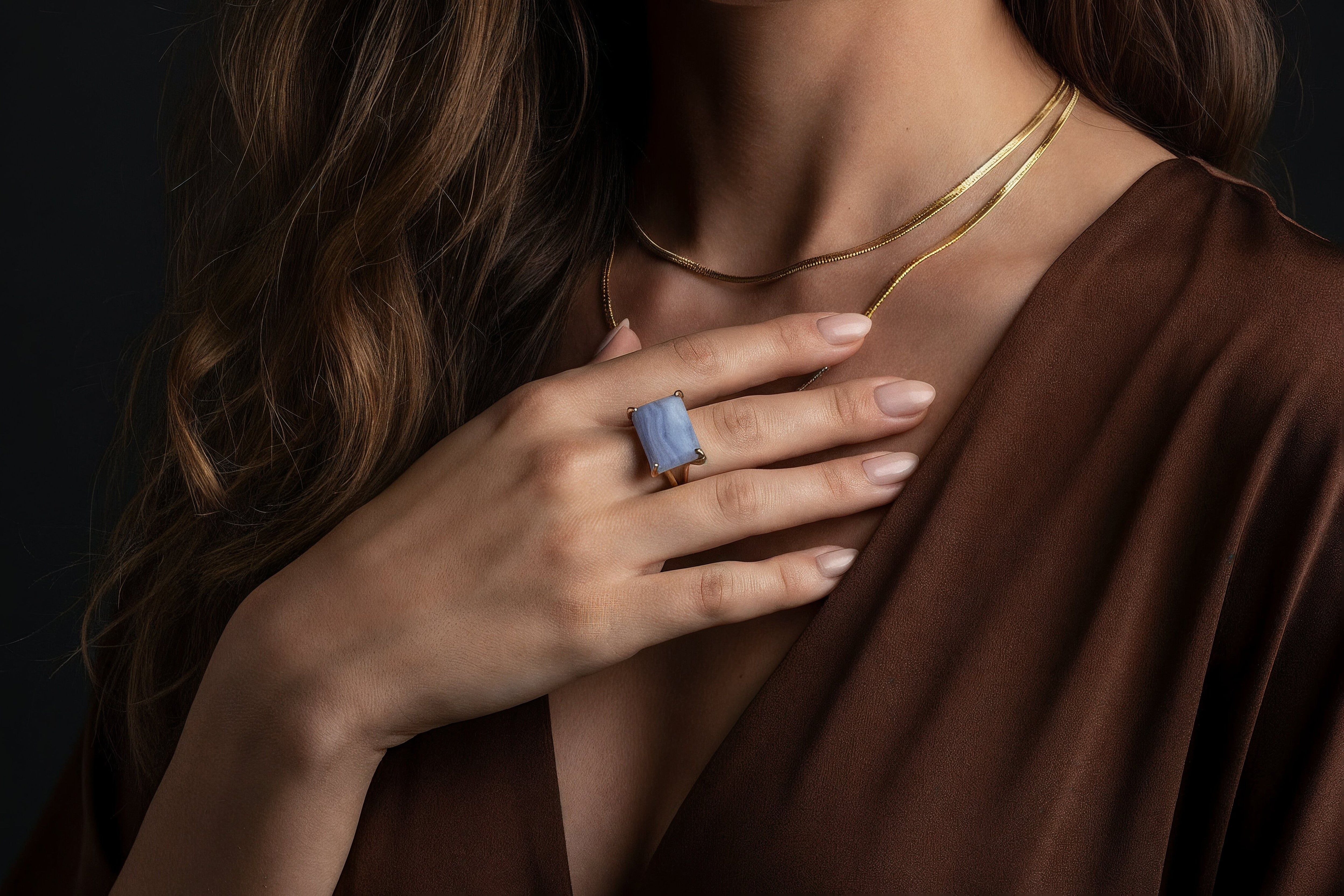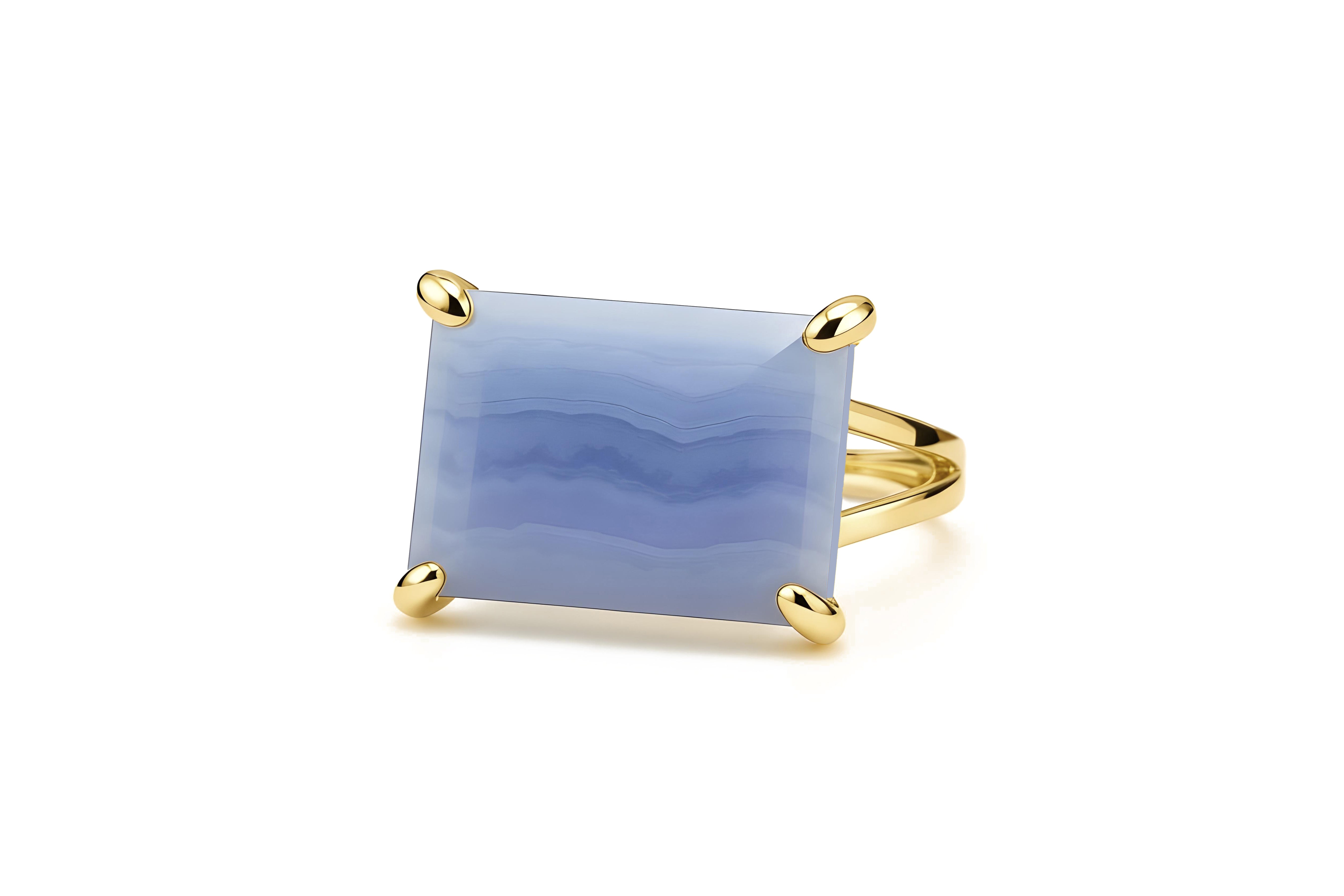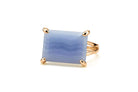 This blue lace agate ring features a rectangular-cut semiprecious gemstone set in a polished rose gold band. The wide prong setting highlights the natural blue banded patterns of lace agate, known as a stone of balance and calming energy. Bold yet elegant, this cocktail ring makes a modern statement while remaining versatile for daily wear. Handcrafted with care, it’s a perfect gemstone ring for women who love both style and meaning.