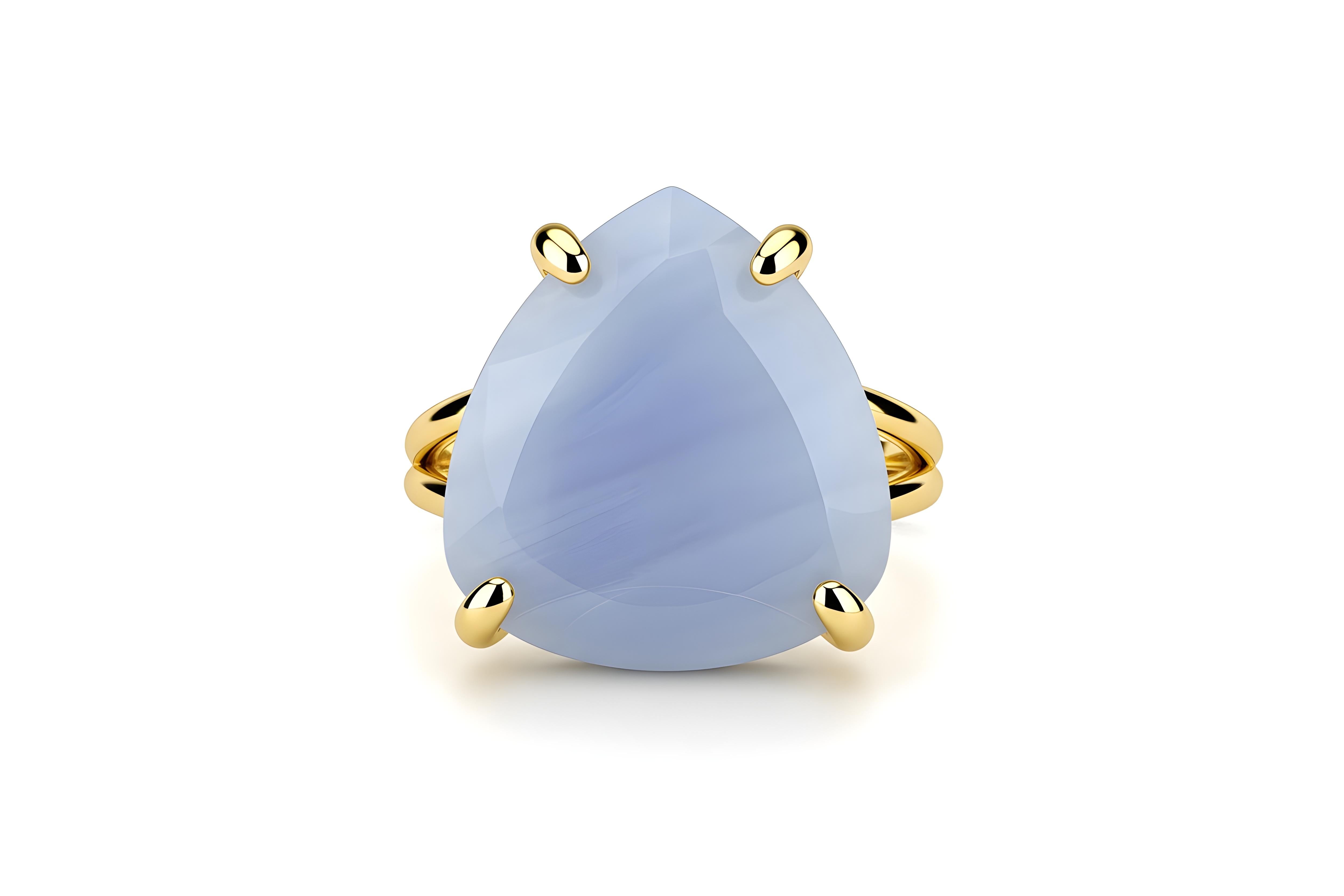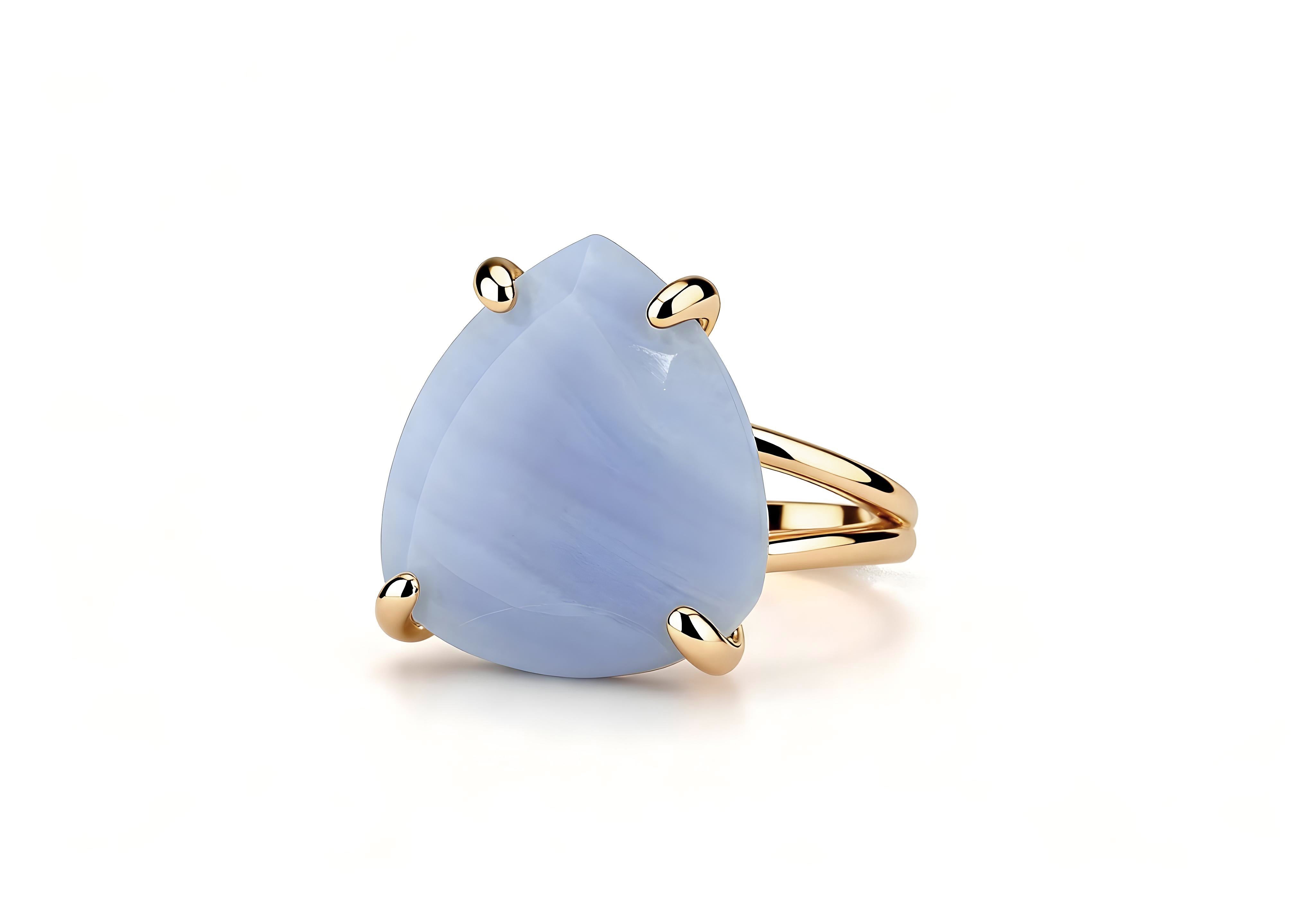 This 14k gold agate ring features a trillion-cut blue lace agate gemstone set in a polished gold band. Known for its soft blue bands and calming qualities, lace agate makes this ring both meaningful and stylish. The trillion cut adds a modern geometric touch, while the semiprecious gemstone brings natural beauty and symbolism. Handcrafted with care, this gemstone ring is perfect as a statement piece, a thoughtful gift, or an everyday accessory.