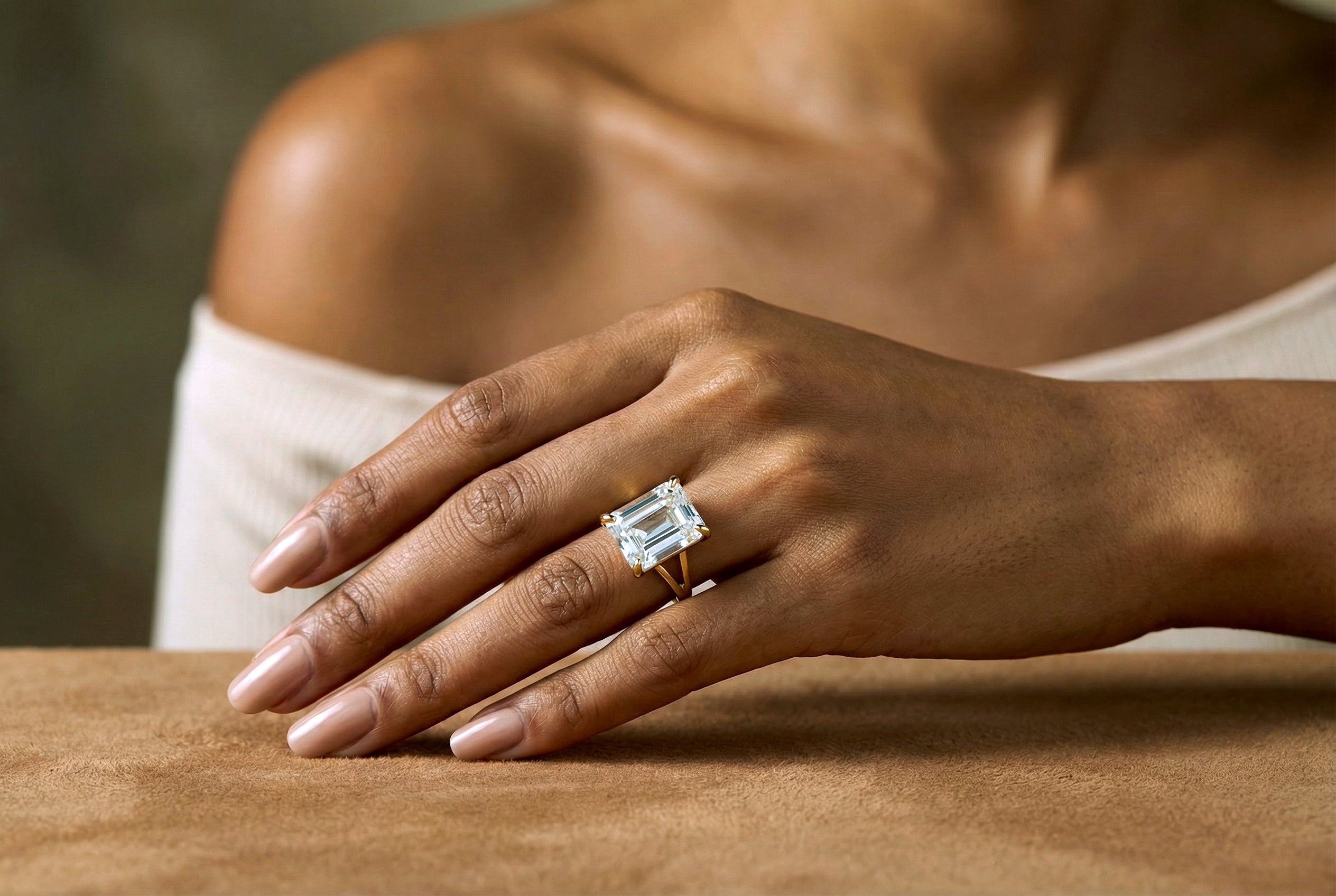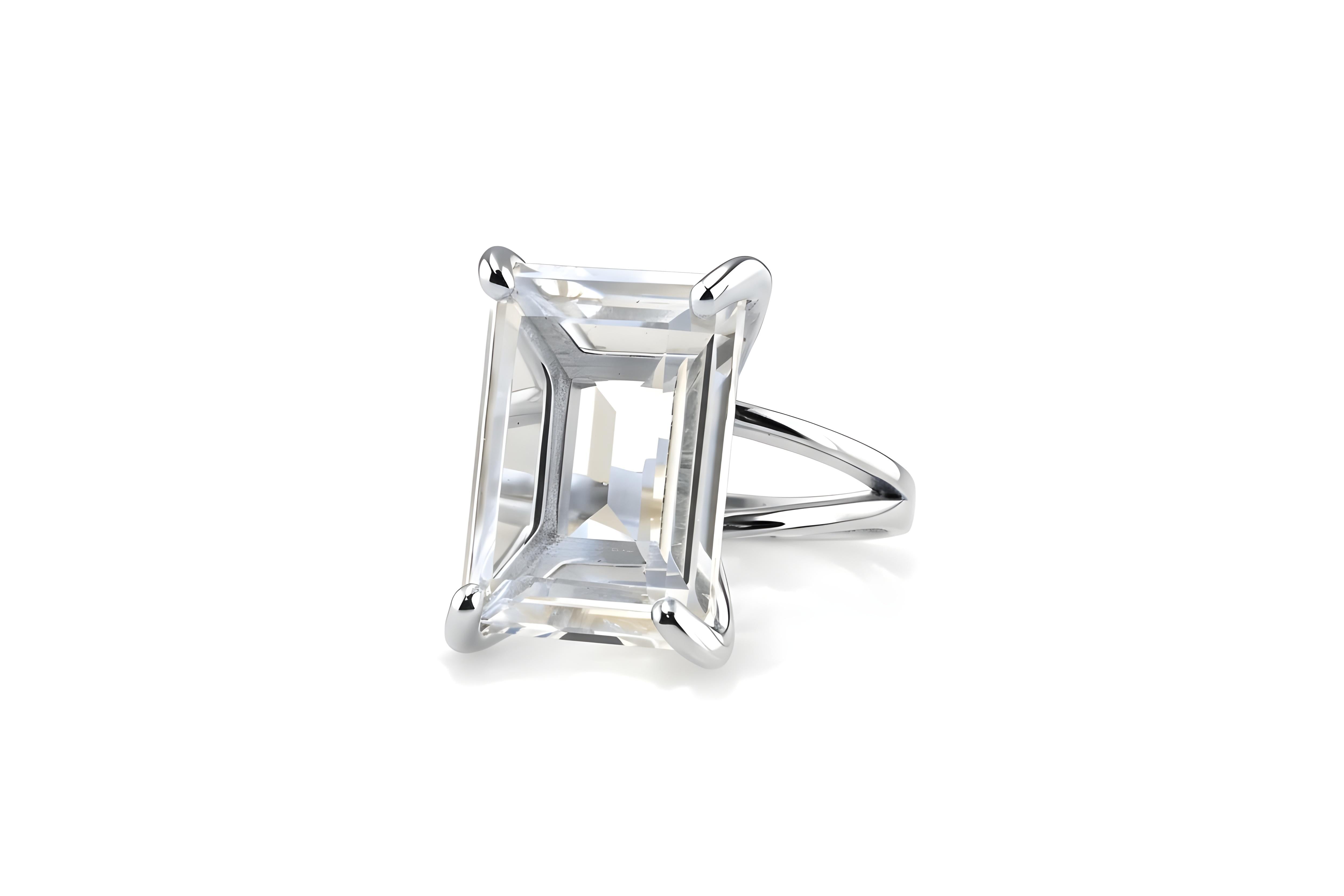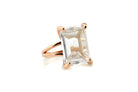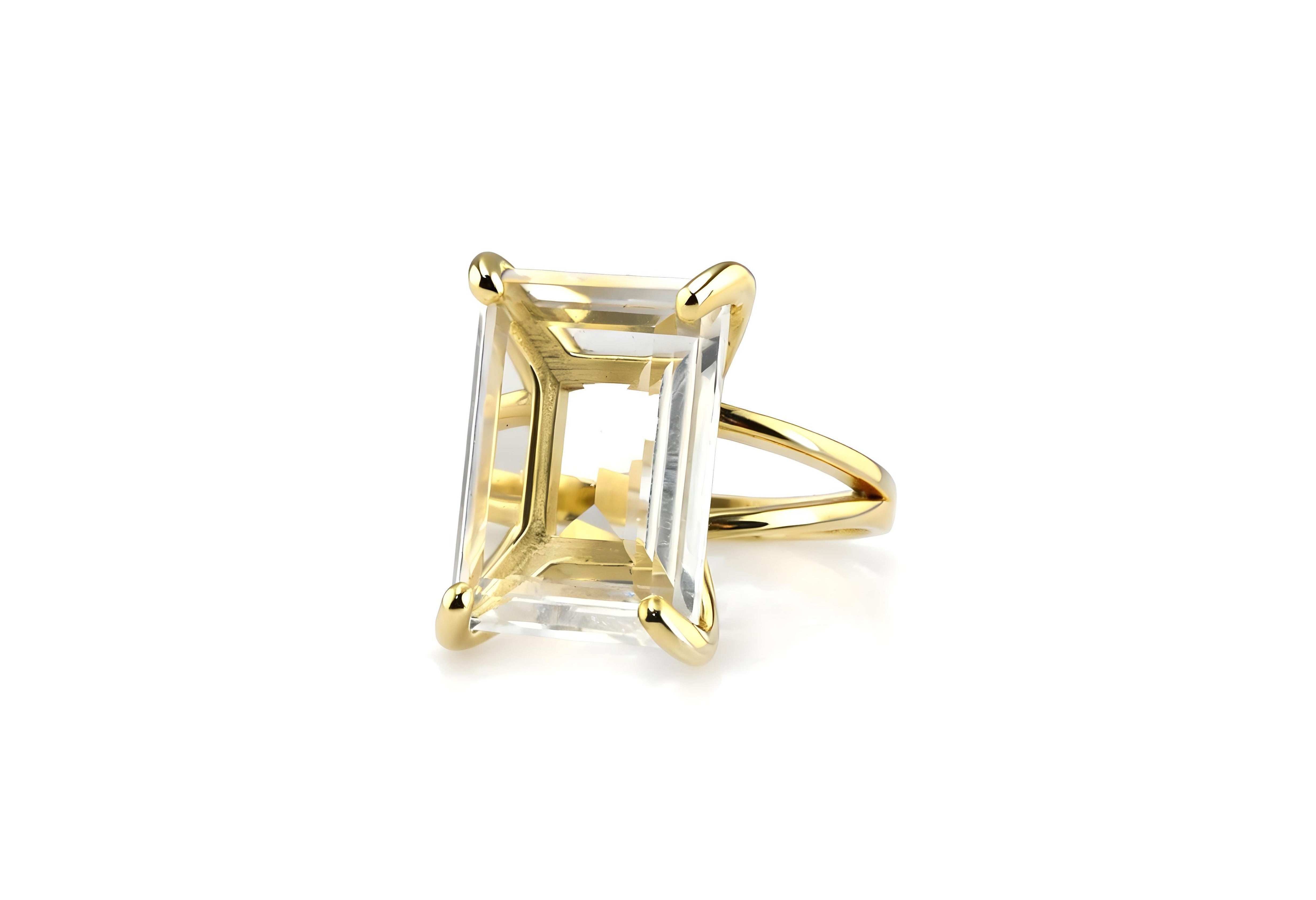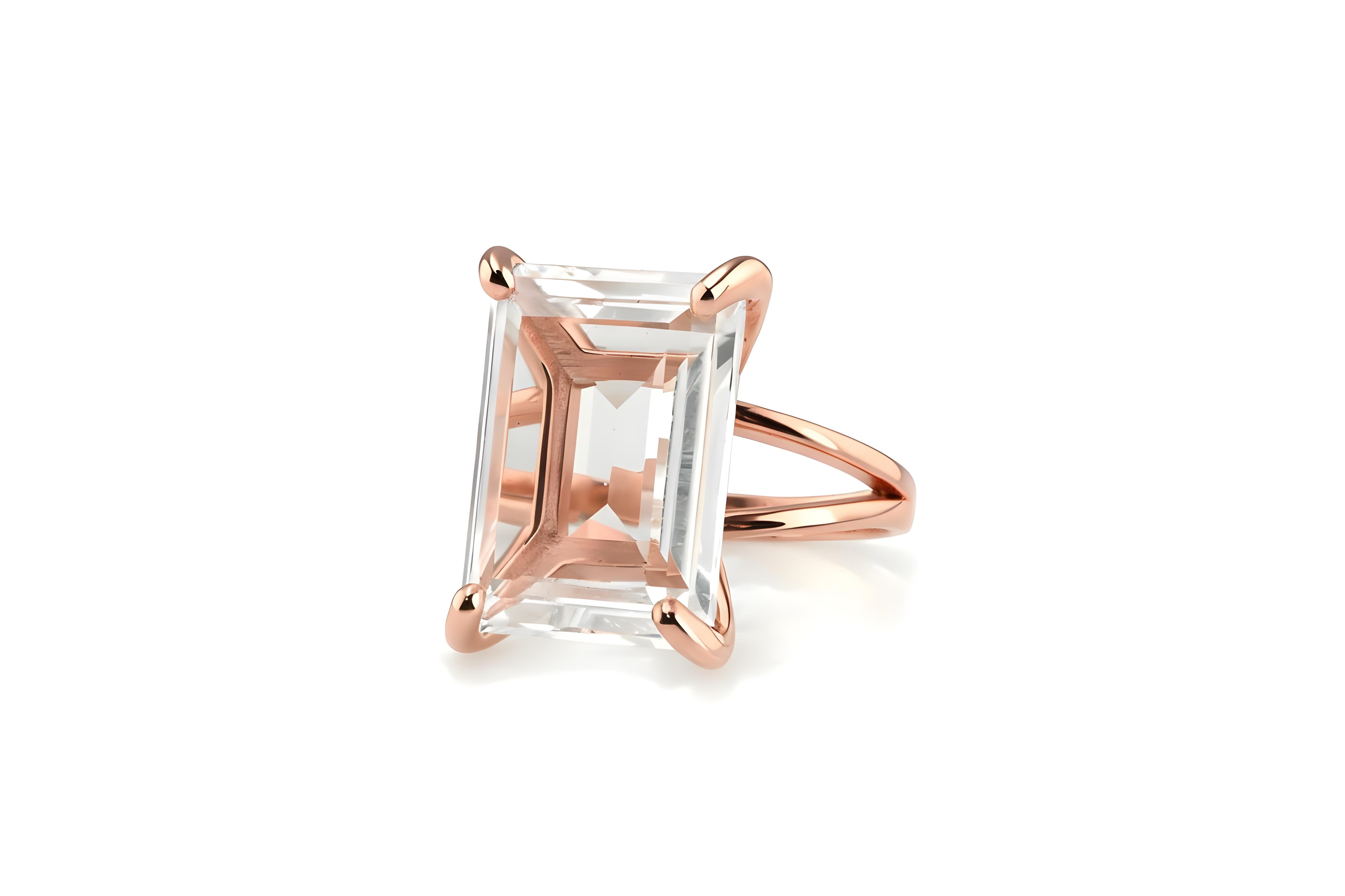 A radiant rectangular Crystal Quartz takes center stage in this lovely rose gold ring. This Quartz ring is a beautiful addition to your fashionable ensembles in any season, offering a touch of luminous charm. A worthy keepsake and a wonderful cocktail ring gift for someone dear, it’s a piece designed to be cherished and admired.