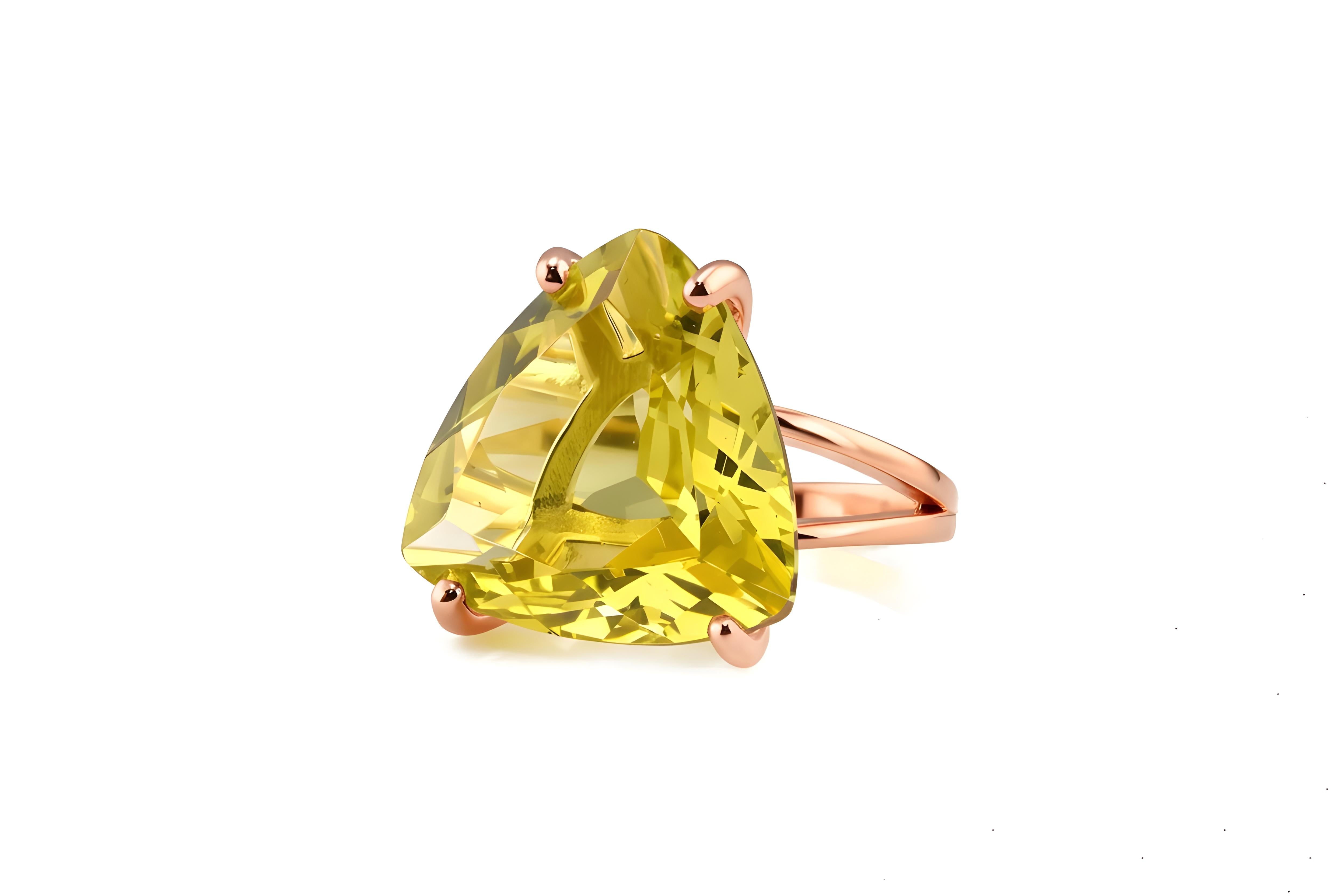 Bring a brilliant touch to your look with this handmade jewelry for women. This 14k rose gold ring centers a prong-set Lemon Quartz that radiates color and light. A fashion-forward statement ring, perfect for styling with stacking rings or pairing with other matching Quartz pieces for a complete, elevated look.