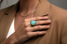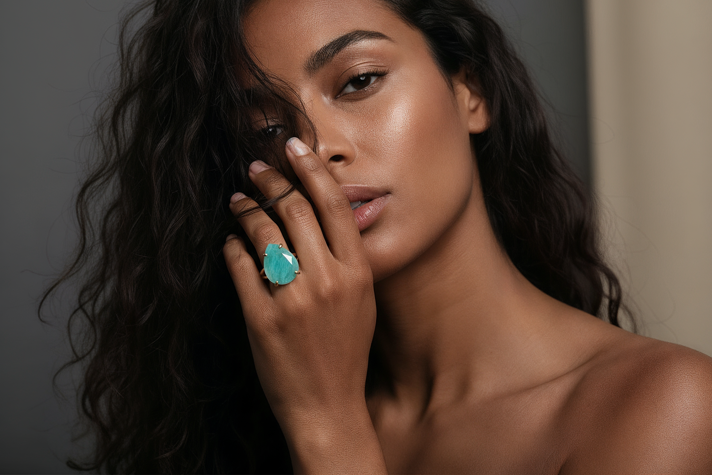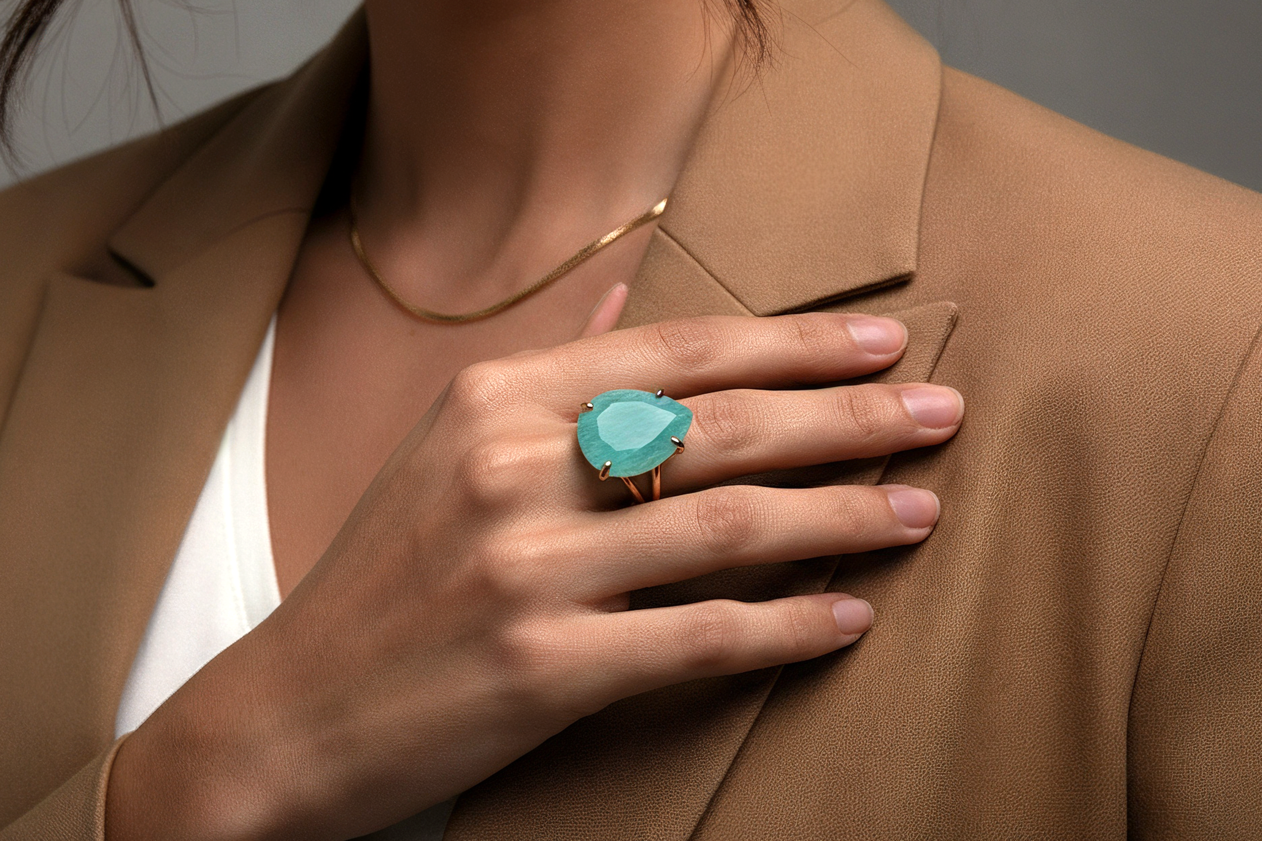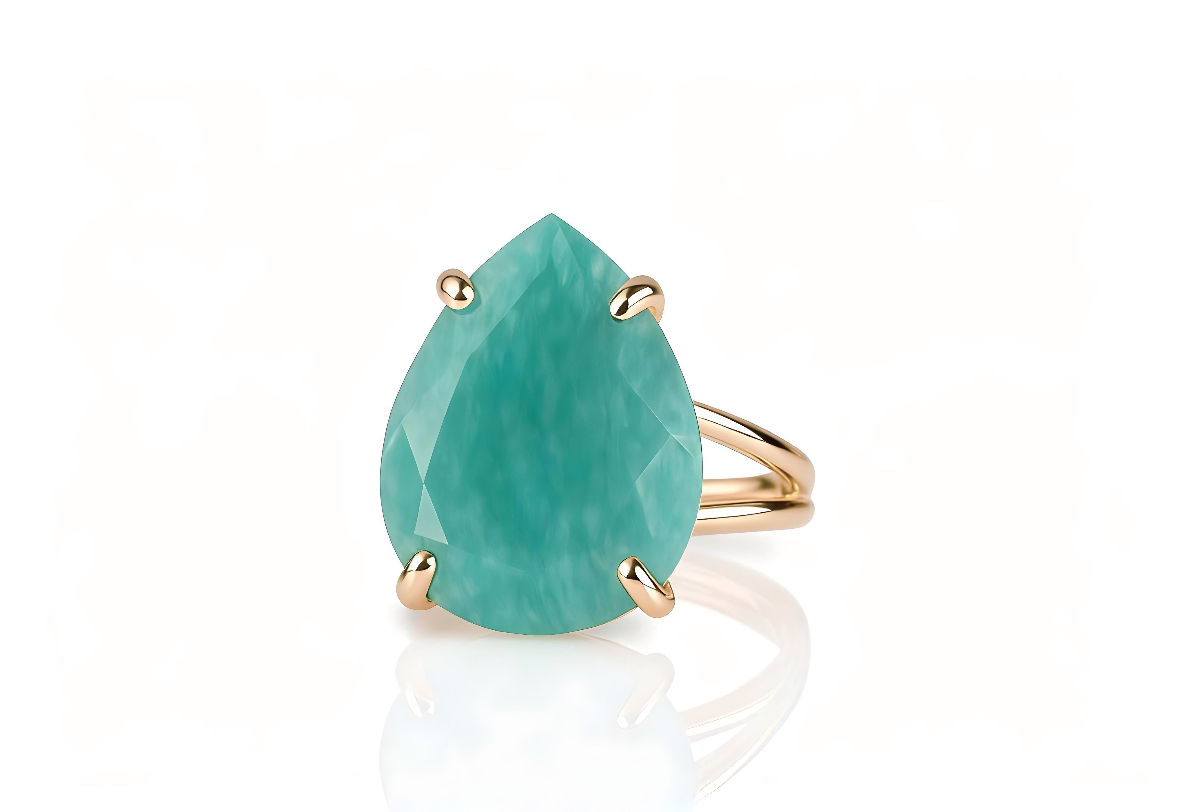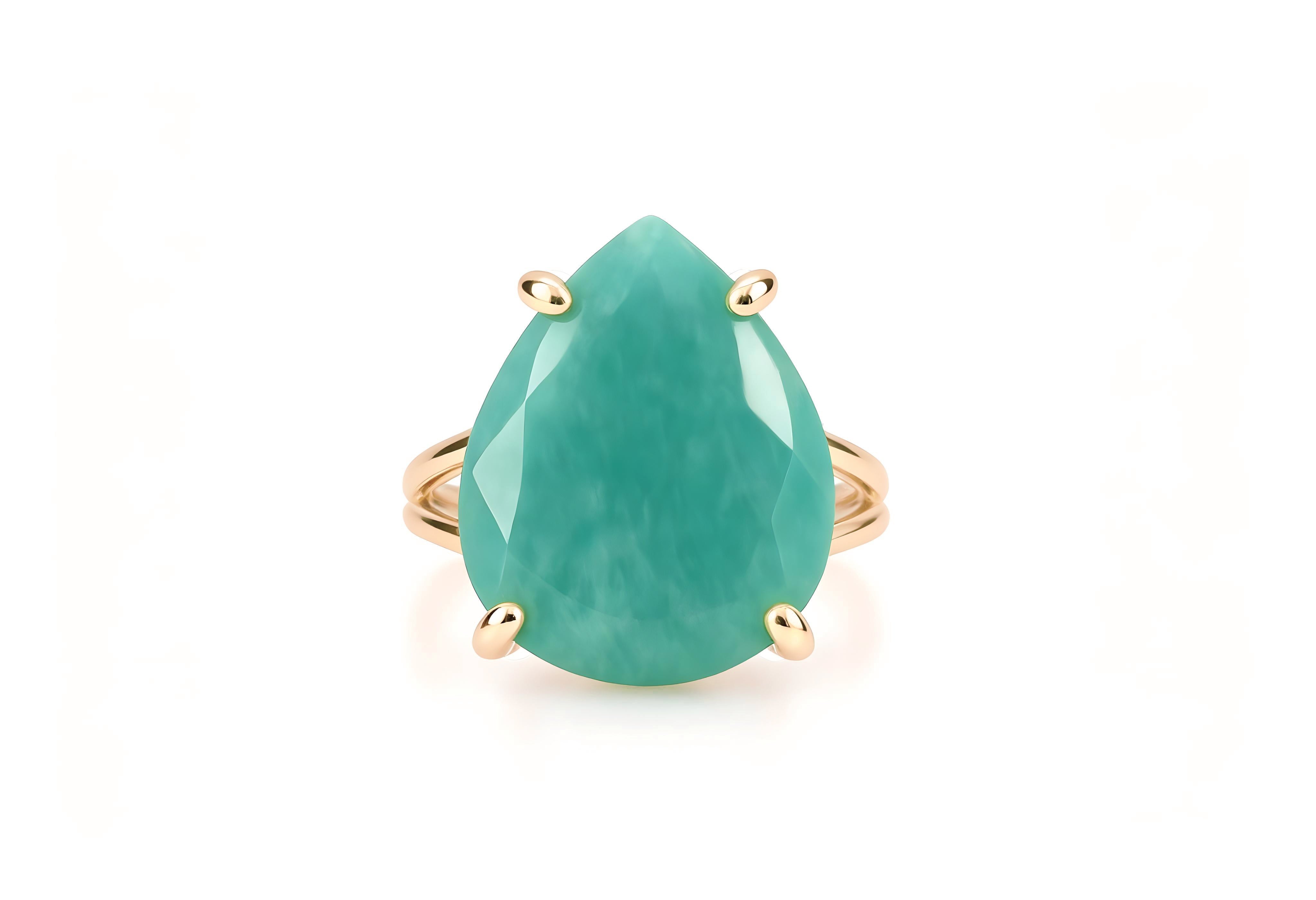 This Amazonite teardrop ring shines with a tranquil blue-green gemstone set in polished 14k rose gold. Its pear-cut shape and prong setting highlight the stone’s natural beauty, offering a refined and graceful look for any occasion. Each ring is handmade and customizable in any metal or size, making it a meaningful gift or a special addition to your personal collection.