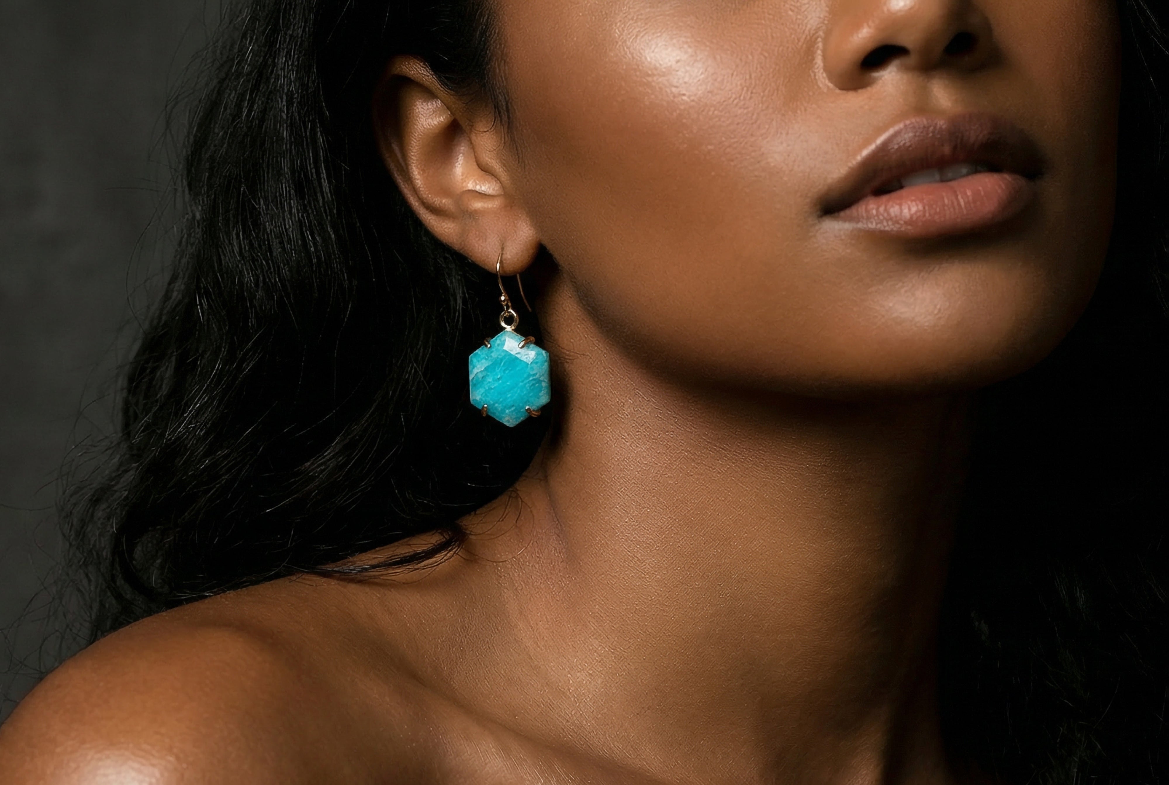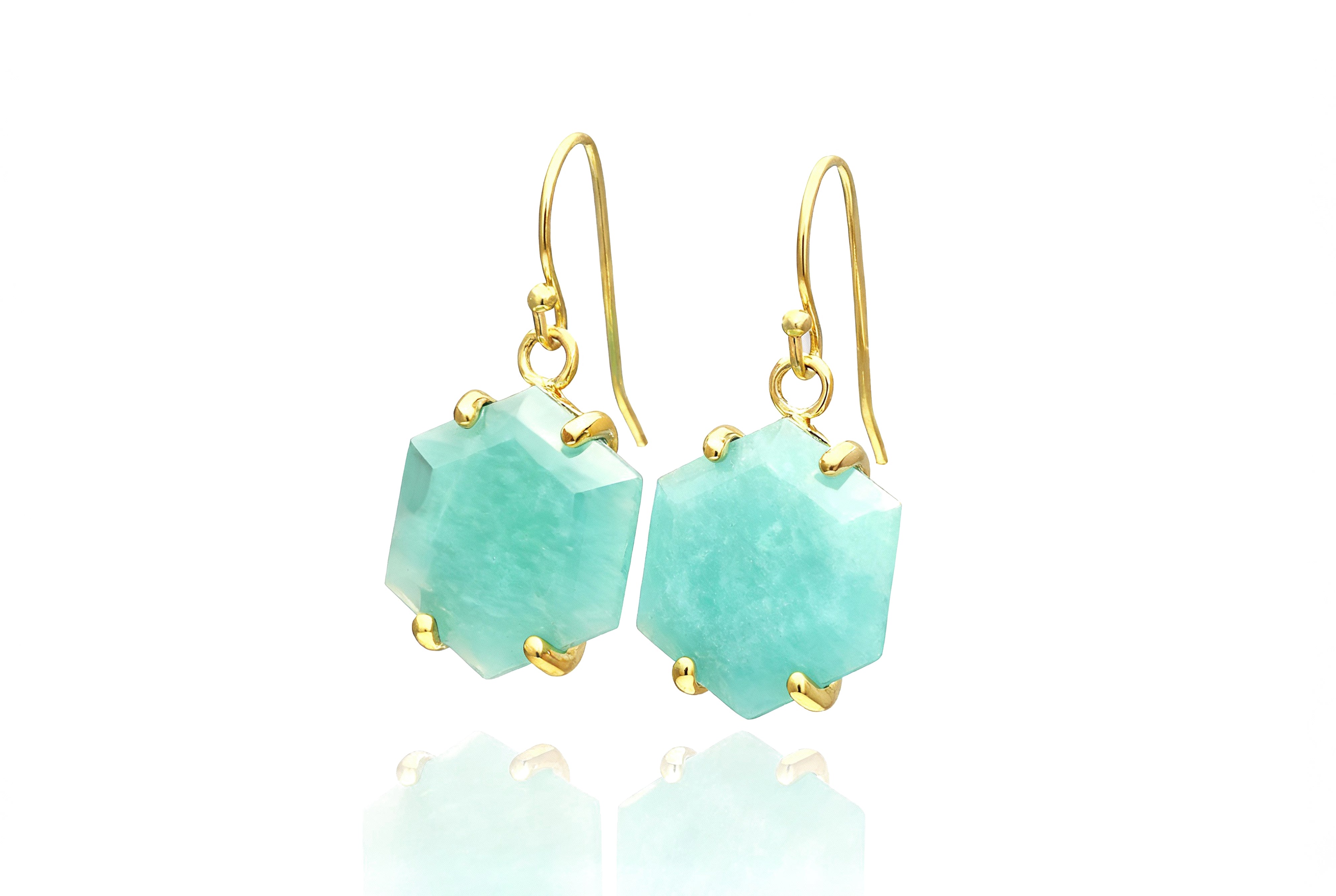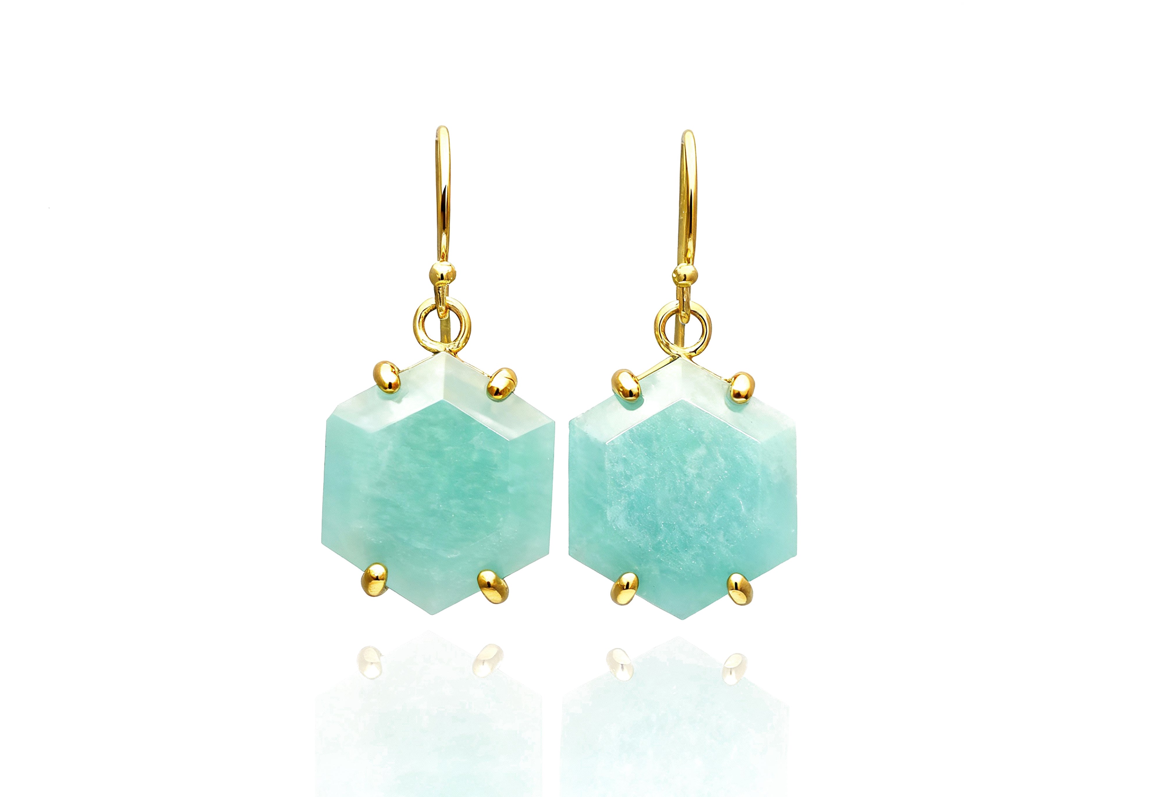 Hexagon Shape Amazonite Gold Dangle Earrings