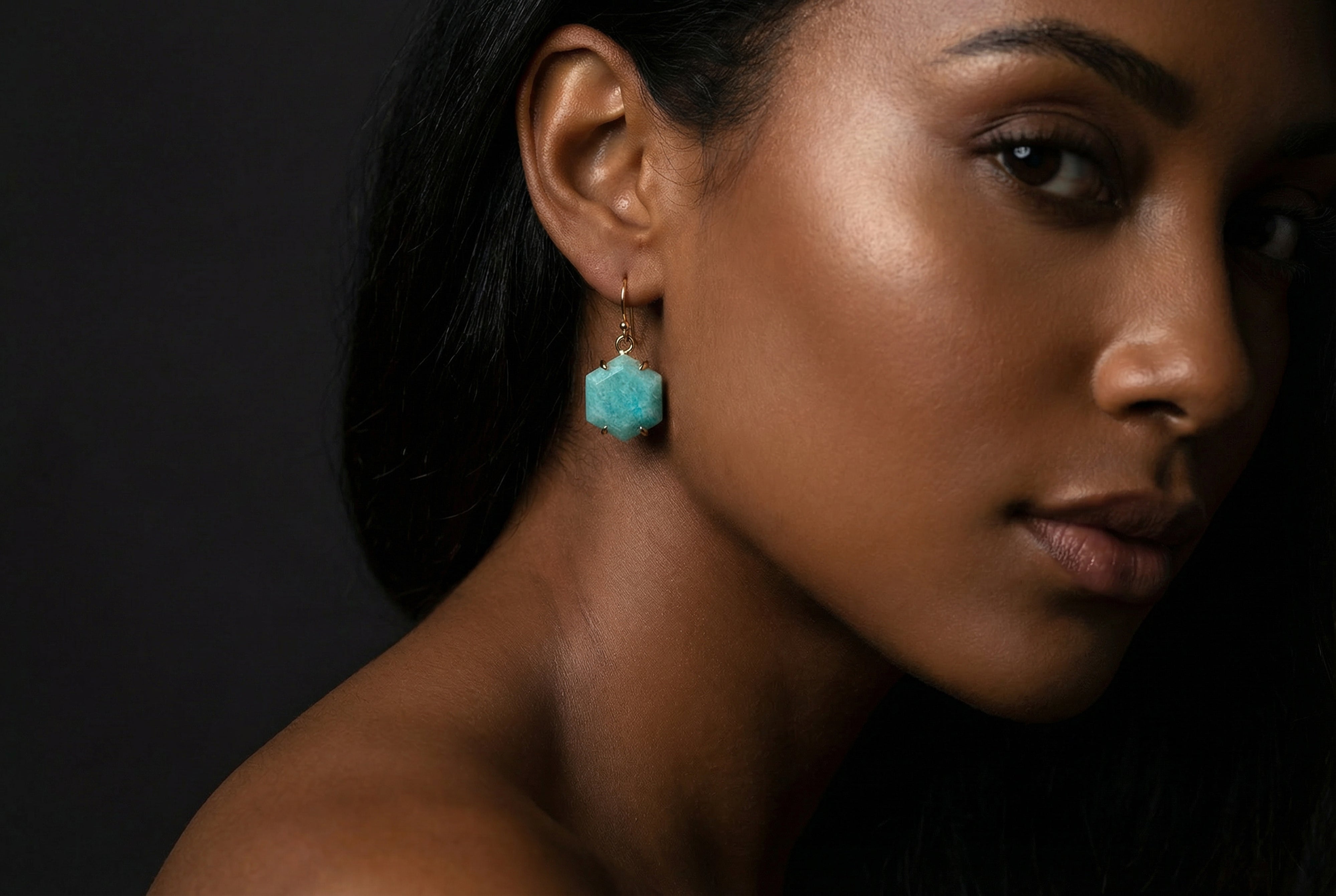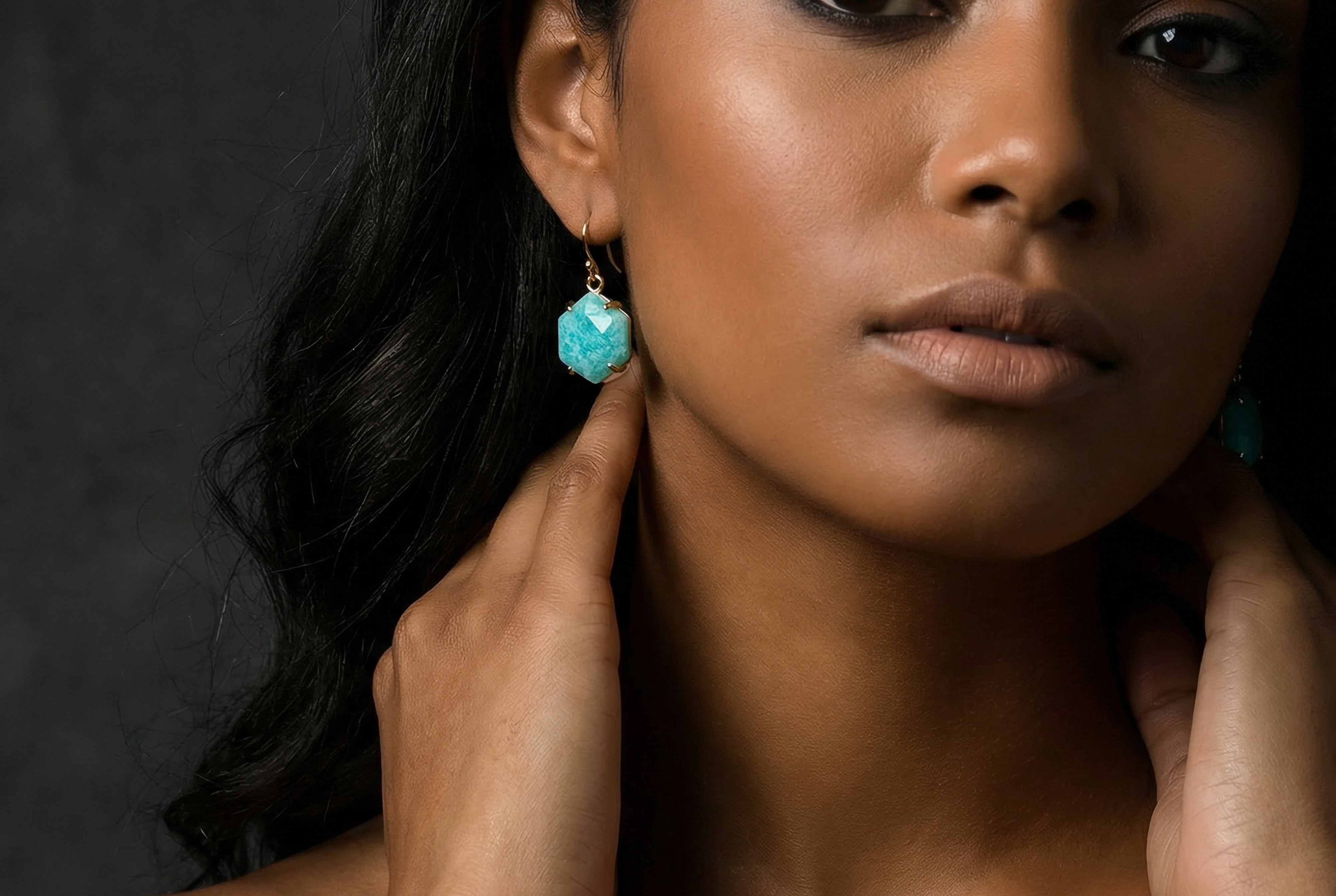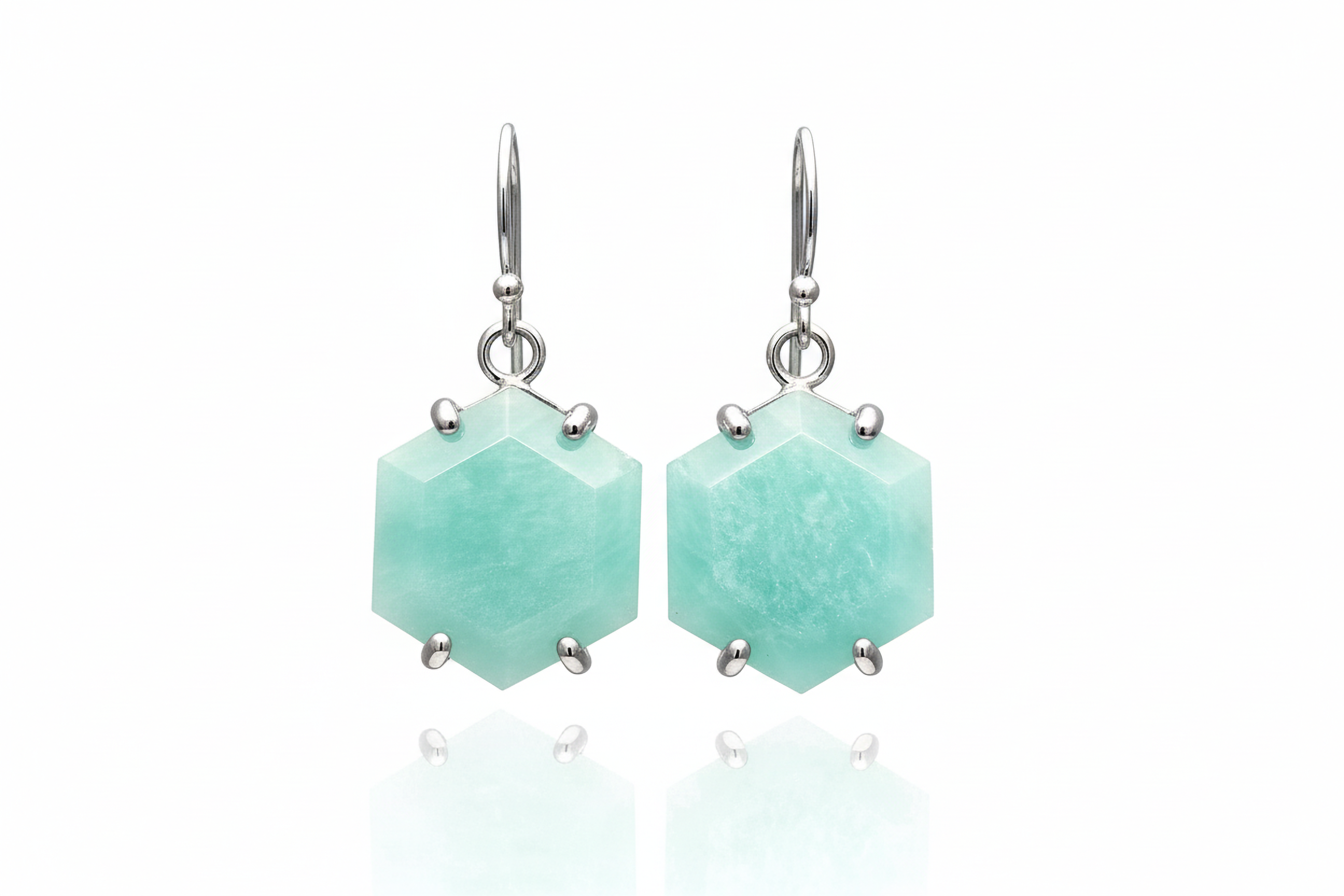 Hexagon Shape Amazonite Gold Dangle Earrings