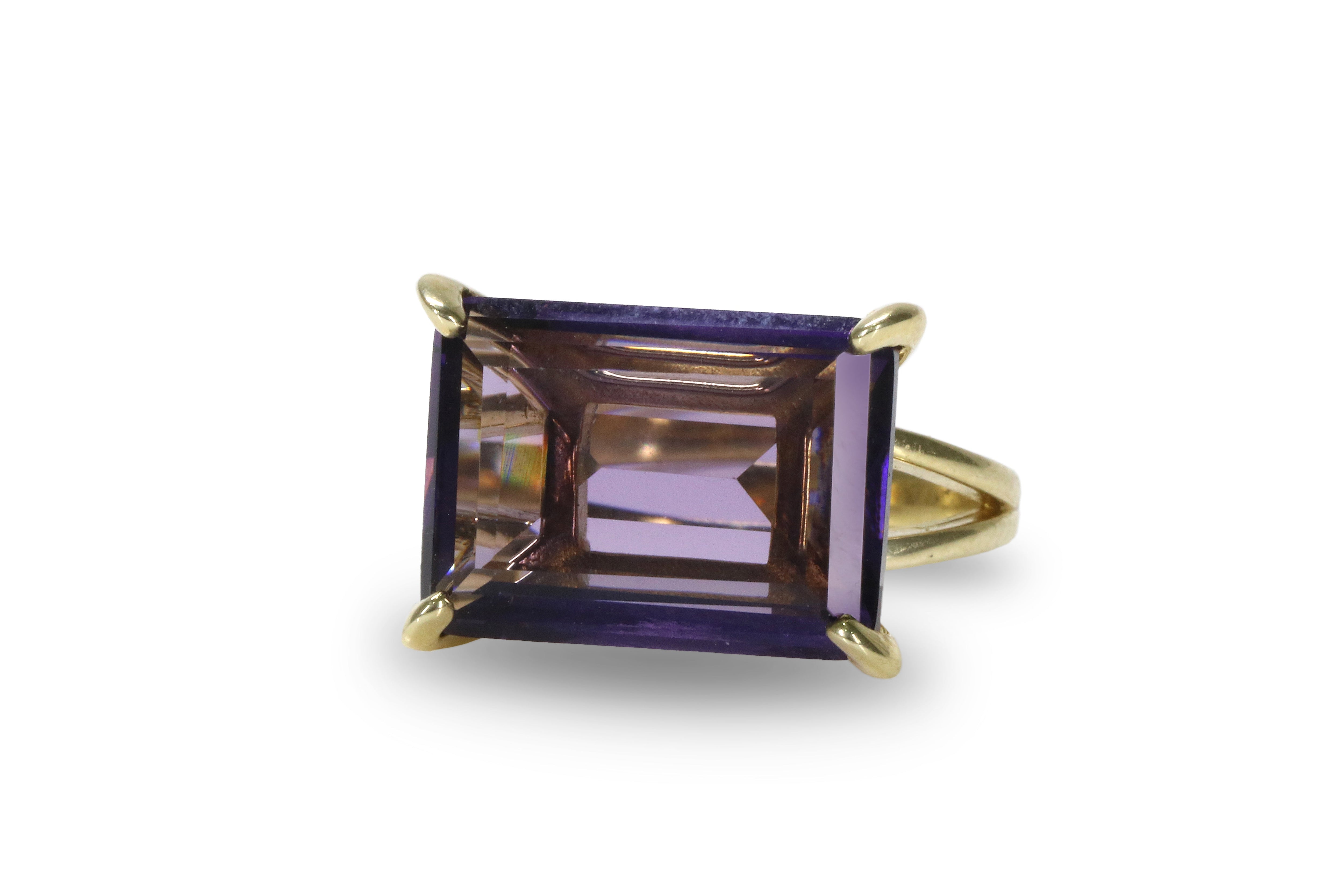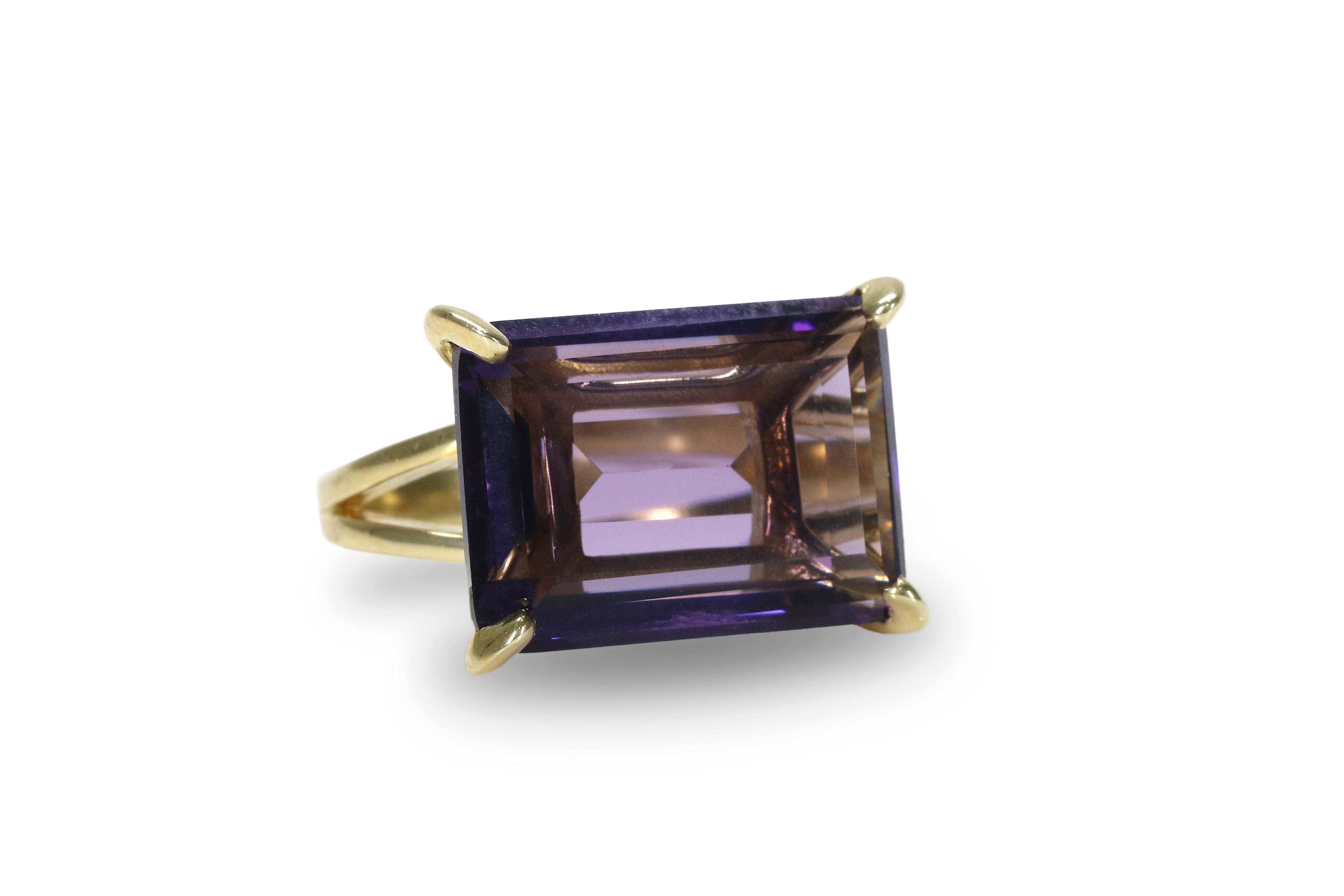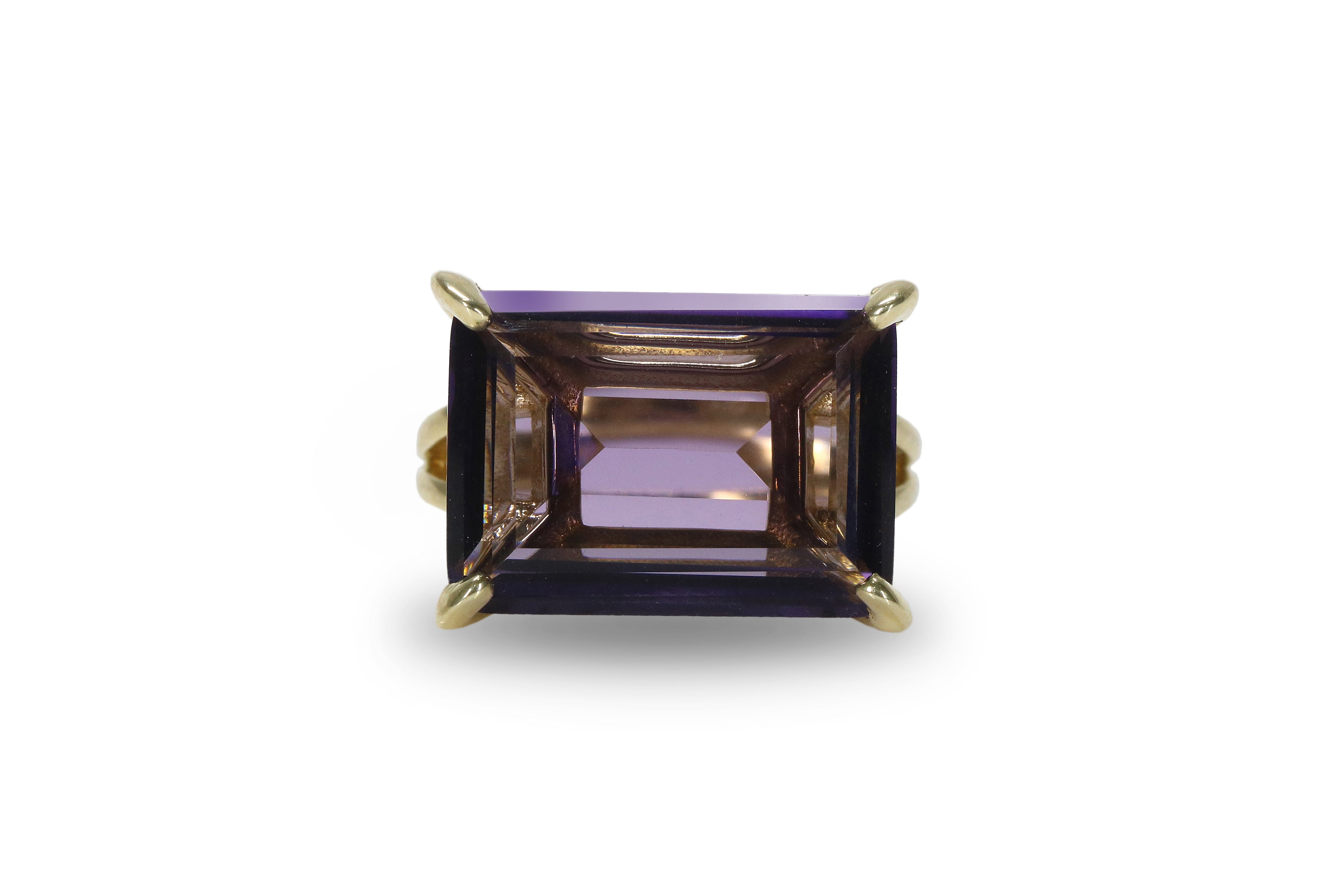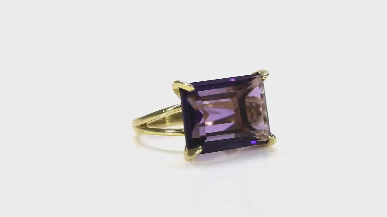 This handcrafted 14k gold ring showcases a radiant rectangular-cut amethyst, symbolizing balance and inner strength. The rich purple gemstone reflects the spirit of February’s birthstone, enhanced by the warm glow of gold. Its minimalist yet bold design makes it a perfect statement ring for daily wear or special occasions, embodying timeless sophistication and harmony.