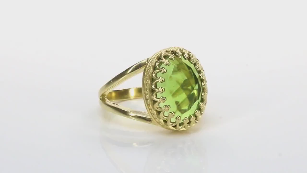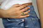 A peridot jewelry for women from Anemone that is stunningly eye-catching. It showcases an oval Peridot sitting in a 14k rose gold-filled band. Peridot jewelry for women can make lovely gifts for your loved ones born in August. But you can always wrap this as a gift any time of the year. This birthstone ring is easy to style and goes perfectly with colors complementing its green stone.