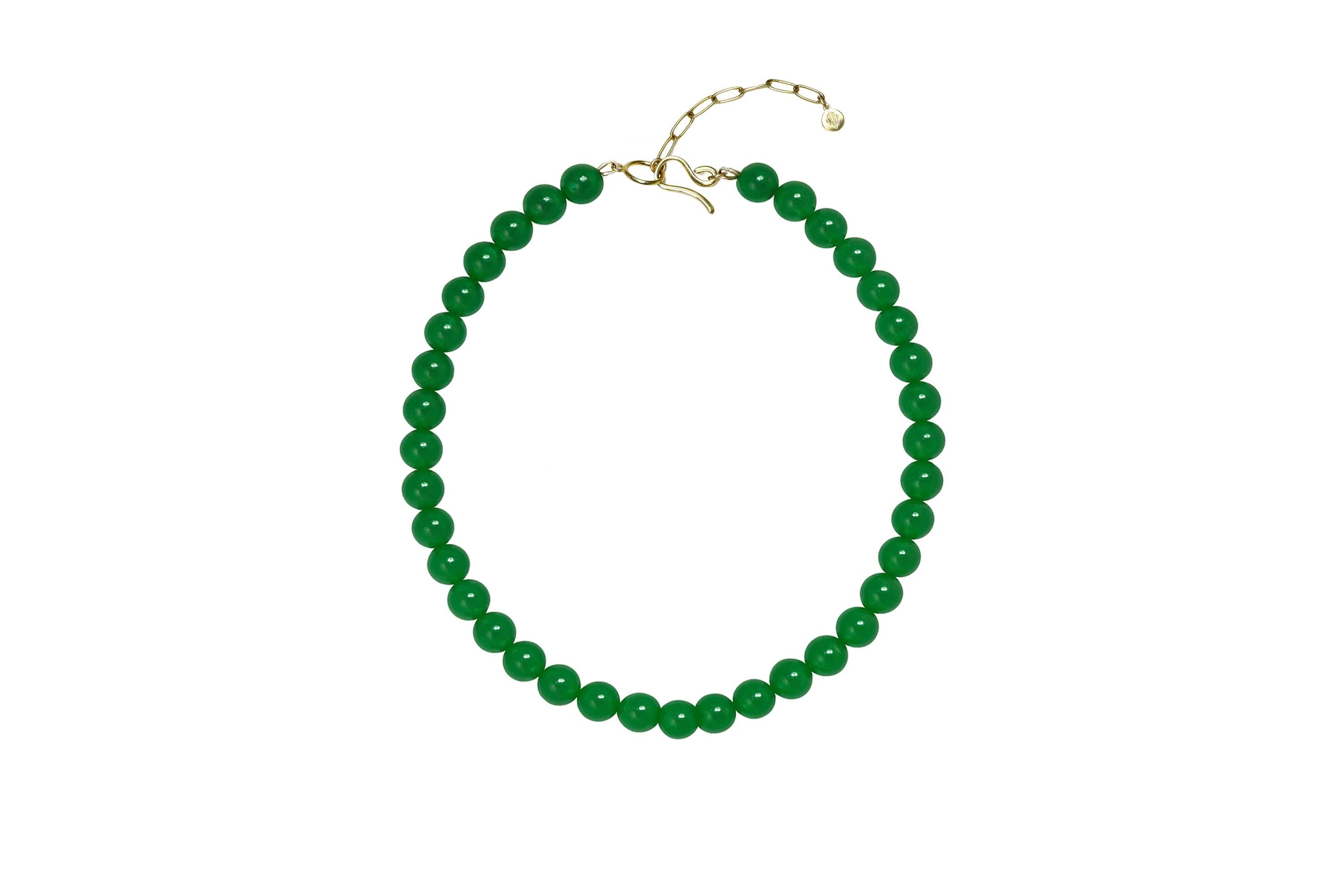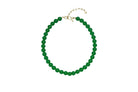 Crafted from smooth, shiny green onyx, this gold bead necklace offers a vibrant pop of color and refined style. The round semi-precious stones are strung into an adjustable strand, making it perfect for wearing as a choker or layering with other pieces.