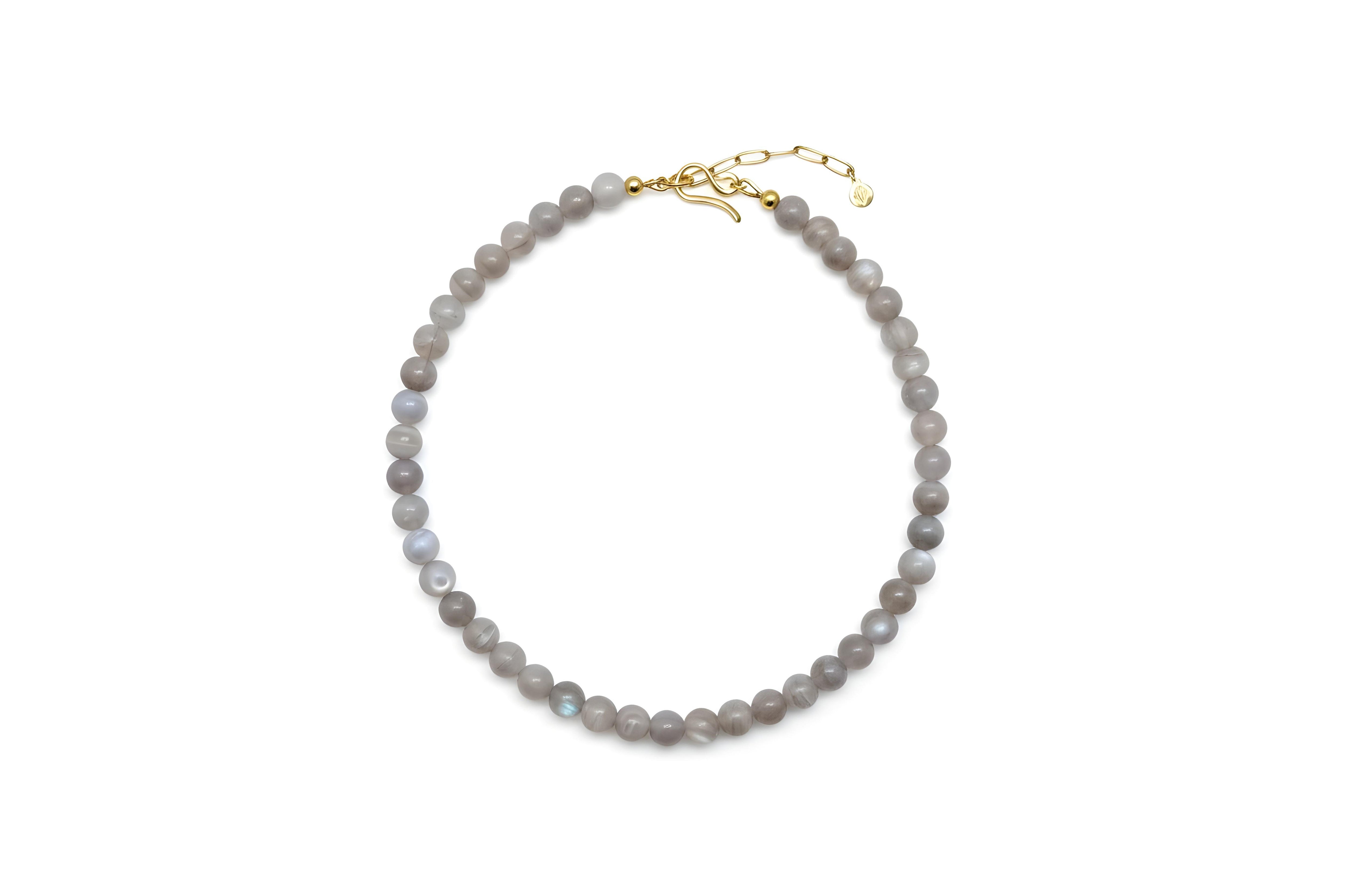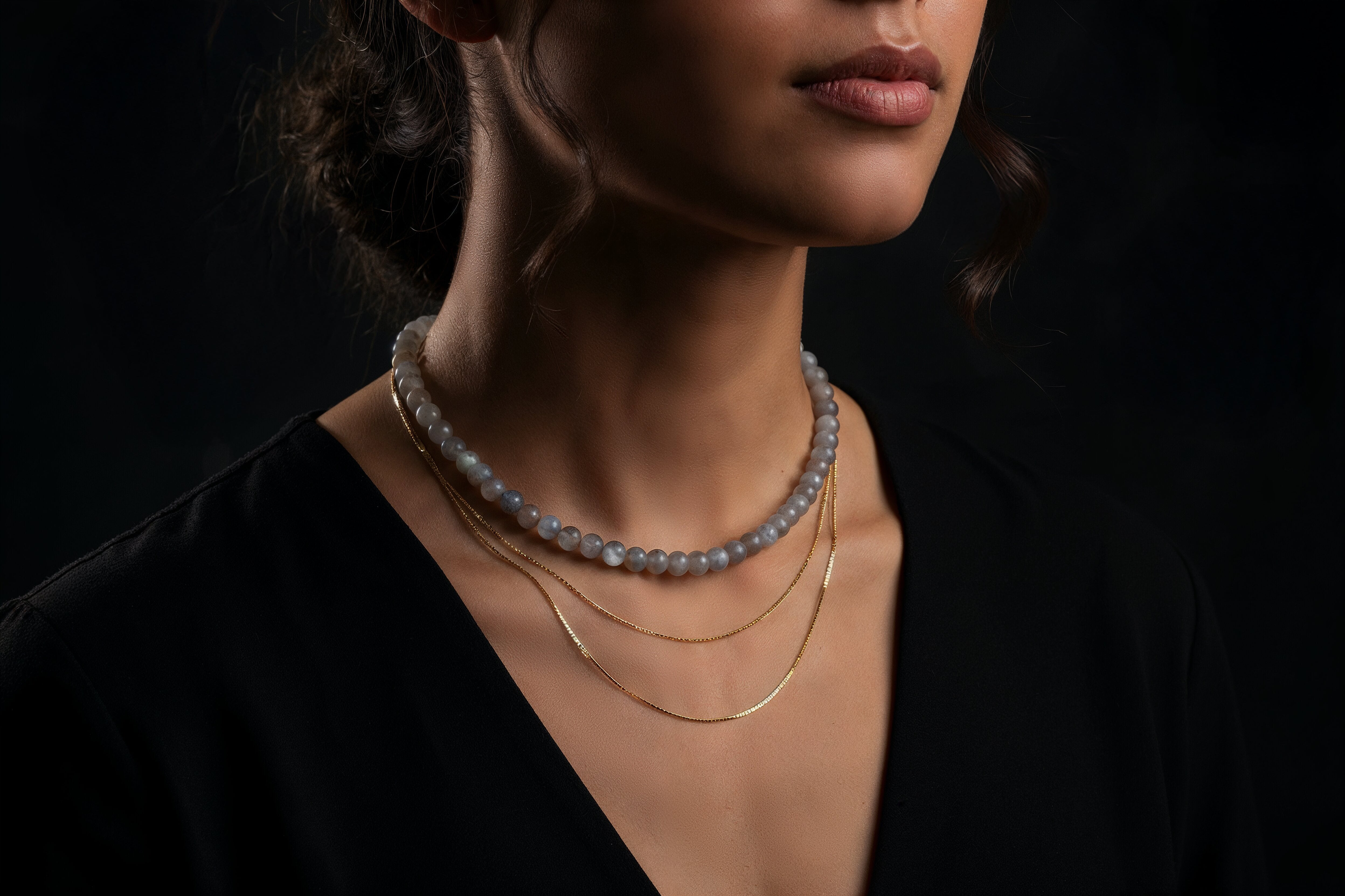 This labradorite gemstone beaded necklace features smooth, round semi-precious stones with flashes of blue and green that shift beautifully in the light. Each bead is knotted by hand and finished with a gold clasp, offering both durability and elegance.