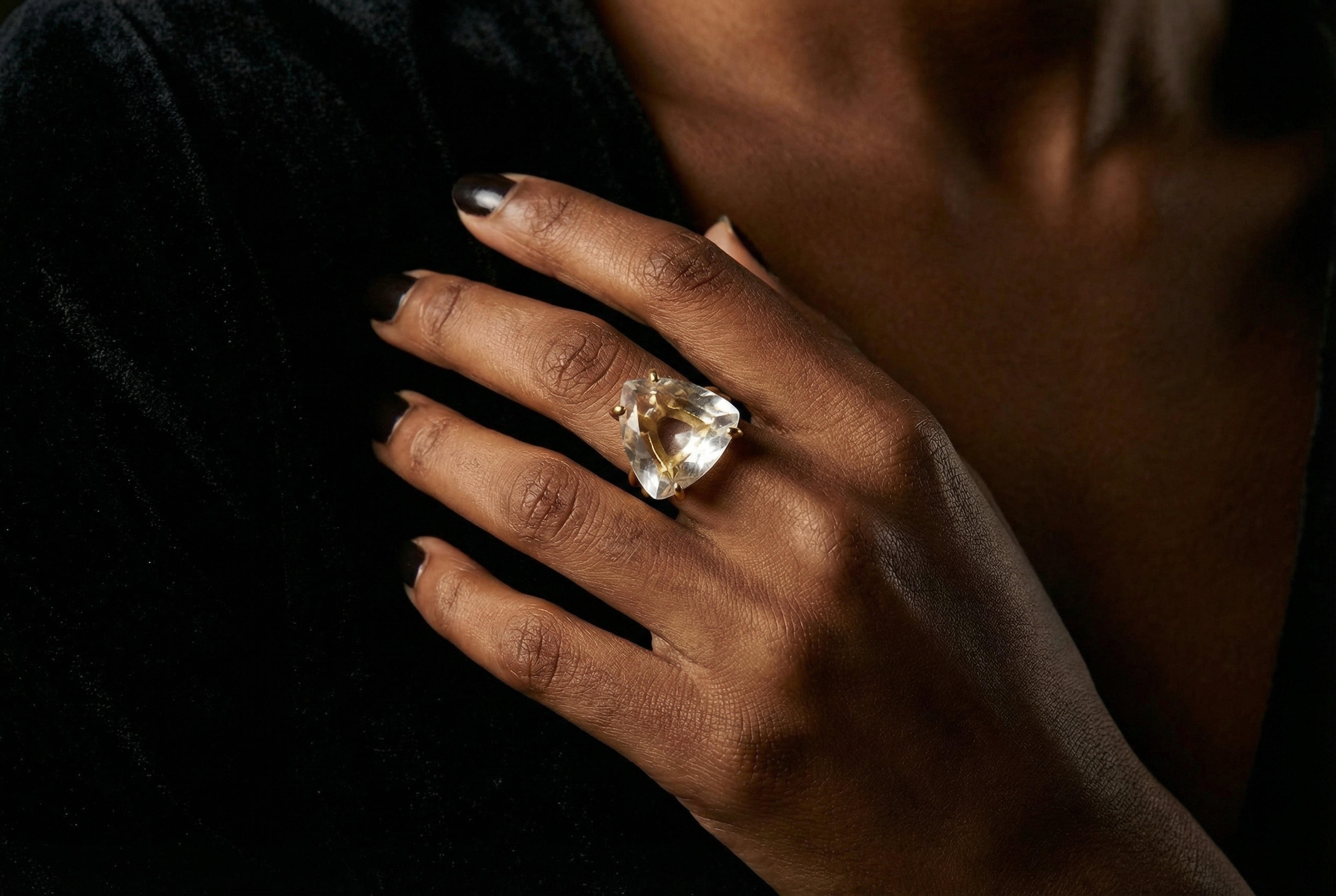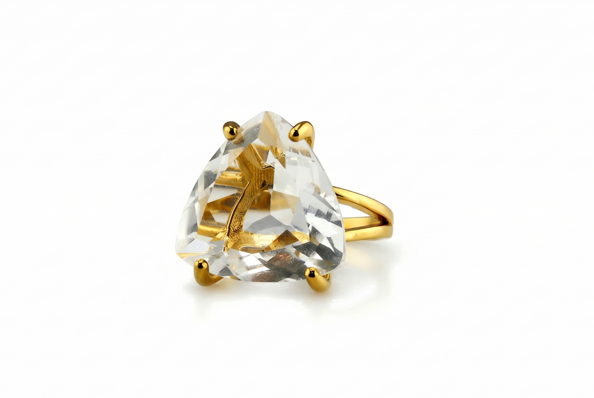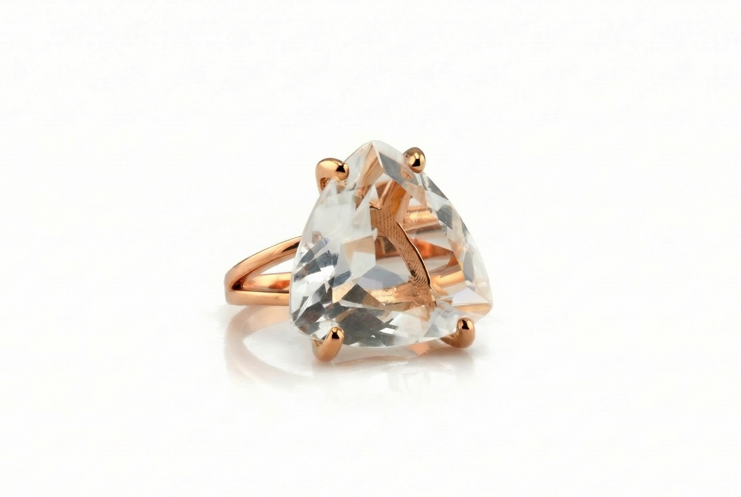 Fashioned in a 14k rose gold-filled setting with matching prongs, this trillion-cut Crystal Quartz, approximately 14 CT in weight, is designed to catch attention and turn heads. A beautiful choice as classy summer jewelry or an exquisite anniversary ring, this Crystal Quartz ring offers versatility and radiant charm. Whatever your jewelry ring needs may be, this piece is sure to suit you.