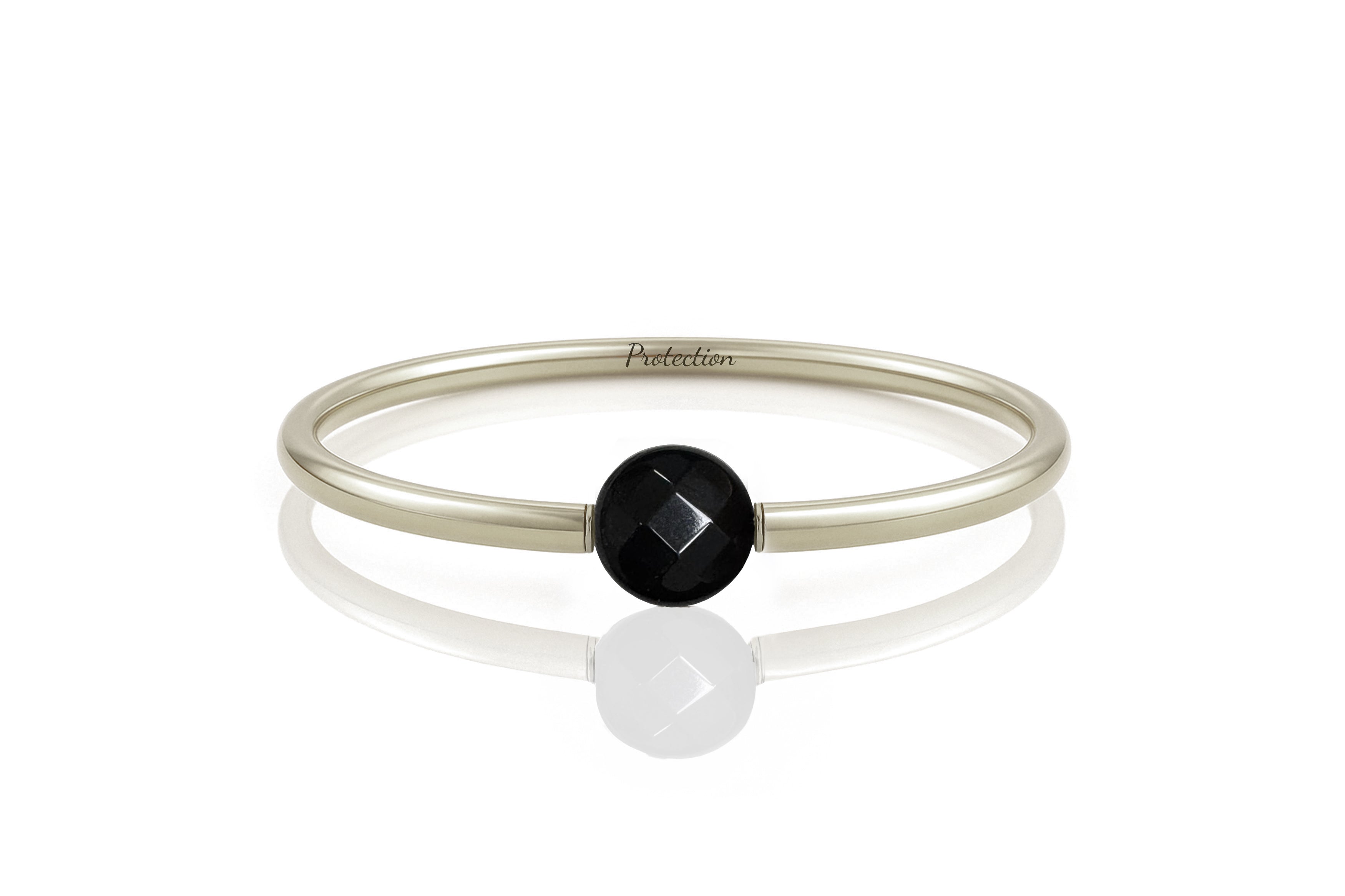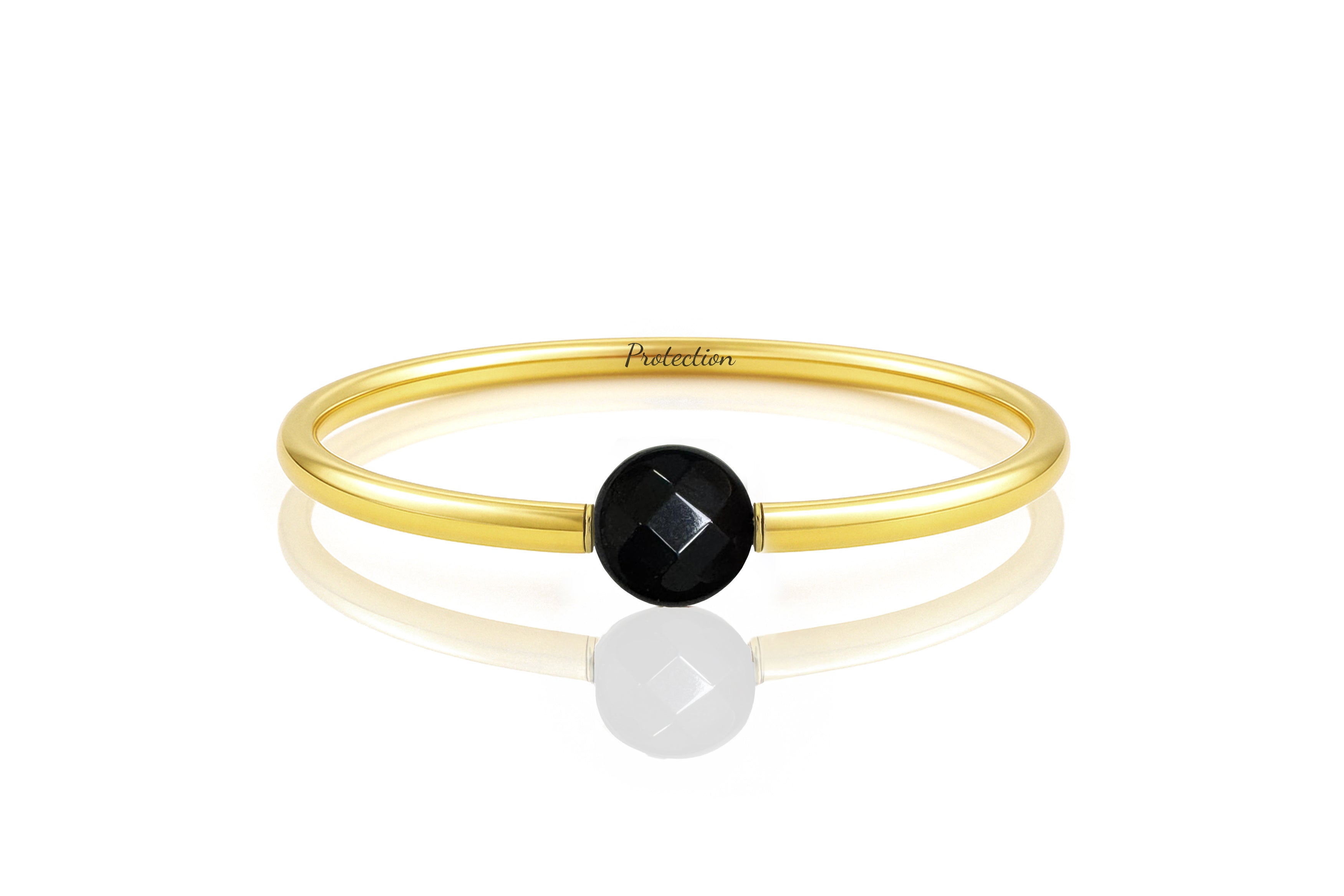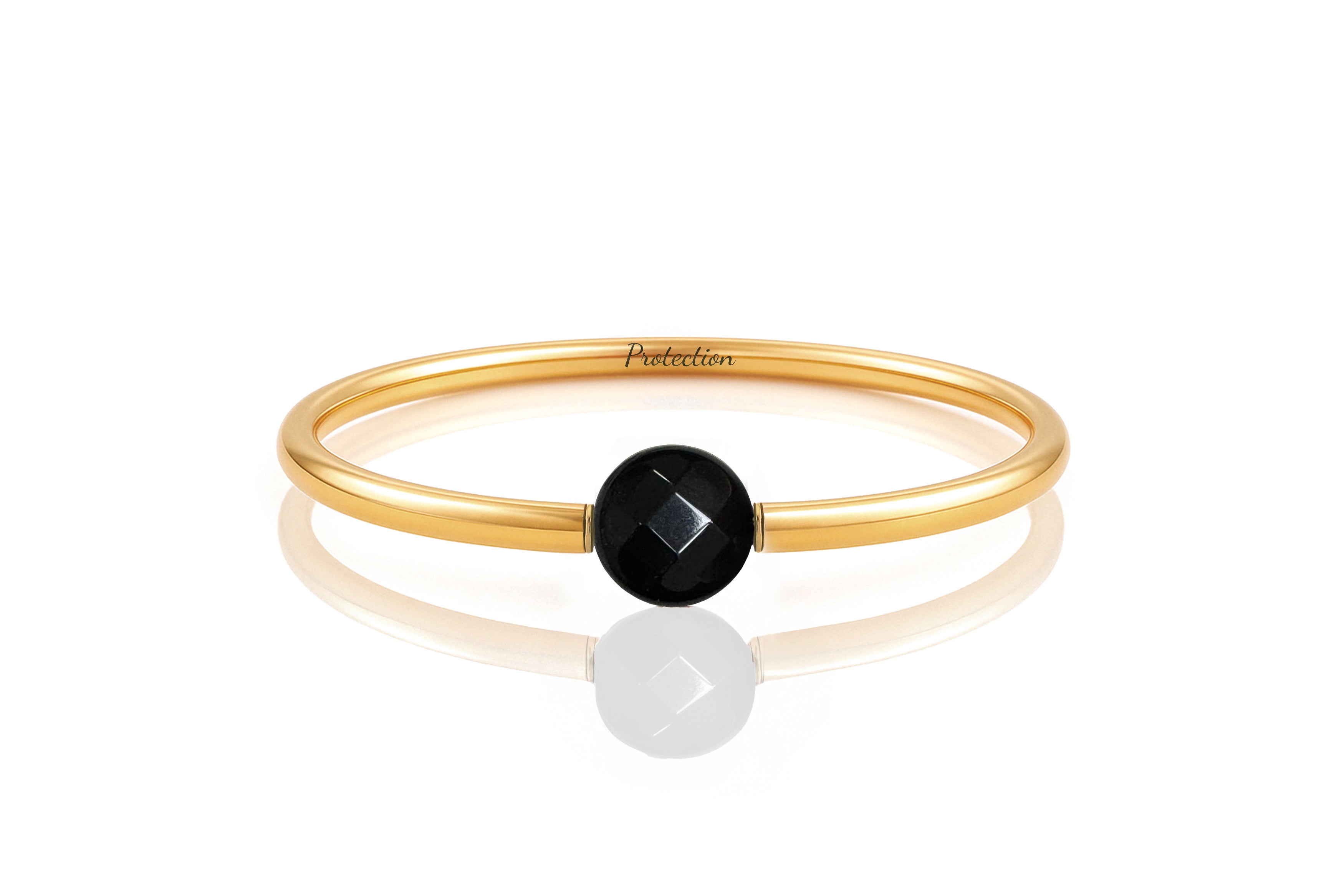This sleek 14k gold filled bangle bracelet showcases a flat, round coin-shaped black onyx bead with faceted detailing. The stone’s deep black tone reflects light with a subtle sparkle, bringing elegance and depth to a minimalist design.