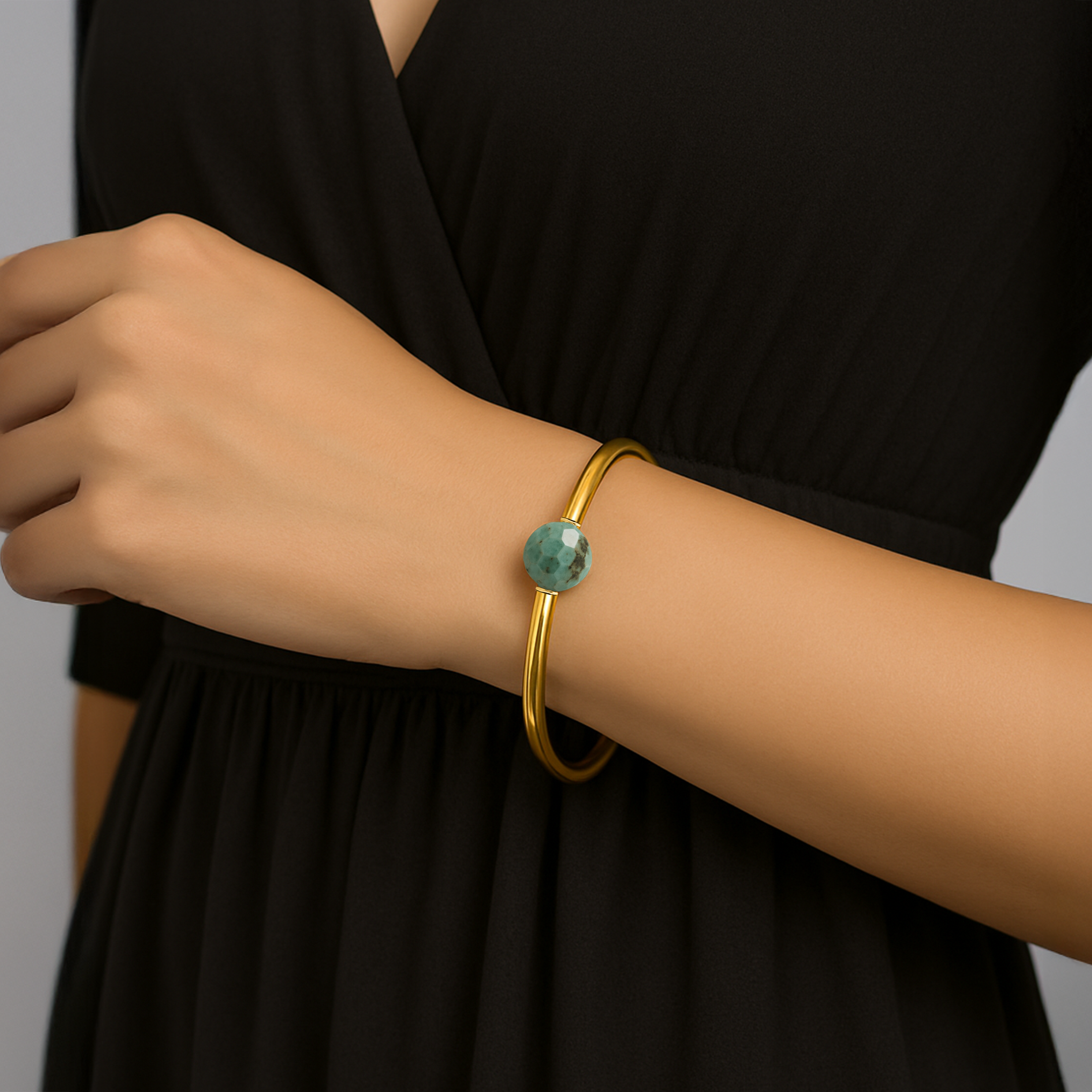The sleek, shimmering gold tube design highlights the natural beauty of the stone, making it a perfect stacking bracelet or a meaningful standalone piece. Ideal as a thoughtful gift for December birthdays or for anyone who loves the calming energy of turquoise, this bracelet blends natural charm with modern sophistication.