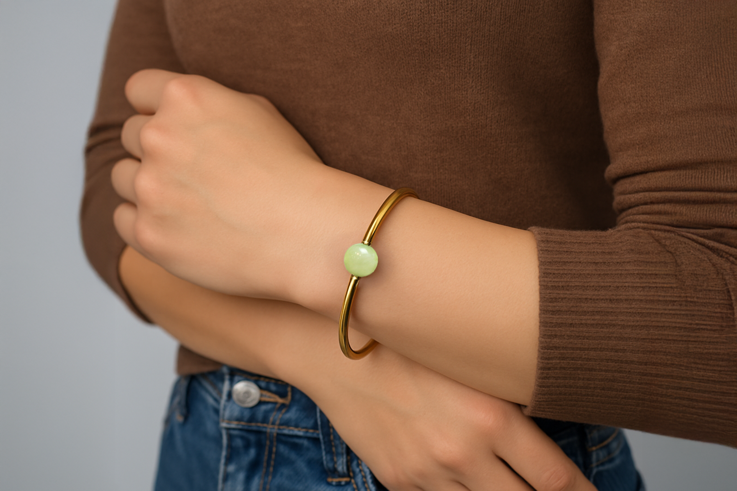 This Lemon Jade Tube Bracelet in Gold is a captivating addition to any jewelry collection. Featuring a single, natural lemon jade bead, this bracelet embodies calm and balance — perfect for daily wear or as a meaningful gift.