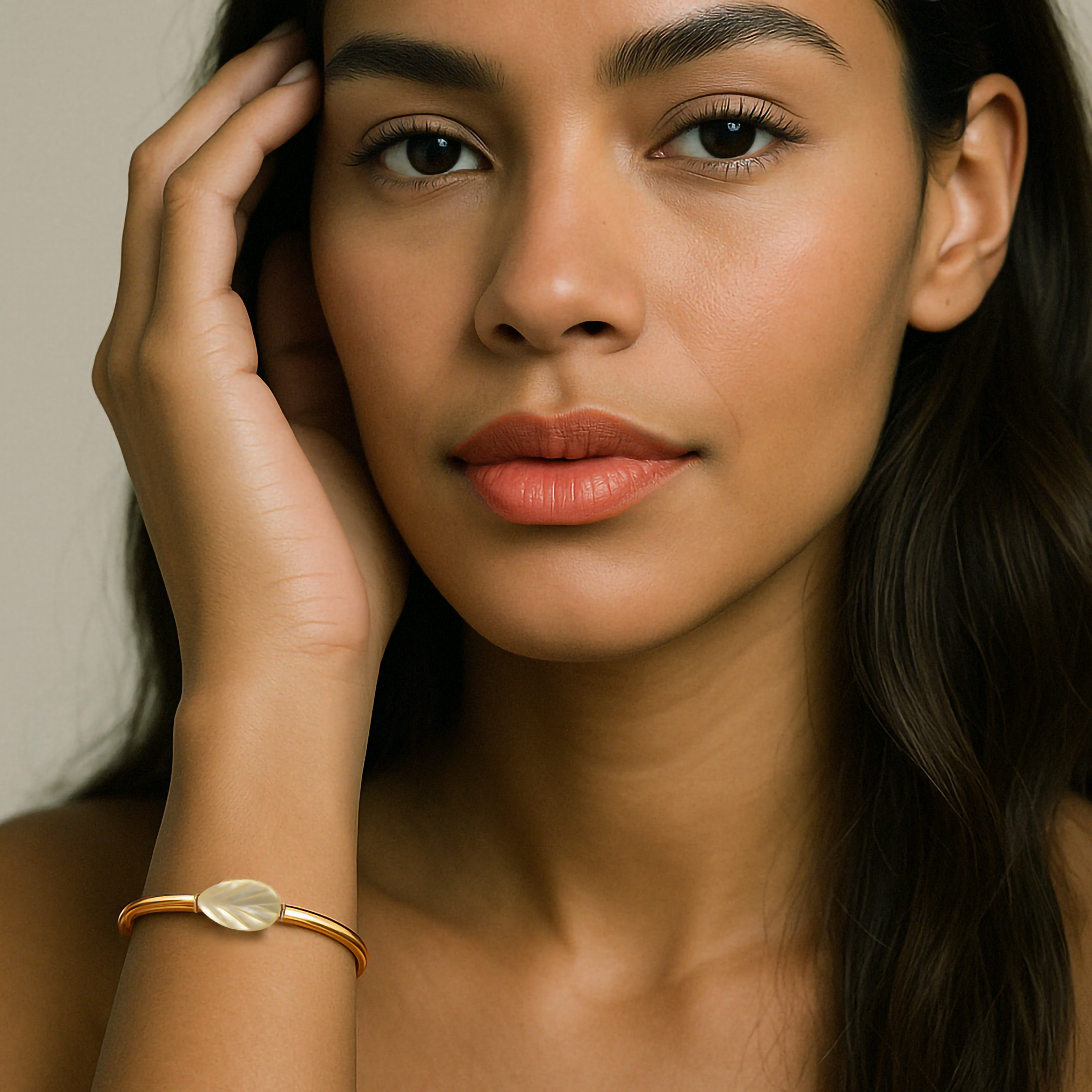 The closed slip-on design offers comfort and ease of wear, making it perfect for stacking or wearing solo. The iridescent quality of the mother of pearl catches and reflects light beautifully, bringing a nature-inspired glow to your wrist—ideal for everyday wear or gifting.