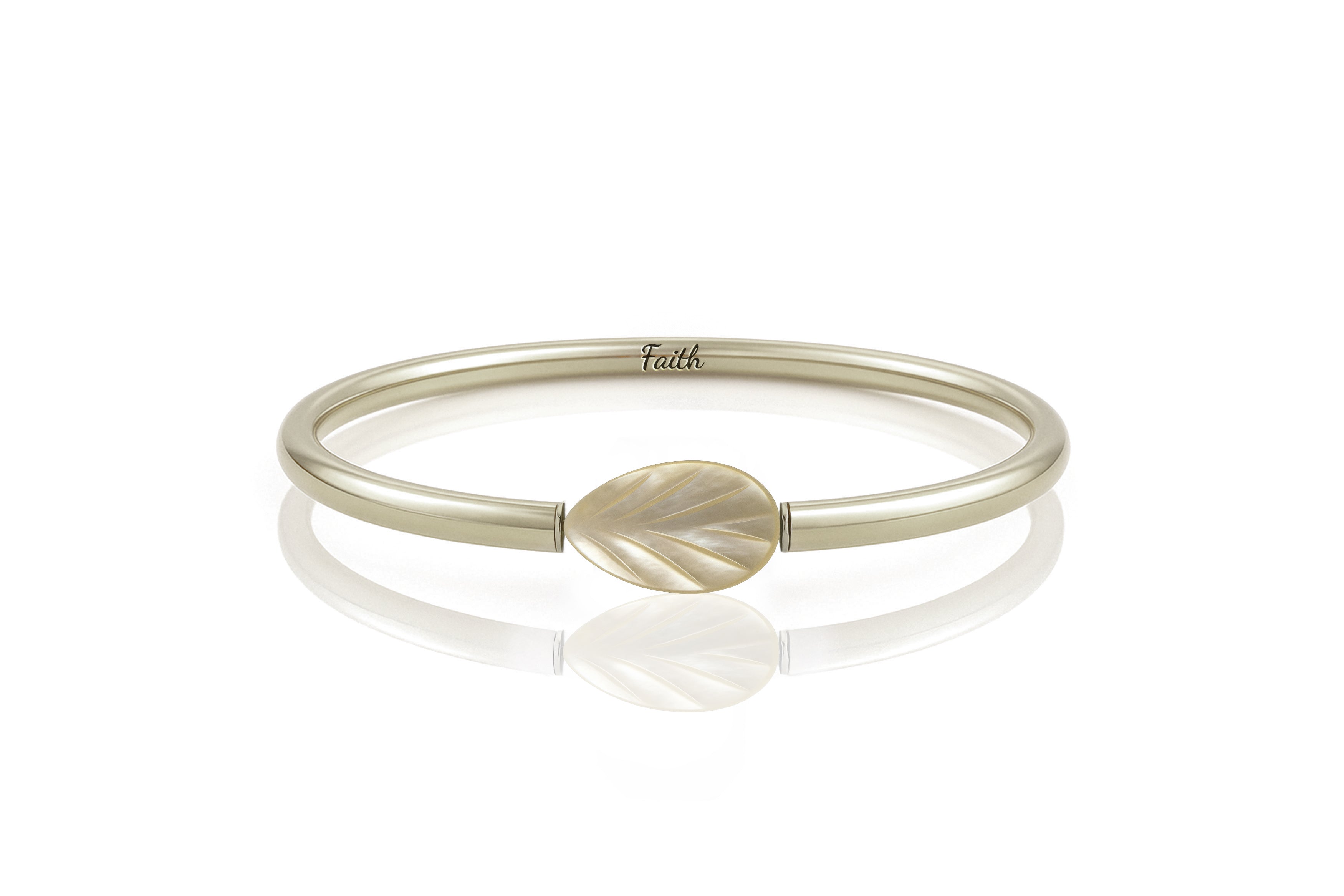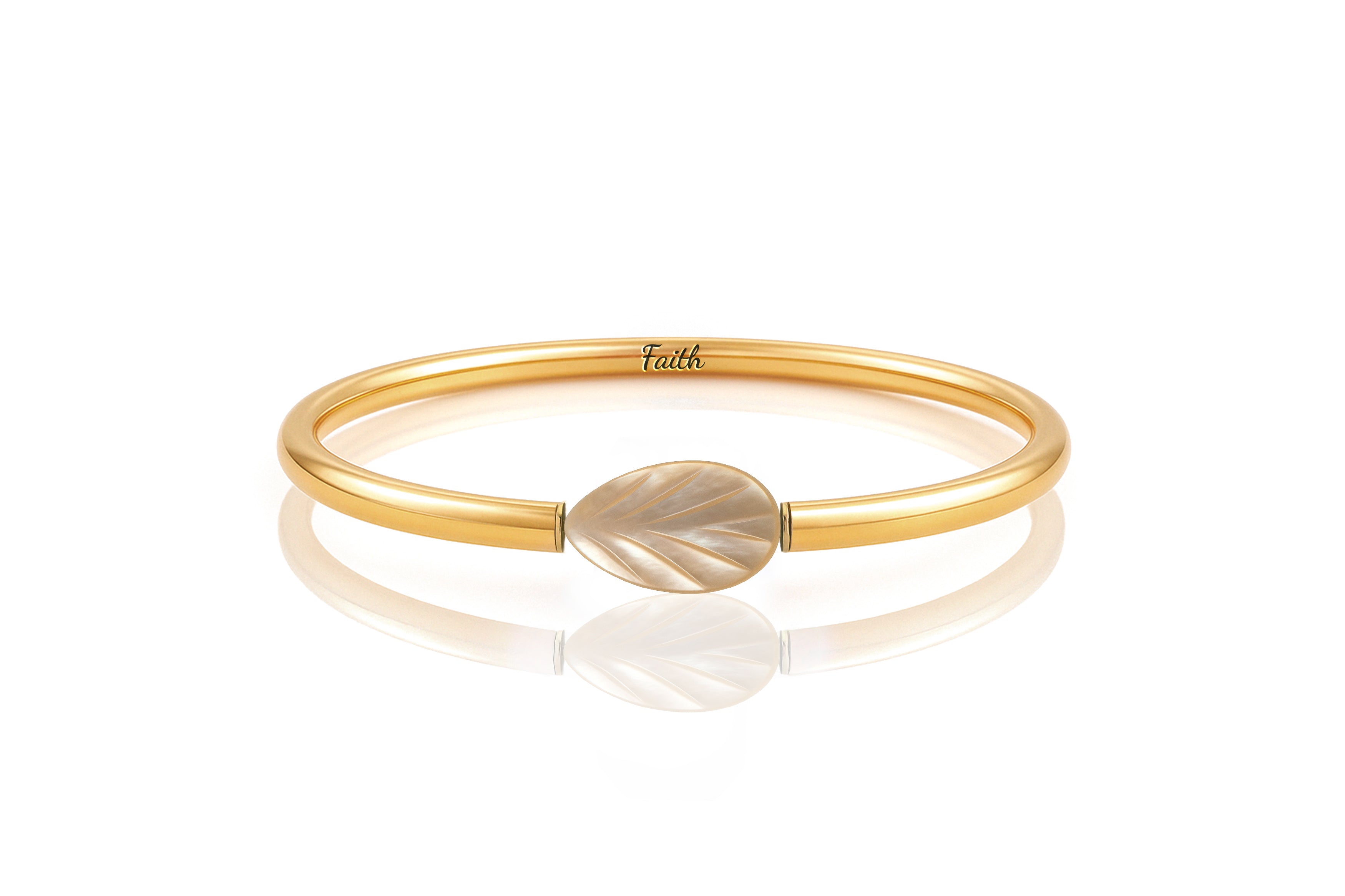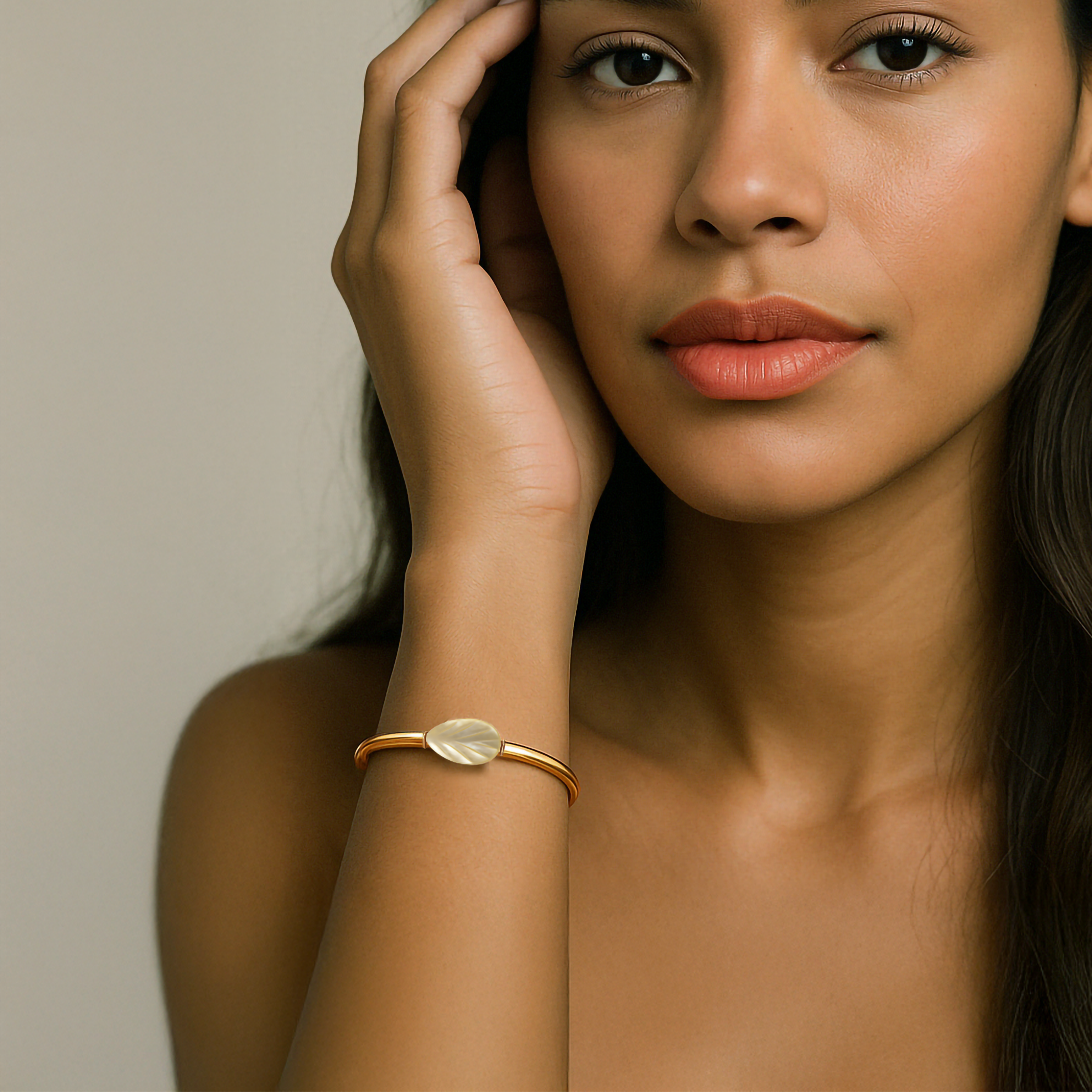 This delicate 14k gold filled bangle bracelet features an oval-shaped mother of pearl bead carved into a soft leaf motif. Set on a polished, tubular band, it blends natural texture with golden shine for a refined, feminine look.