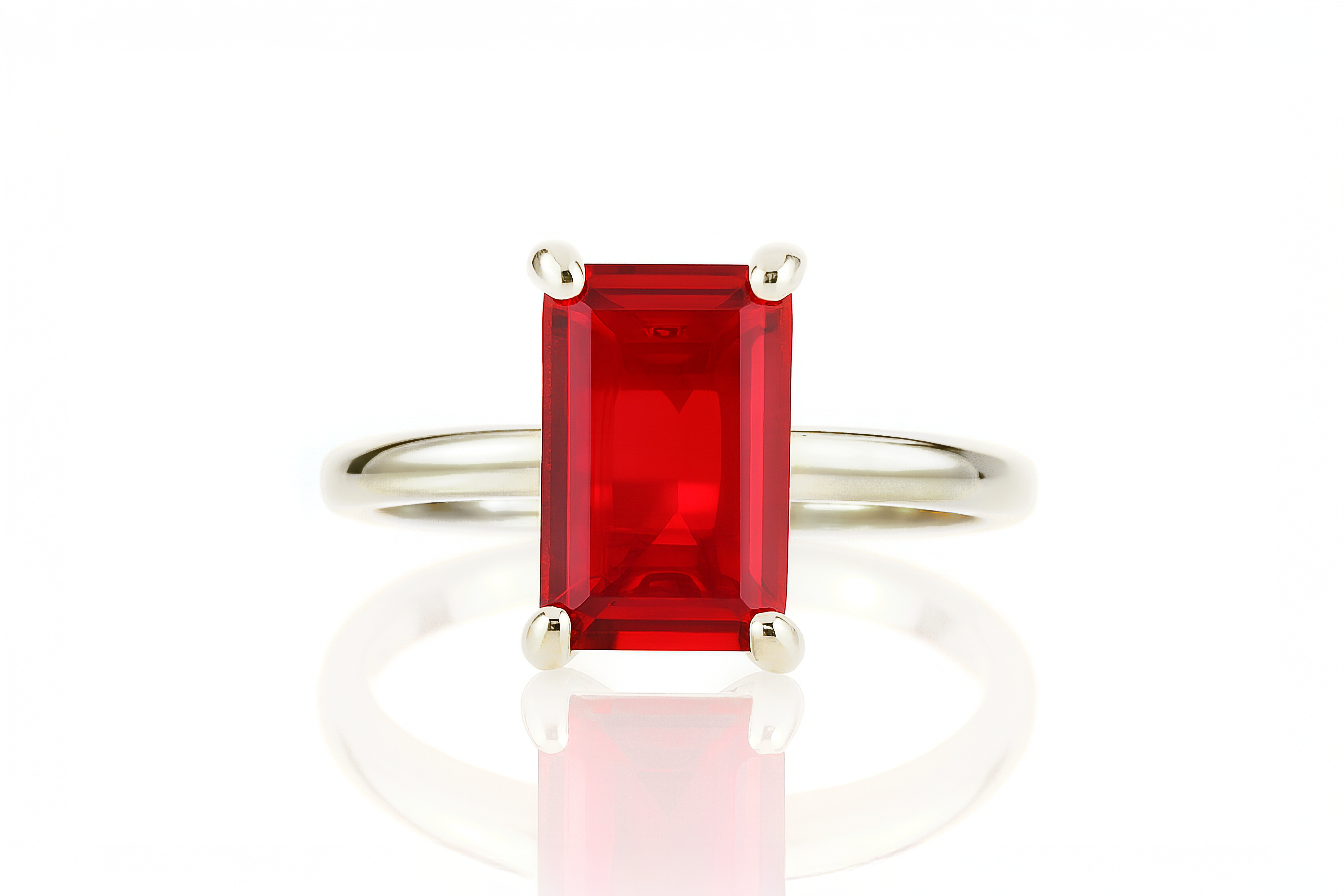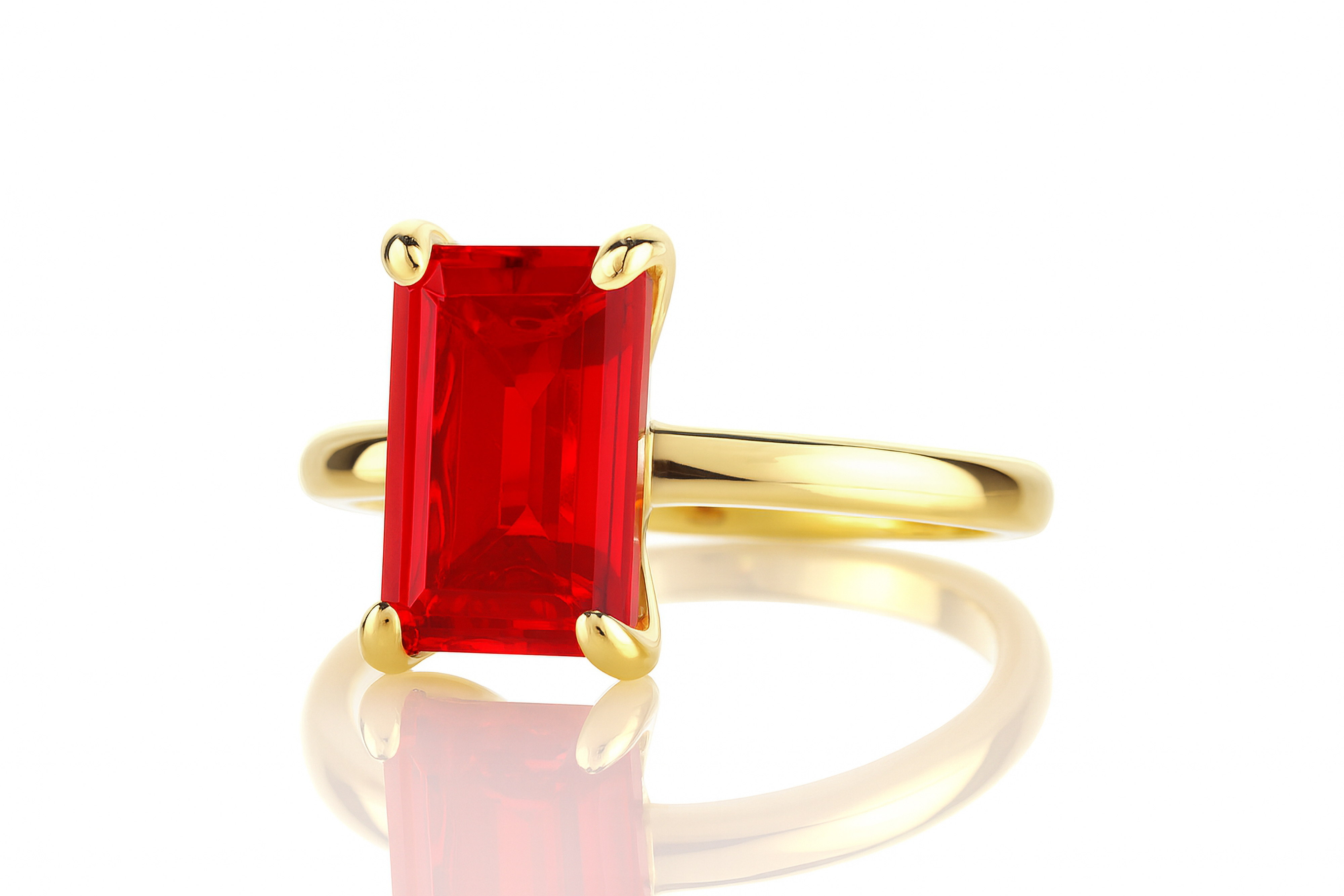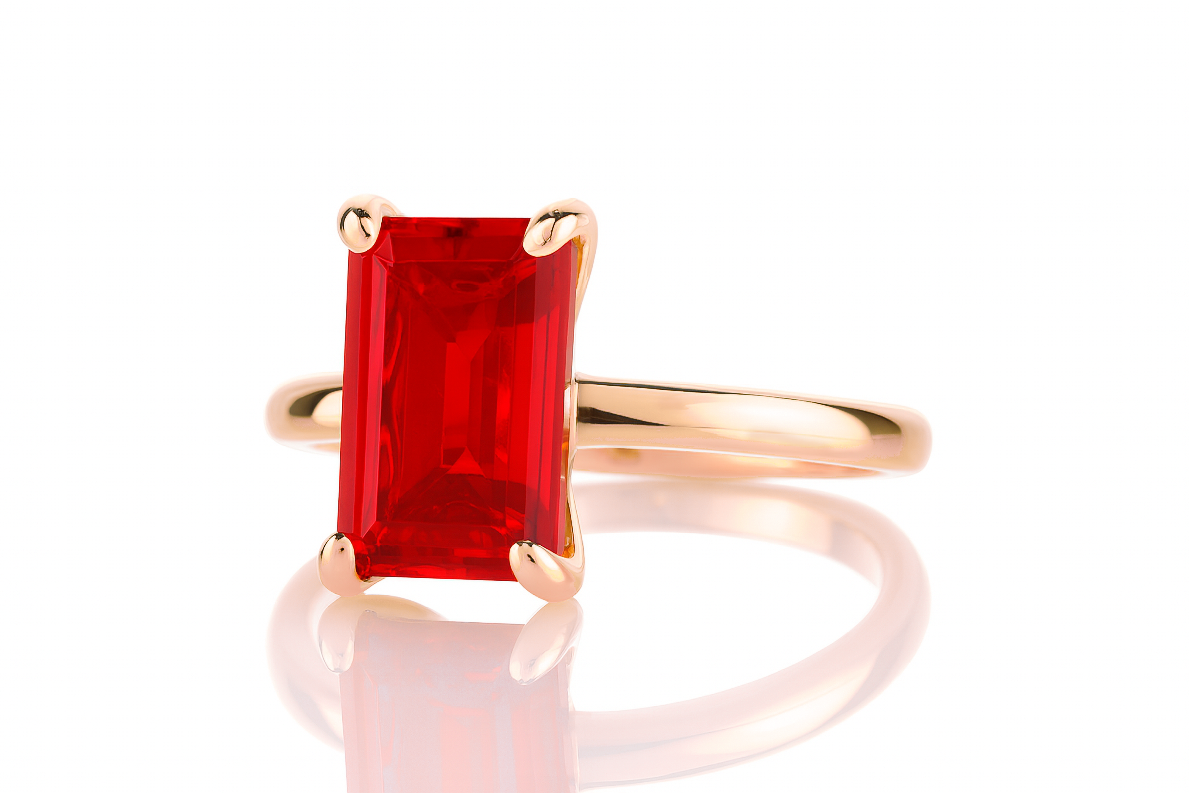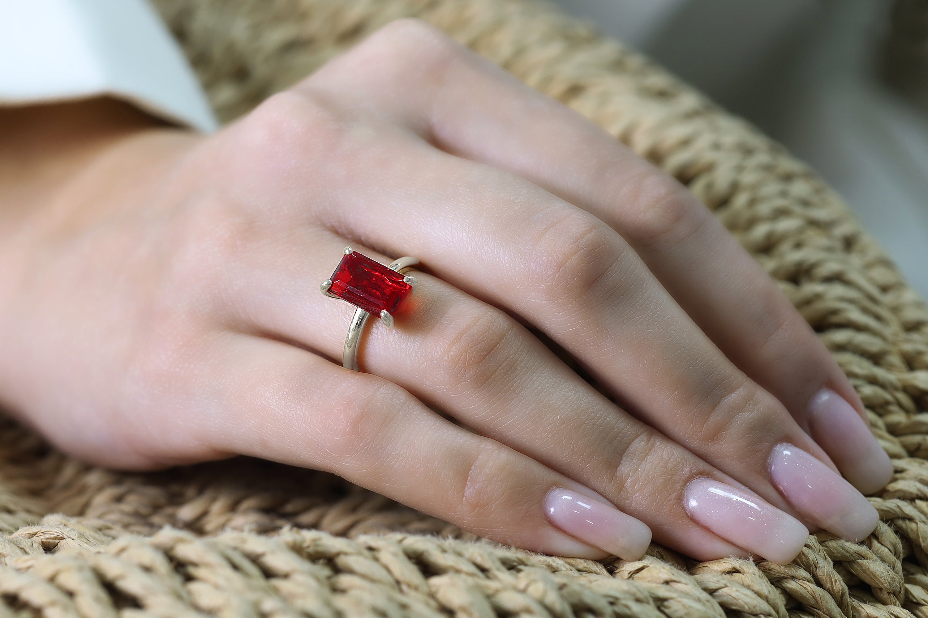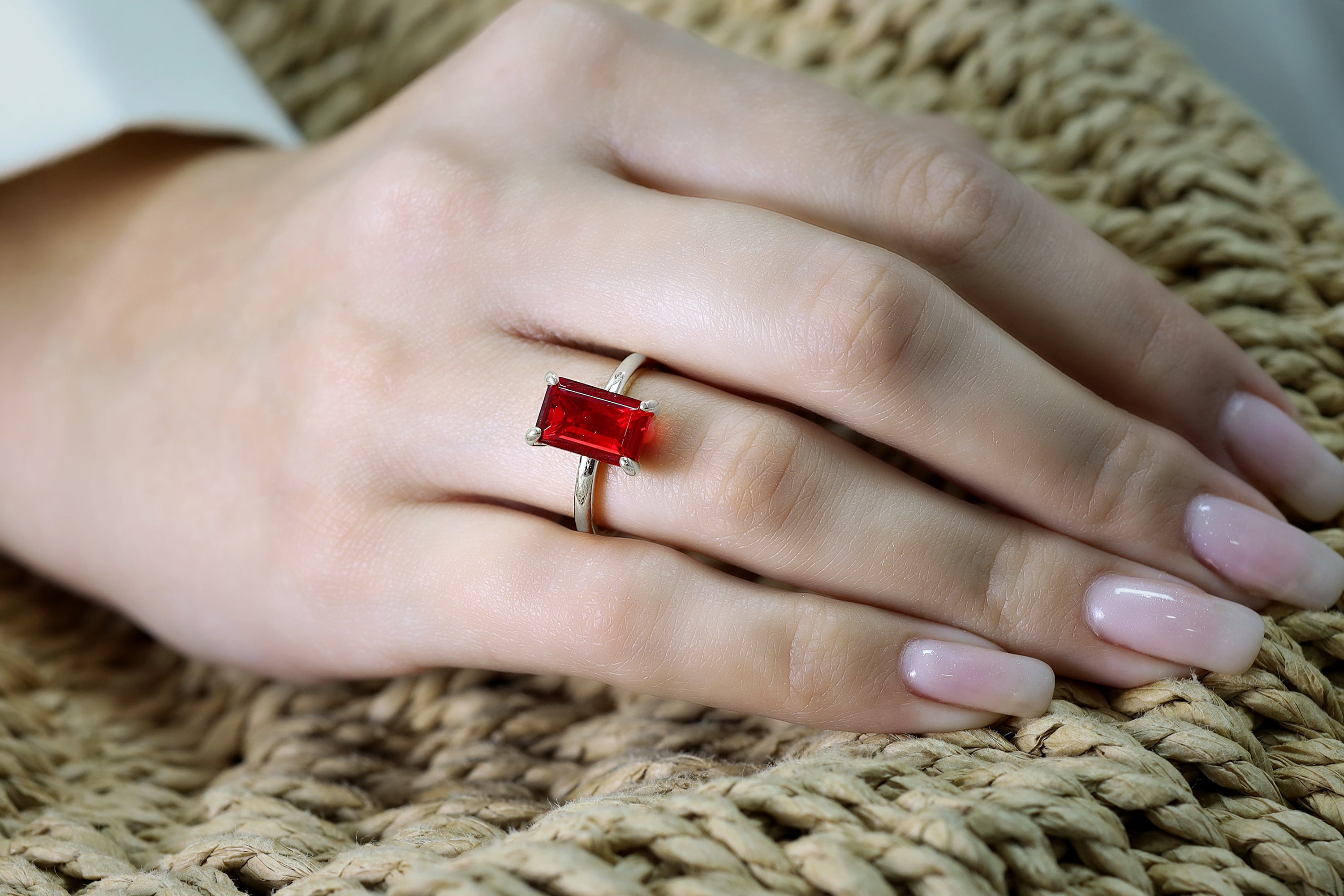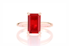 The ever stunning beauty of Ruby jewelry is expressed in this red ring with a rectangular Ruby stone set in 14k rose gold. Ruby is not just a July birthstone but can also be a symbol of love and passion making this gorgeous piece as an engagement or promise ring.