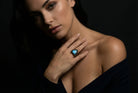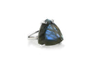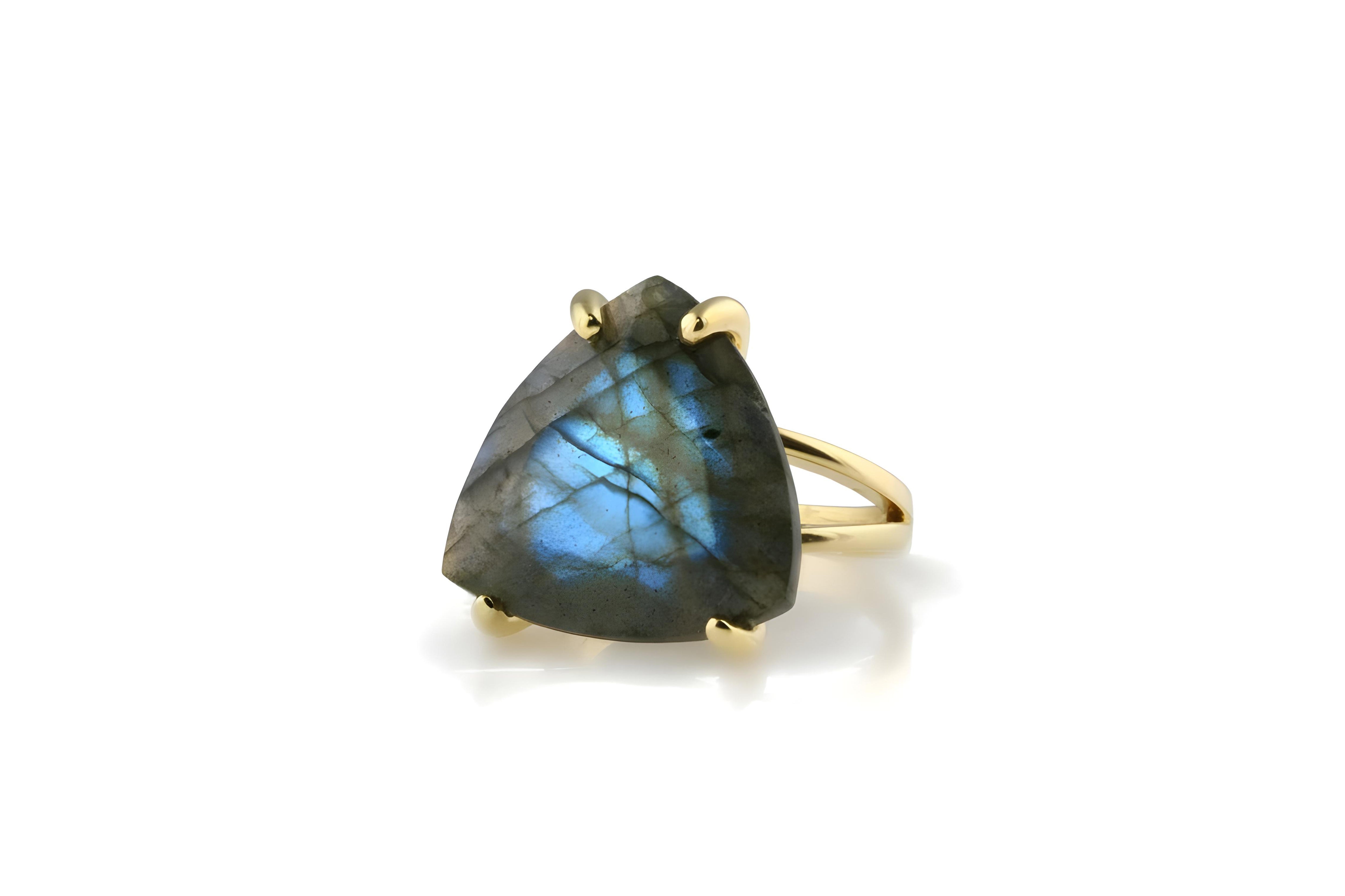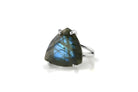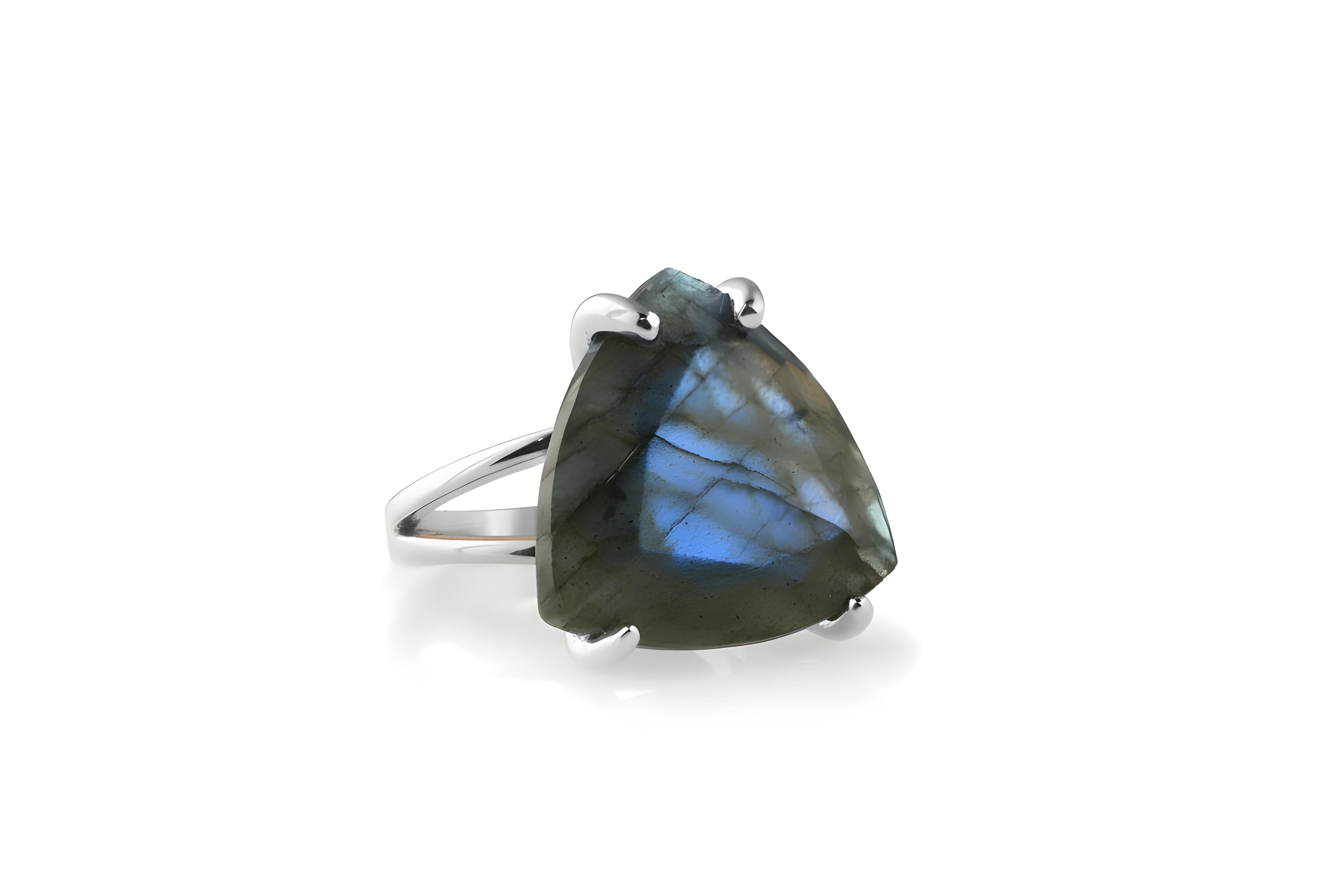 Statement jewelry for women featuring a beautiful trillion-cut Labradorite set in polished 925 sterling silver prongs with a double band, customizable in other metal options. Labradorite jewelry is a perfect choice for those drawn to rich color and is also valued as a meaningful metaphysical gemstone. This sterling silver ring blends purpose with style, offering a graceful balance of class and elegance.