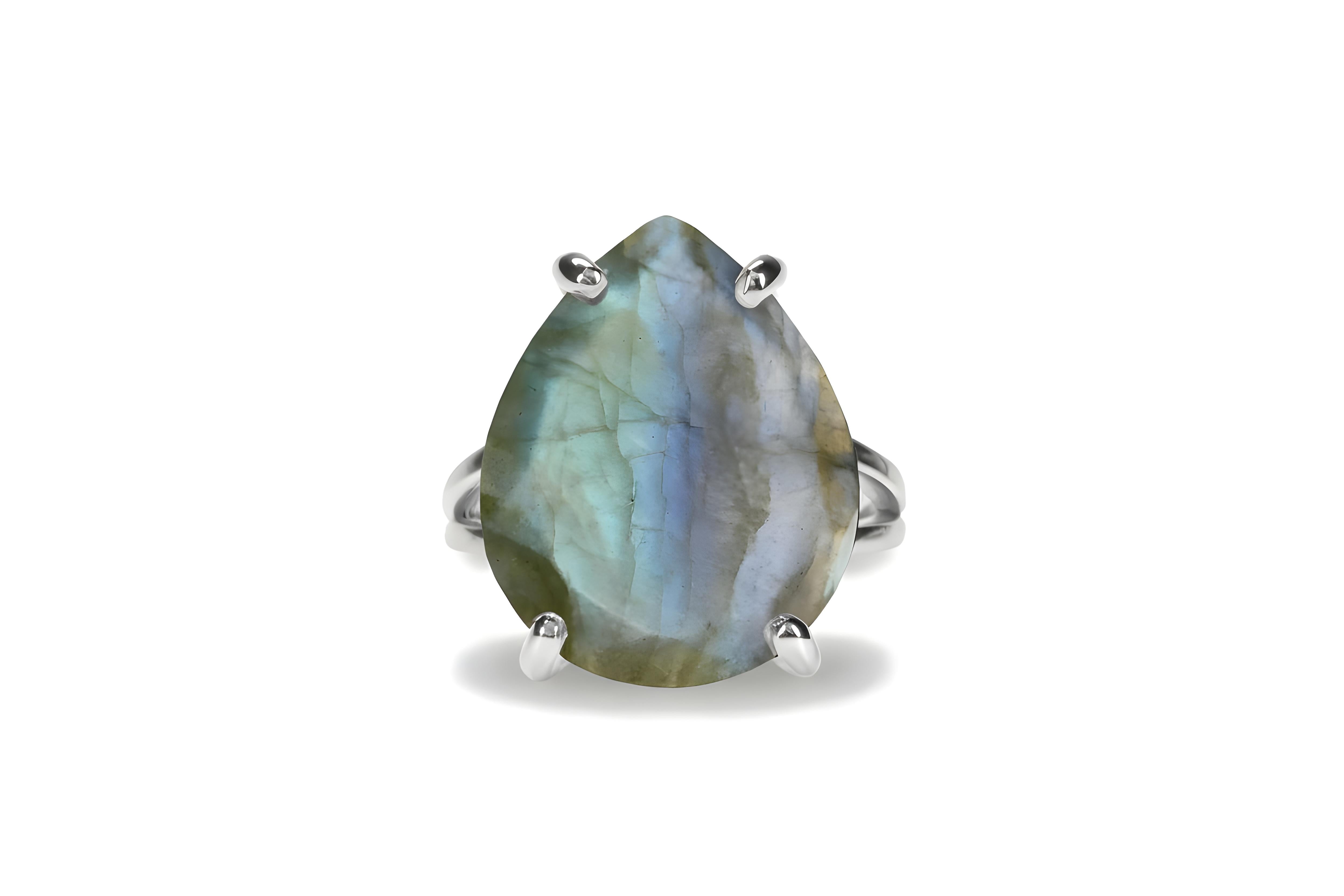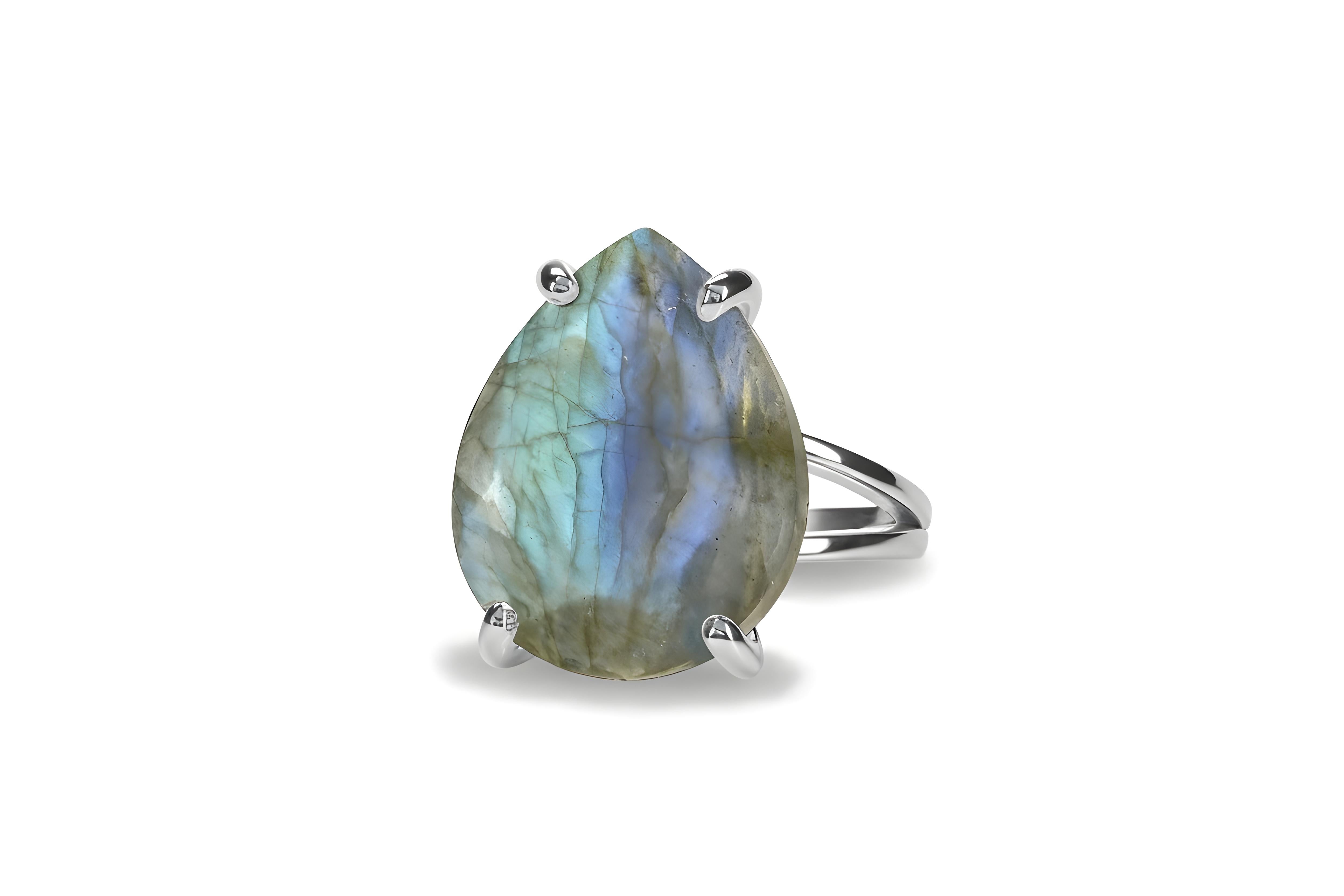 A shimmering sterling silver labradorite ring featuring a glowing blue-flash pear gemstone that shifts beautifully with the light. This teardrop natural stone ring is crafted with a smooth double-band setting designed to highlight every color within the stone. Its bold shape makes it an effortless statement pear ring while remaining comfortable enough for everyday wear. Each gemstone is natural and uniquely patterned, making every piece one-of-a-kind. A striking choice for anyone who loves meaningful gemstone jewelry or wants a special gift for her.