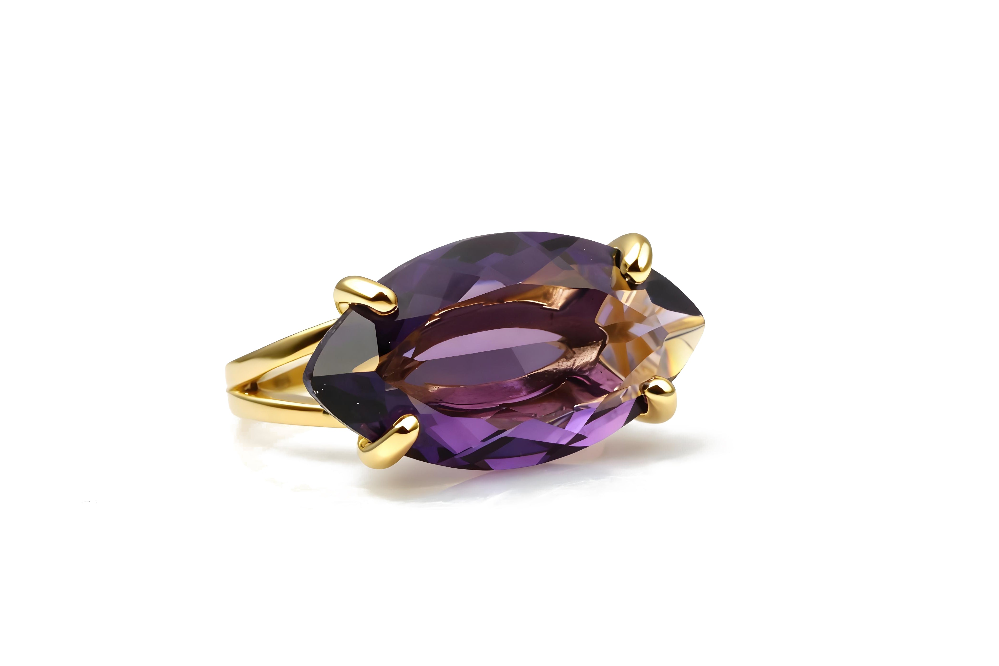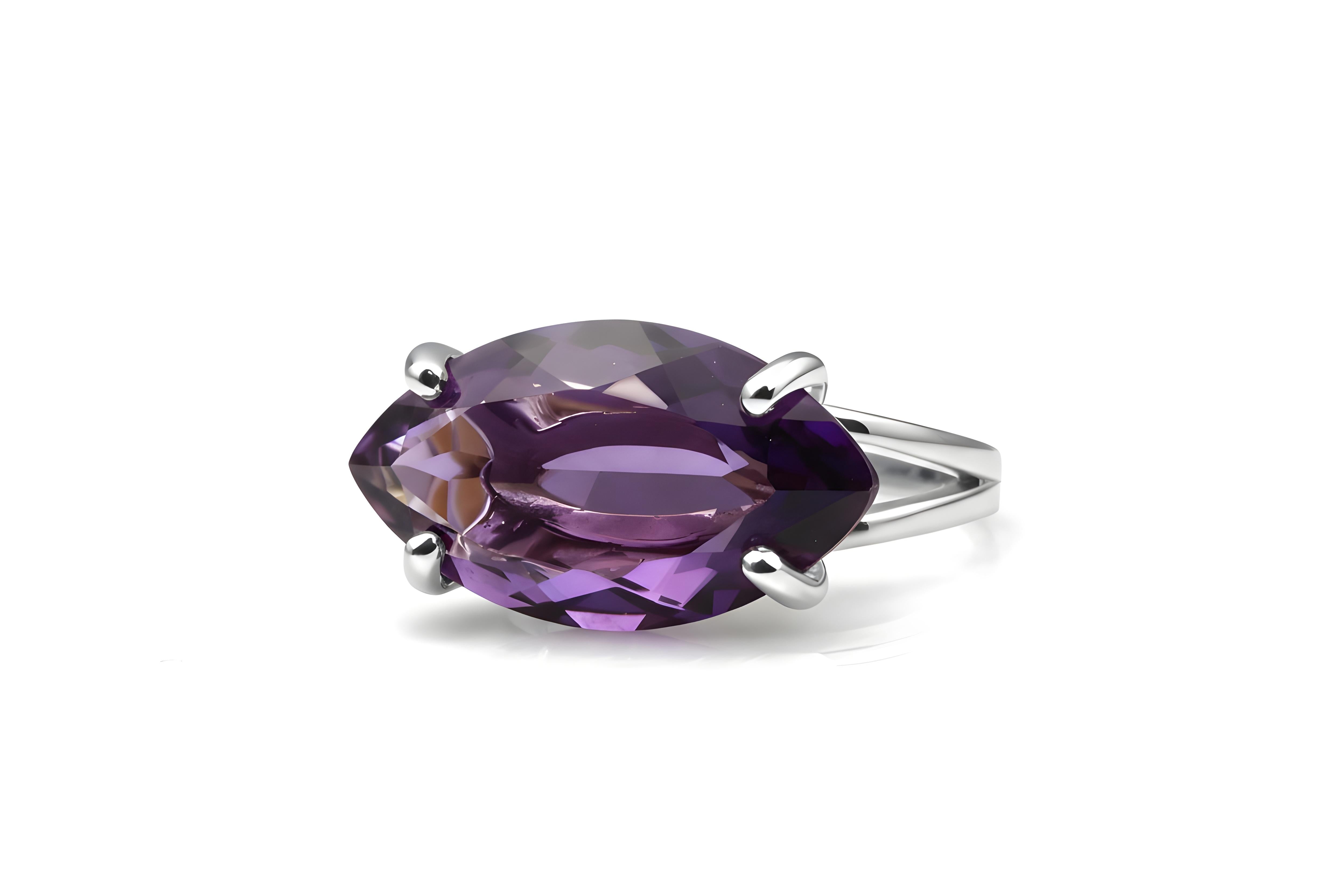 This 14k gold marquise-cut amethyst ring combines elegance with bold character. The elongated gemstone highlights the finger beautifully, while the warm tone of gold enhances the rich purple hue of the amethyst. Known as the February birthstone, amethyst represents peace and clarity. A stunning handmade ring perfect for weddings, gifts, or everyday luxury.