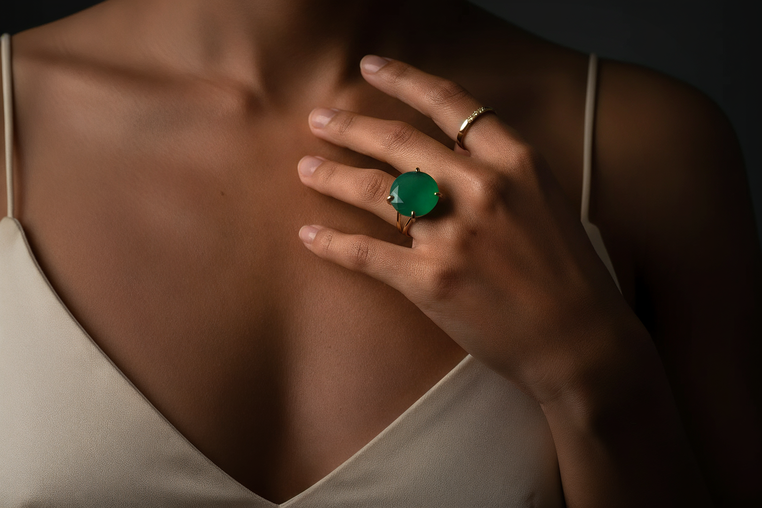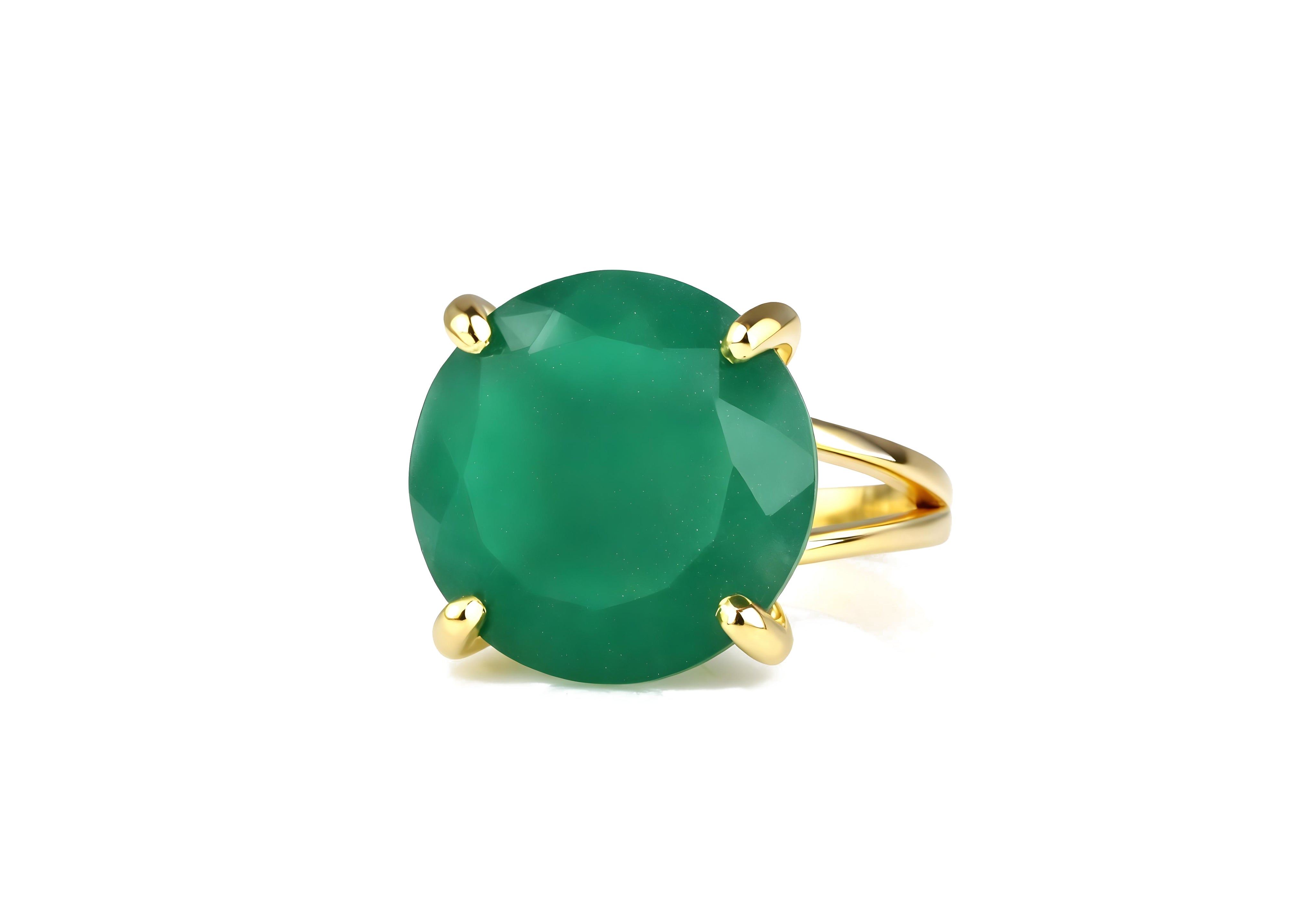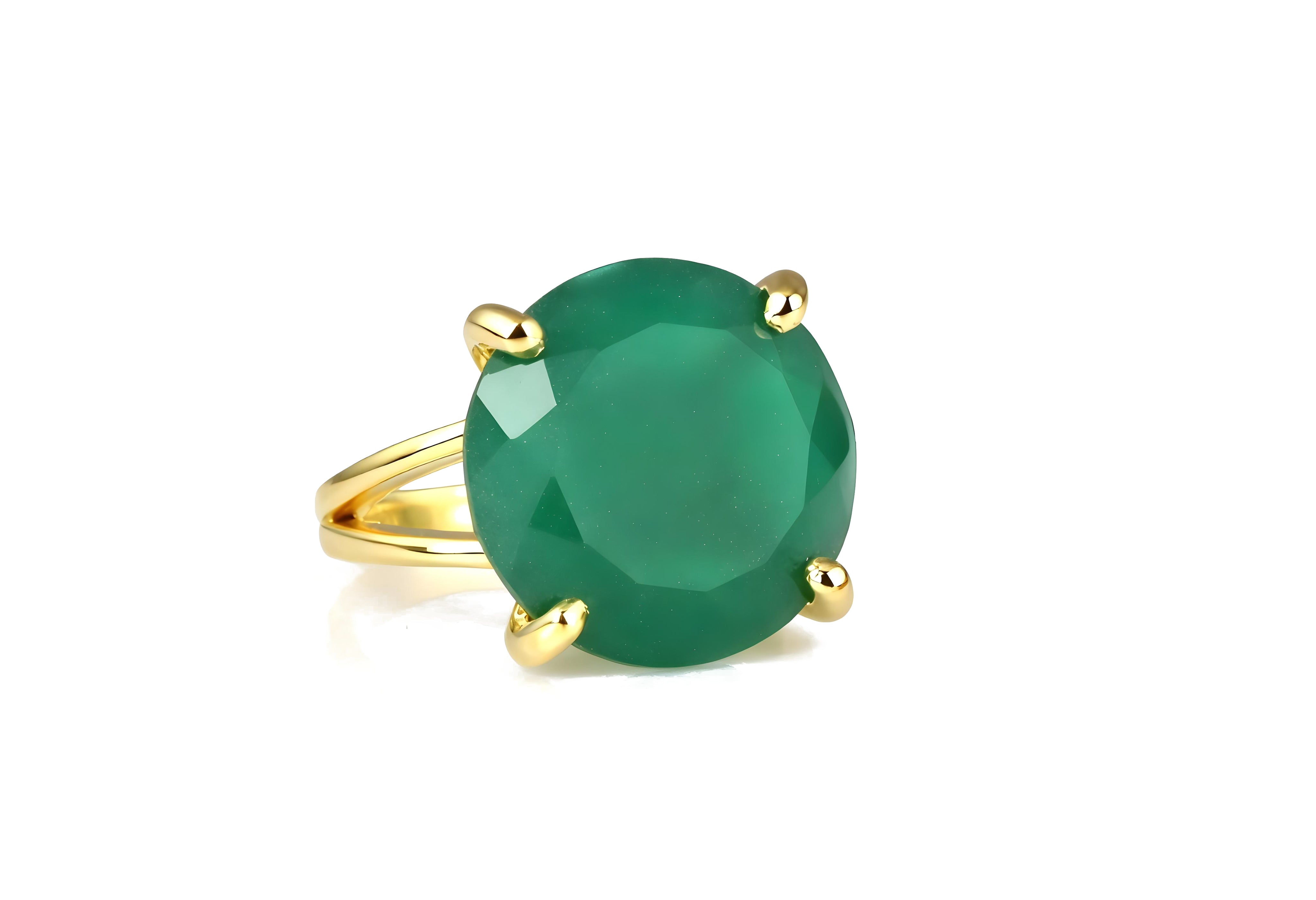 This handcrafted statement ring features a vivid green onyx gemstone set in gold for a bold yet refined look. The round faceted stone catches the light beautifully, making it perfect for everyday wear or special occasions. Each ring is handmade with care and customizable in size and metal type, offering you a truly personal piece of jewelry.