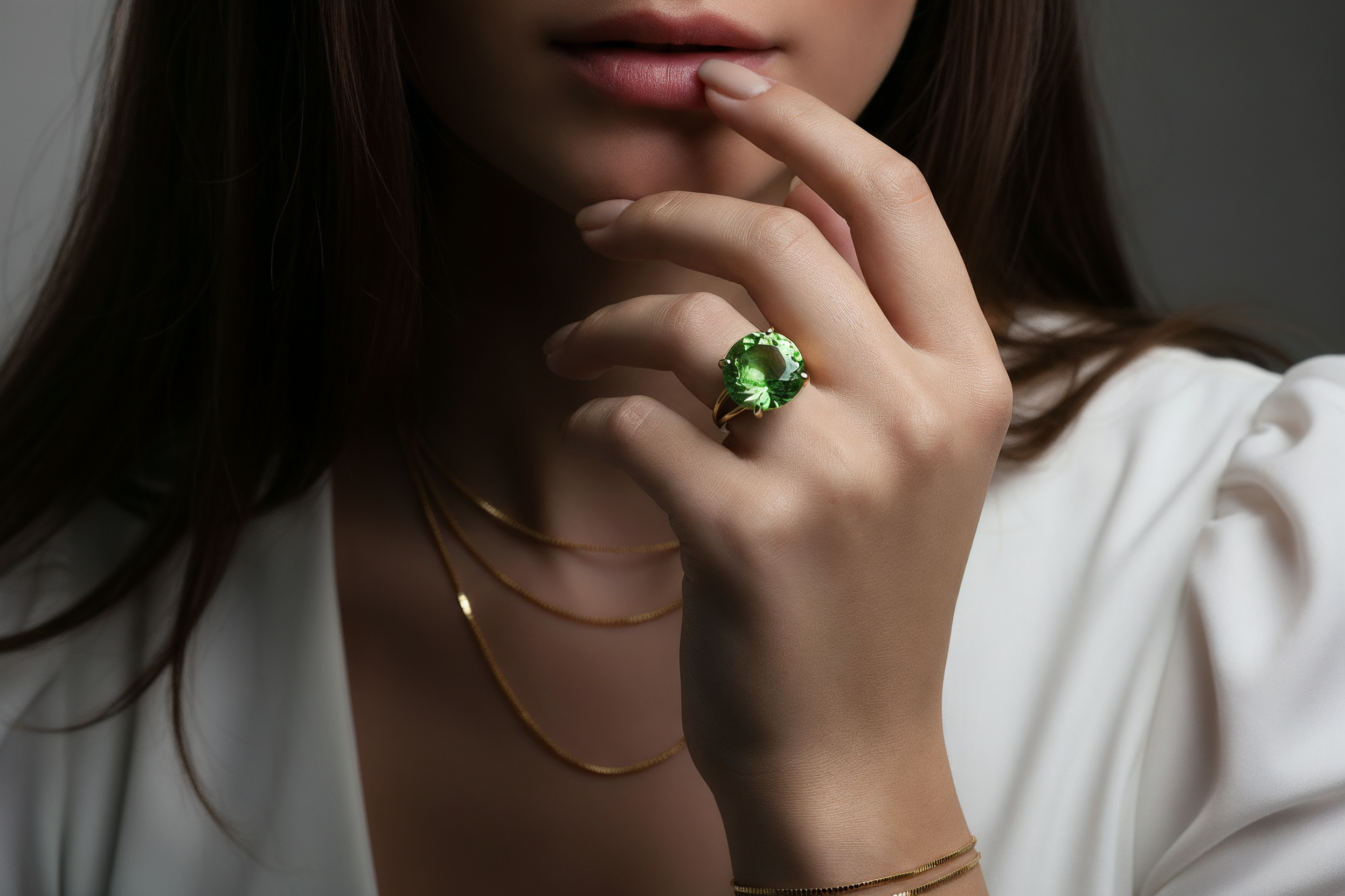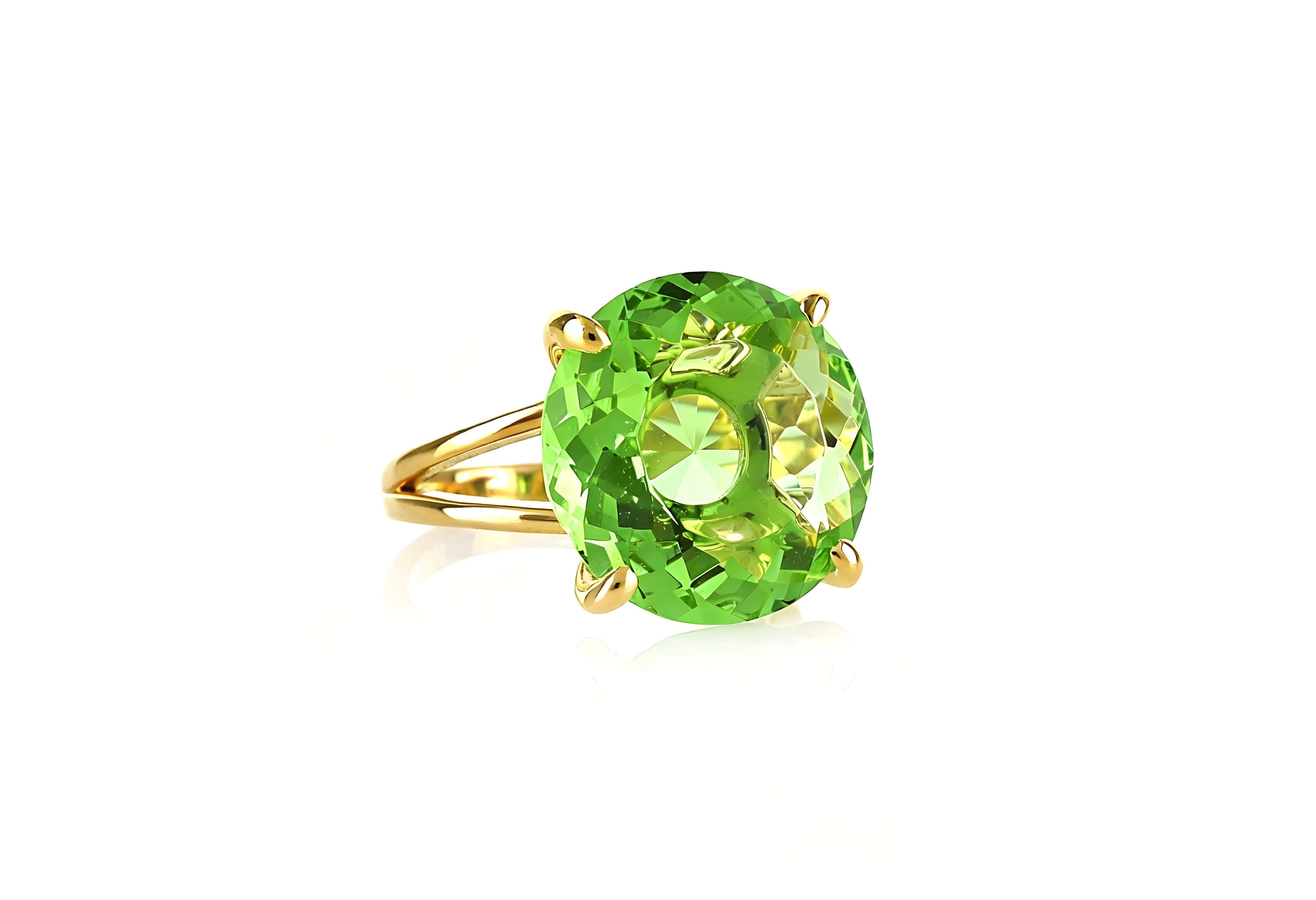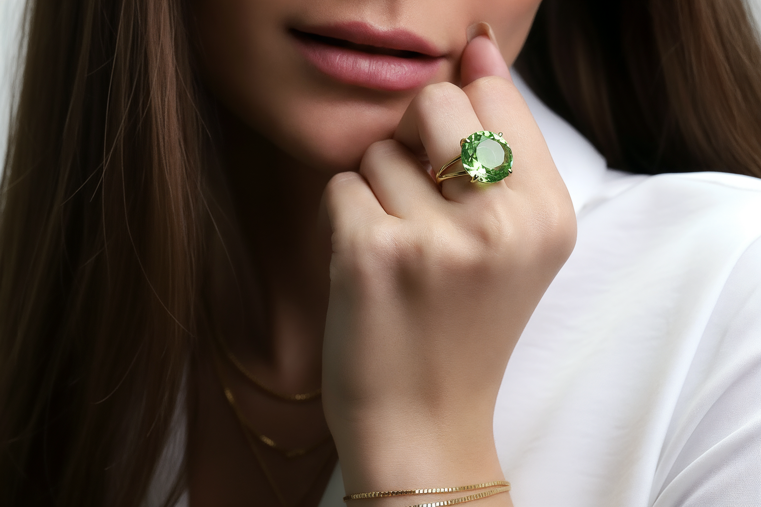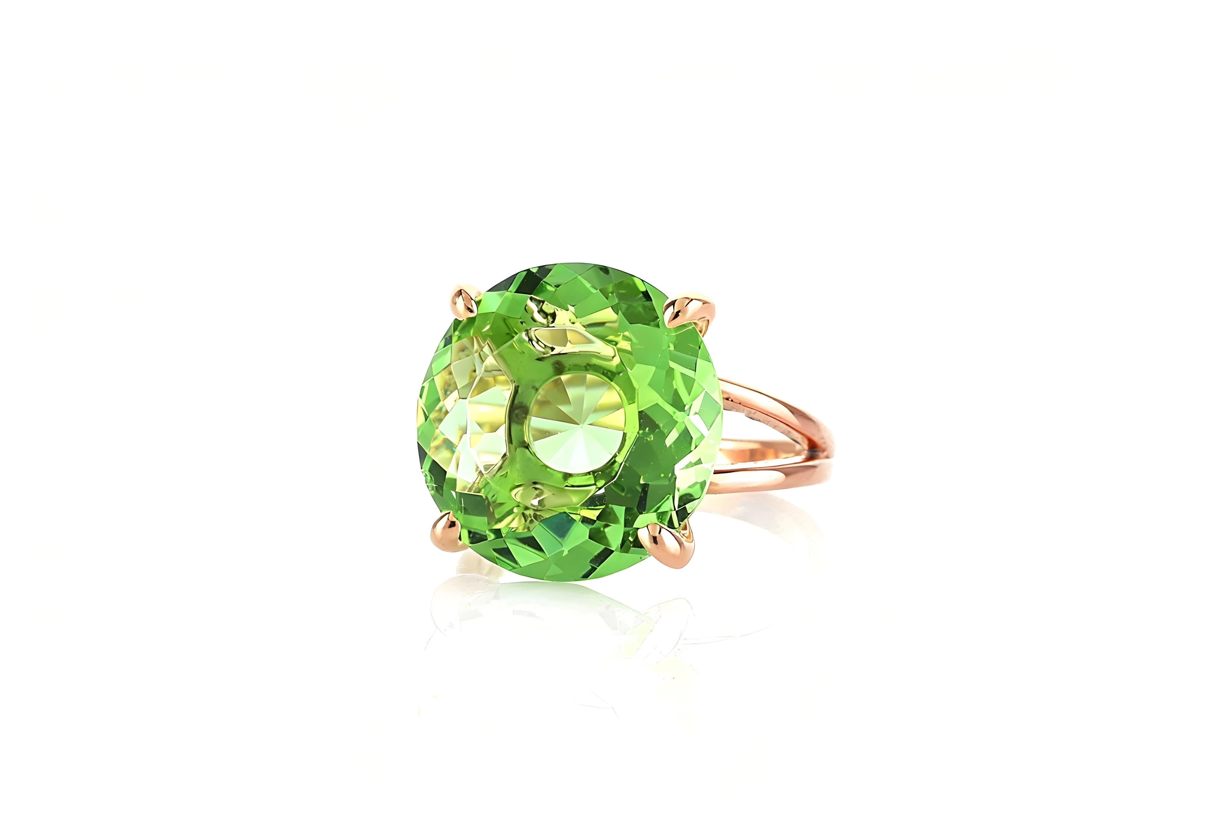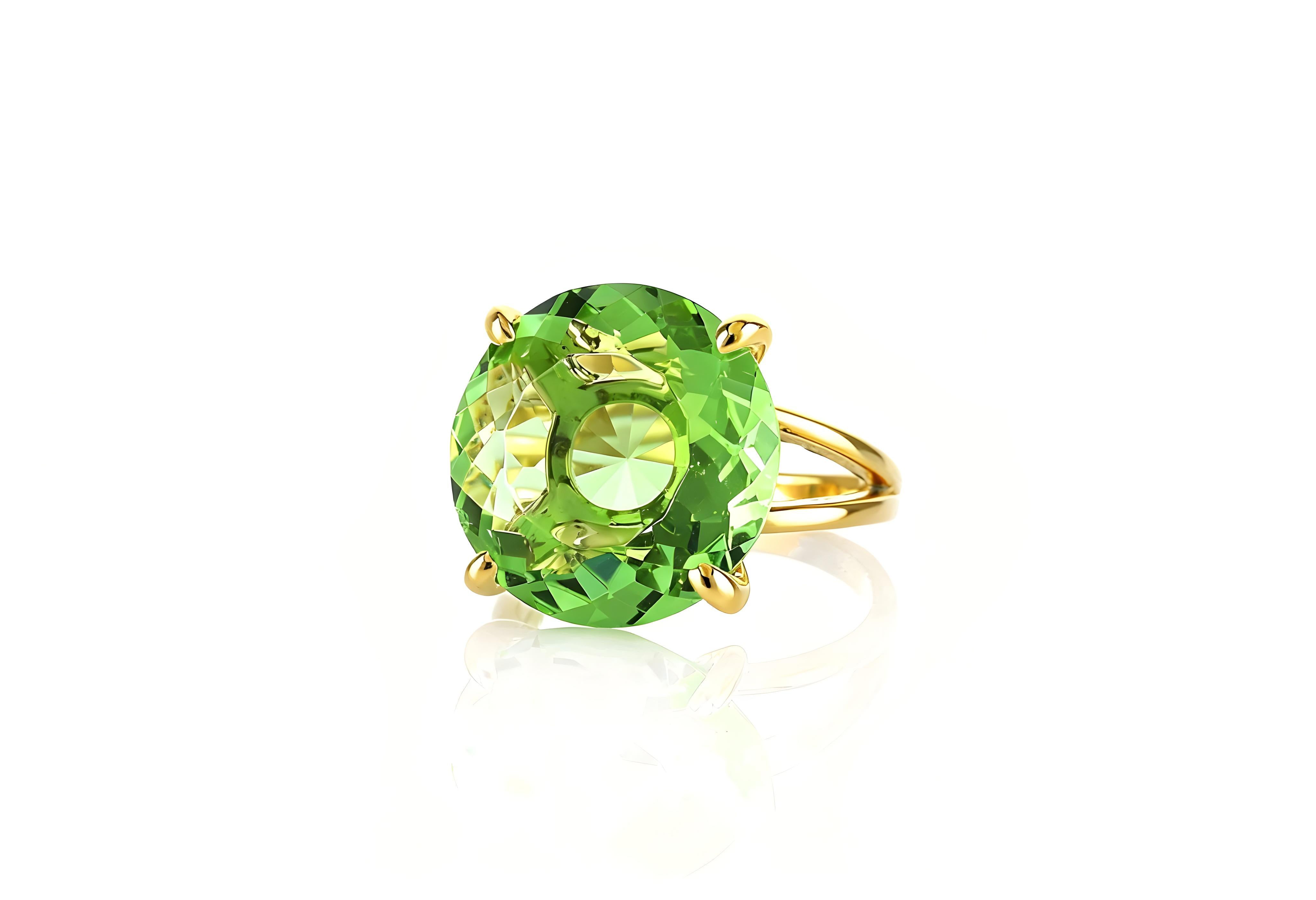 This Round Green Tourmaline Ring combines a classic gemstone with a contemporary split band design in 14k gold. Perfect for October birthdays, this bold cocktail ring features a stunning round-cut green tourmaline, making it a timeless statement piece or a thoughtful gift for her.