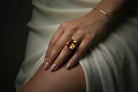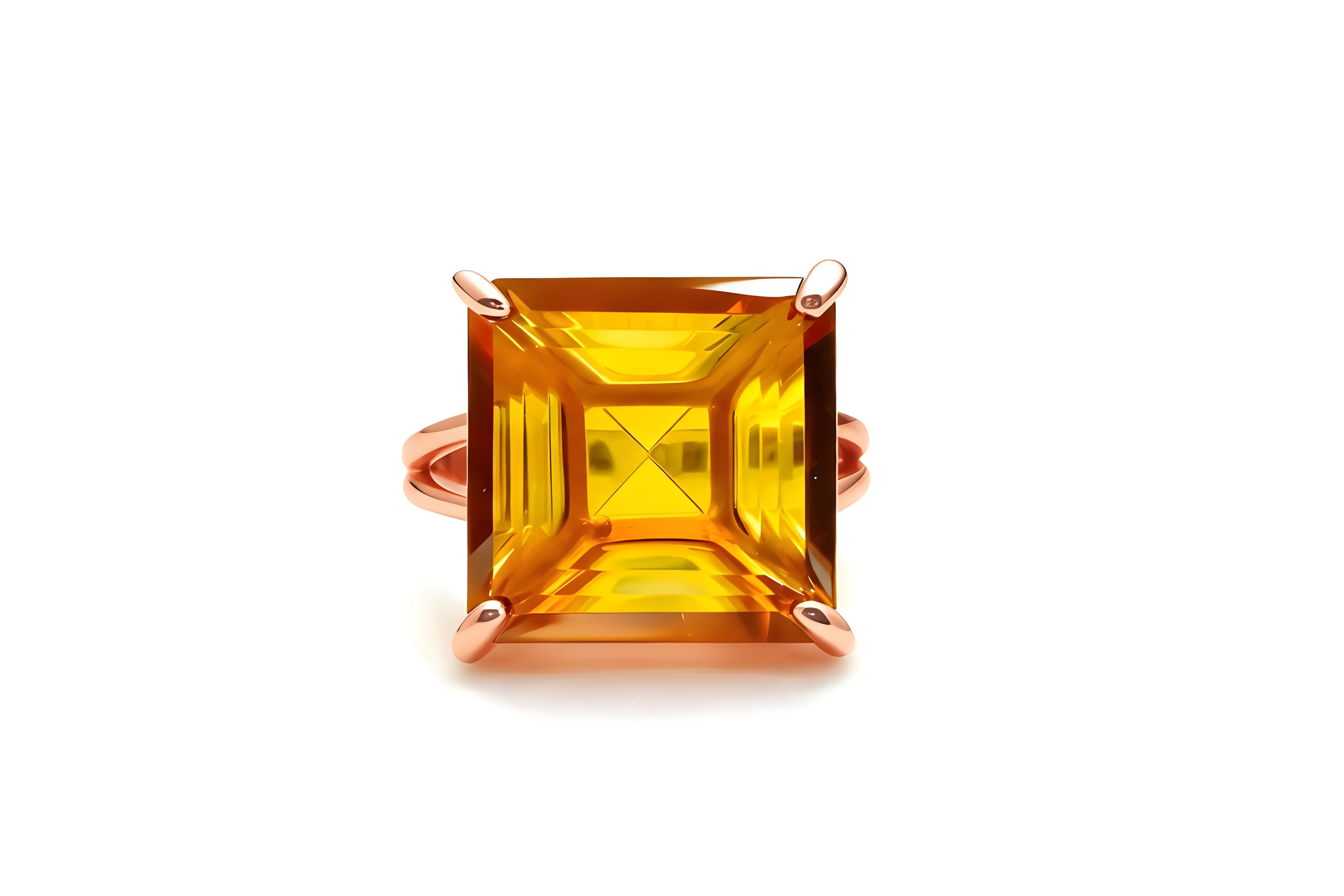 This 14k rose gold citrine ring showcases a faceted square-cut gemstone in a prong setting, radiating vivid orange warmth. Known as the November birthstone, citrine symbolizes energy, joy, and prosperity. The large gemstone and polished rose gold band create a bold yet refined statement. Handcrafted with care, this cocktail-style ring is perfect for women who love distinctive gemstone jewelry and makes an elegant gift for special occasions.