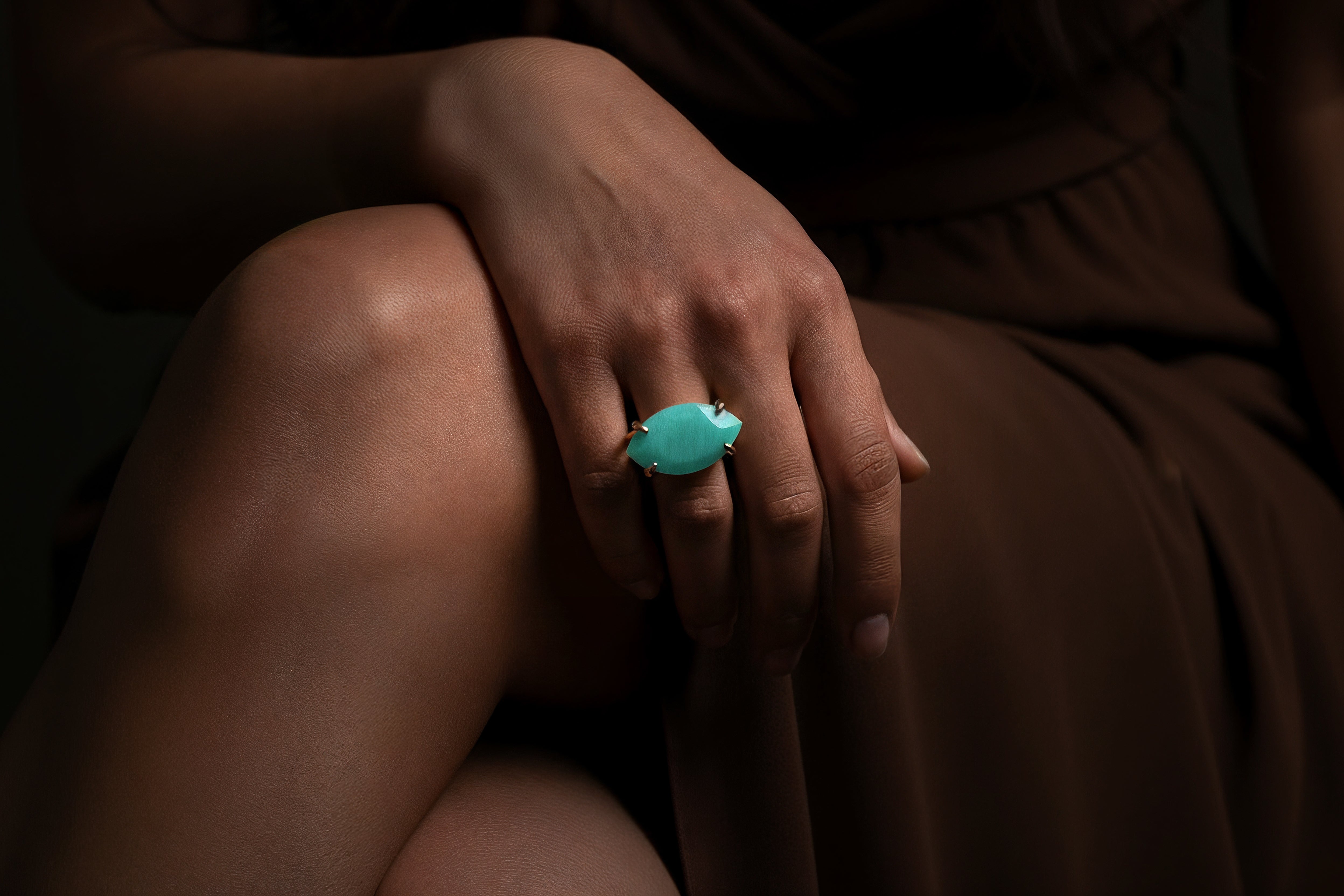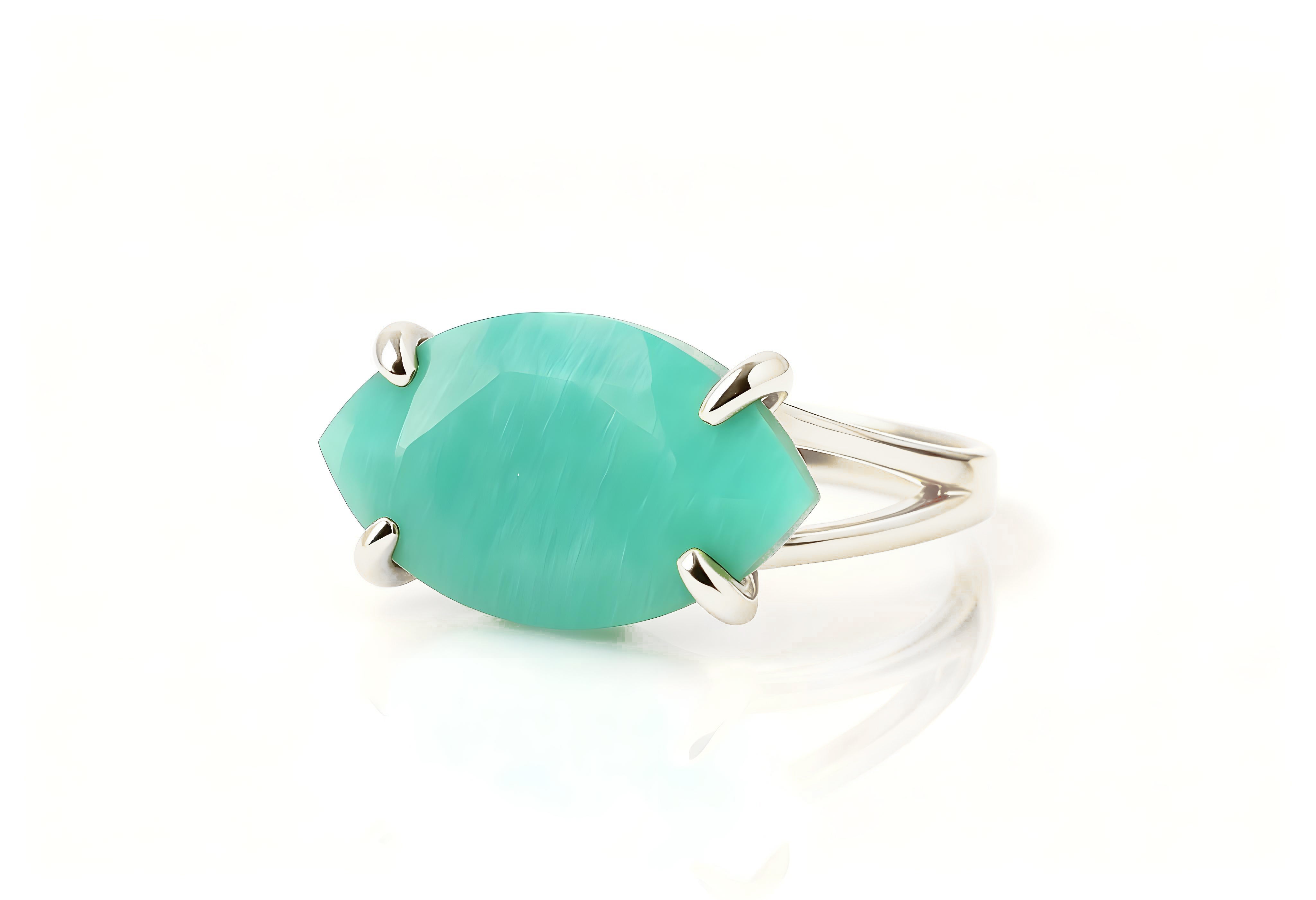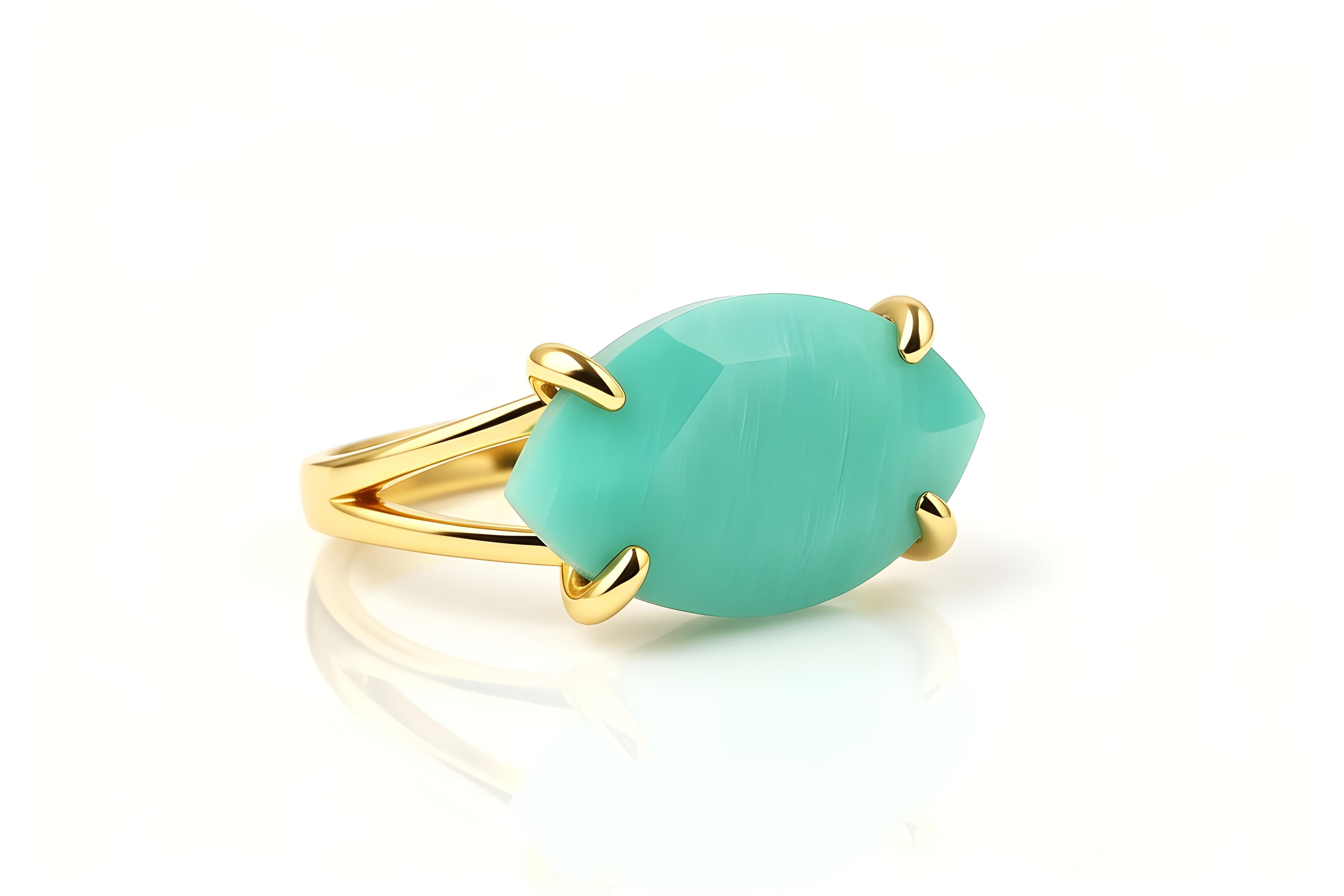 This marquise cut amazonite ring showcases a soothing green gemstone set in a radiant 14k gold filled band. The gemstone’s natural texture and color create a calming yet striking look, complemented by a secure prong setting. Each piece is handcrafted with care to highlight amazonite’s unique character, making it a perfect statement ring for both everyday wear and special occasions.