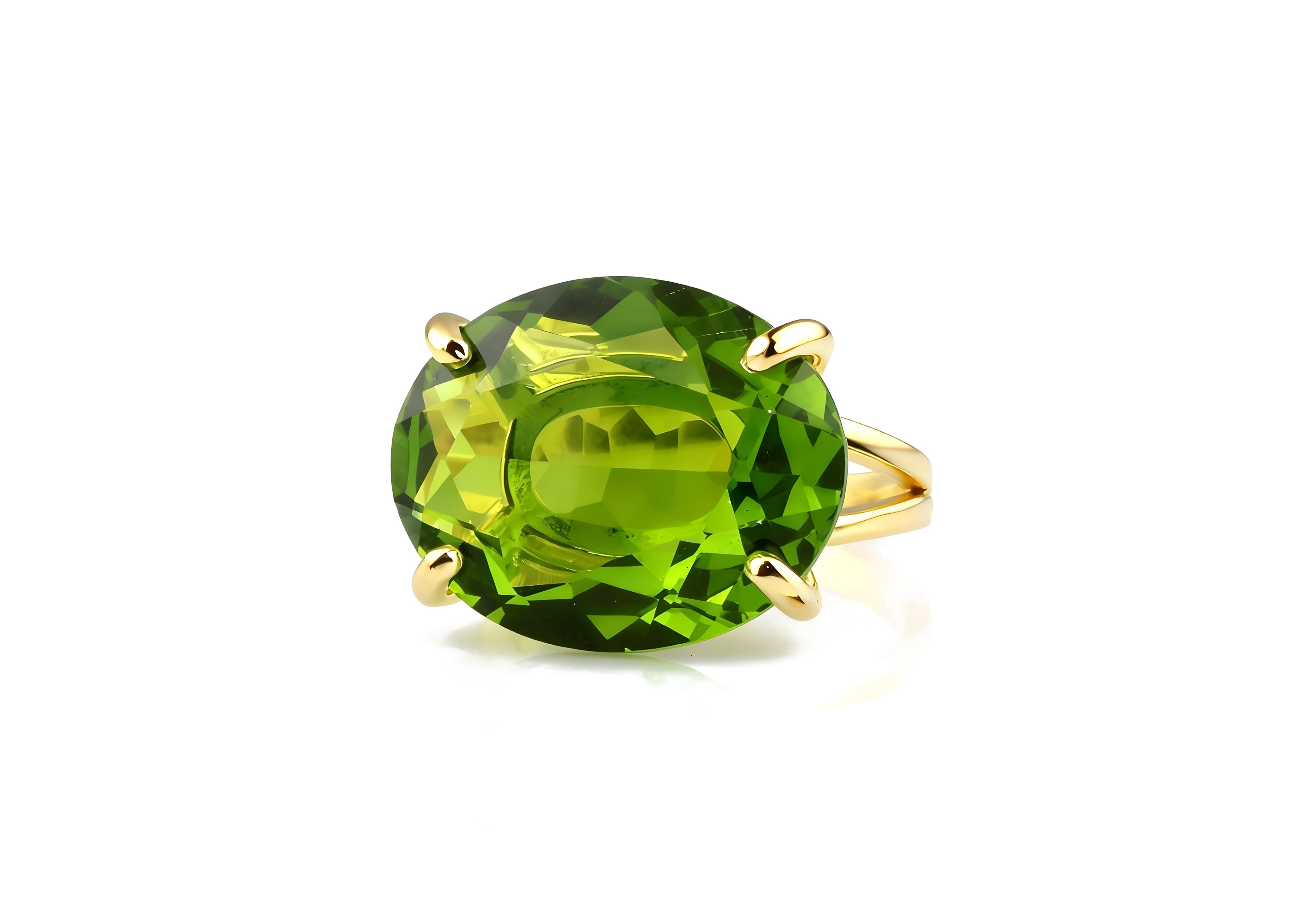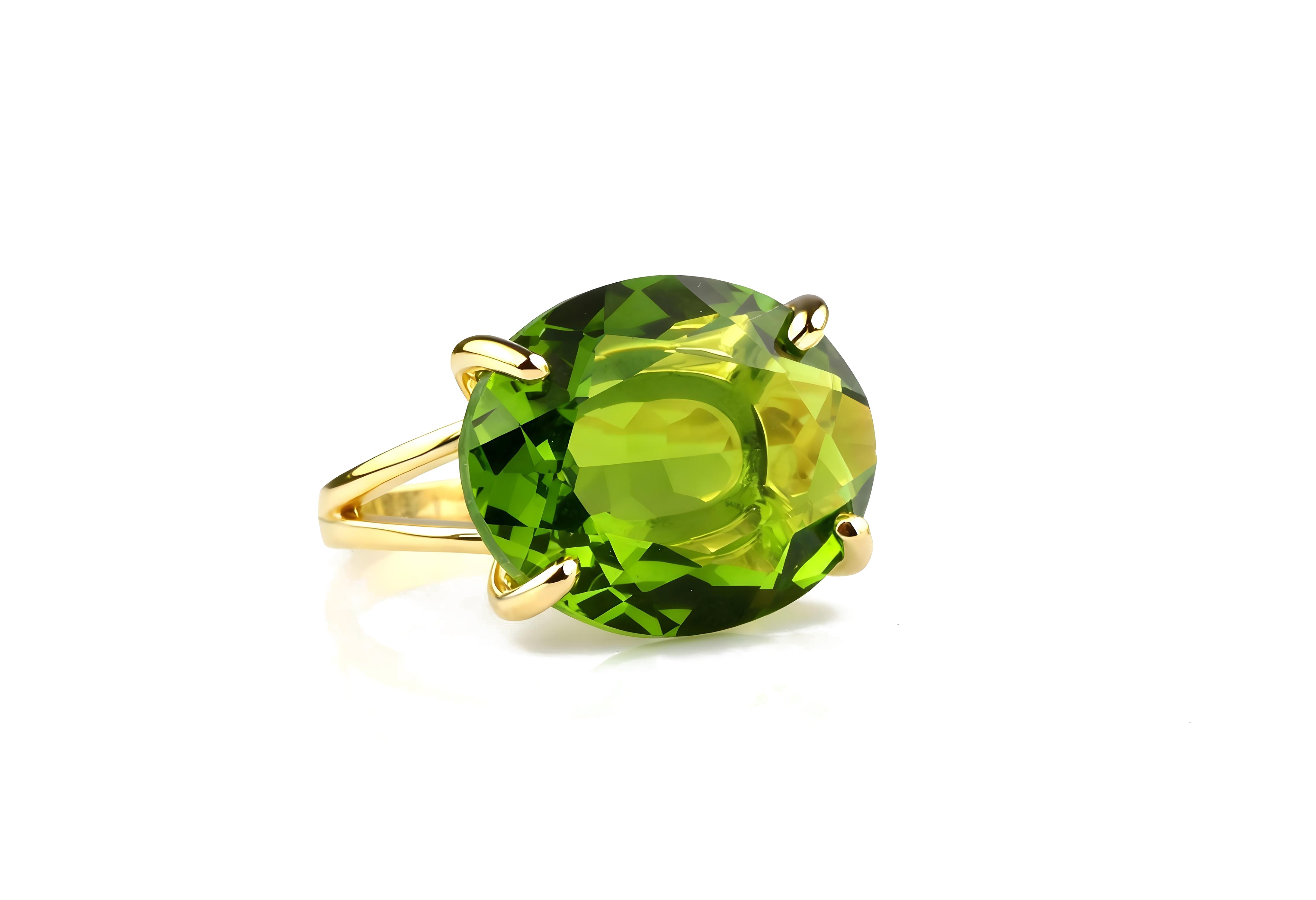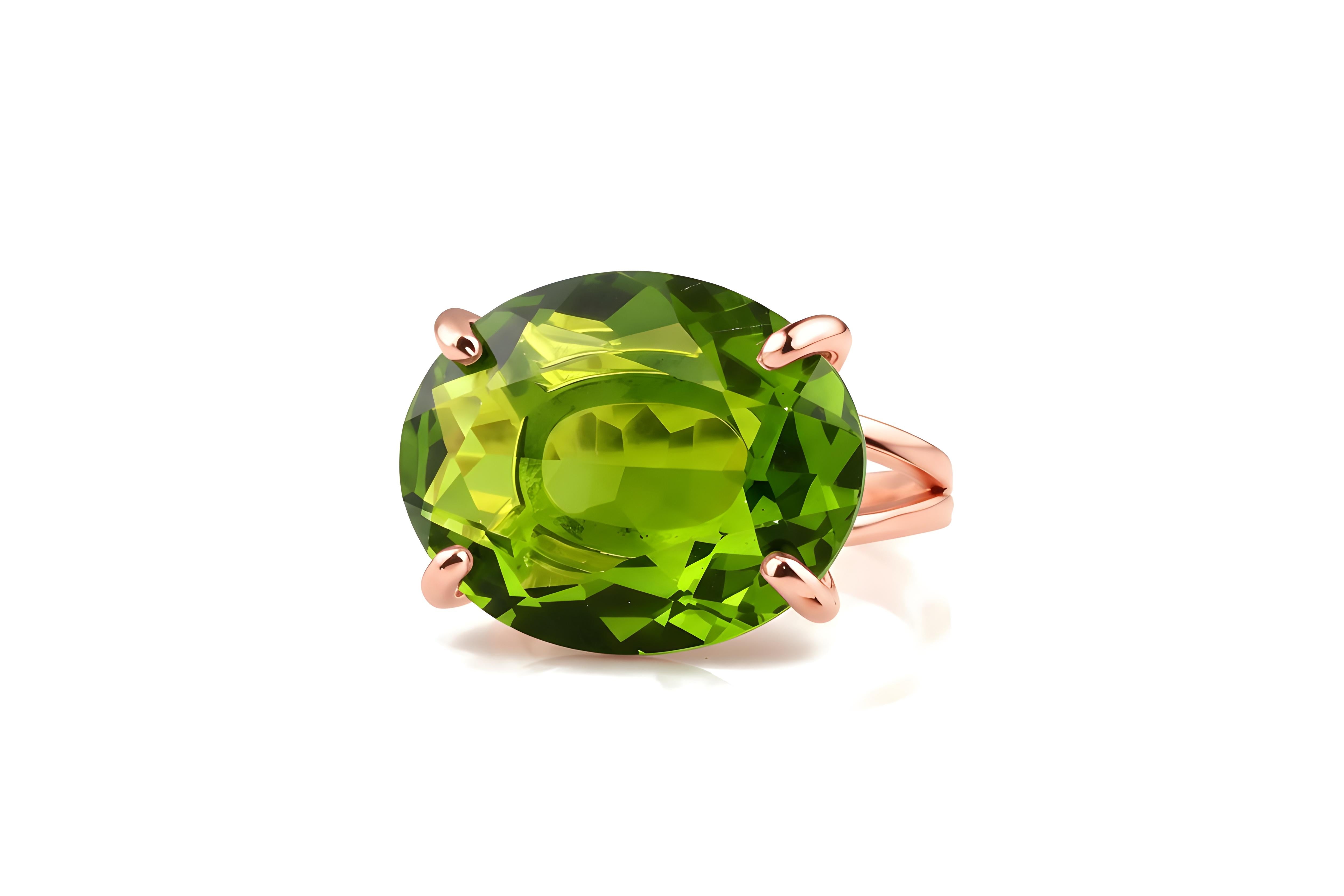 A vivid oval-cut peridot gemstone captures the essence of August’s birthstone with its glowing green hue. The faceted surface enhances light reflection, while the polished 14k gold setting brings warmth and luxury. Designed for those who love bold yet refined jewelry, this ring makes a striking statement while remaining timeless and elegant.