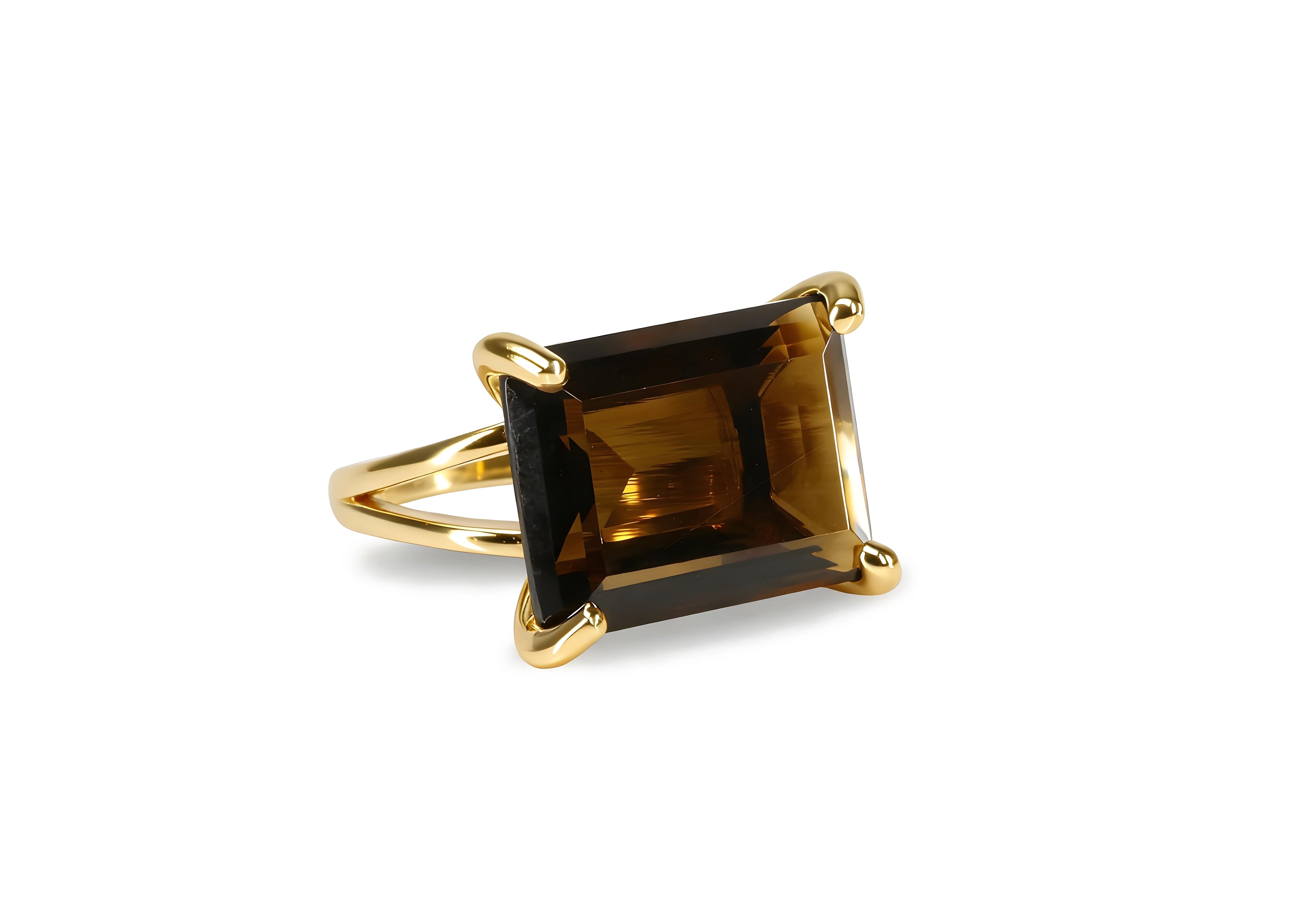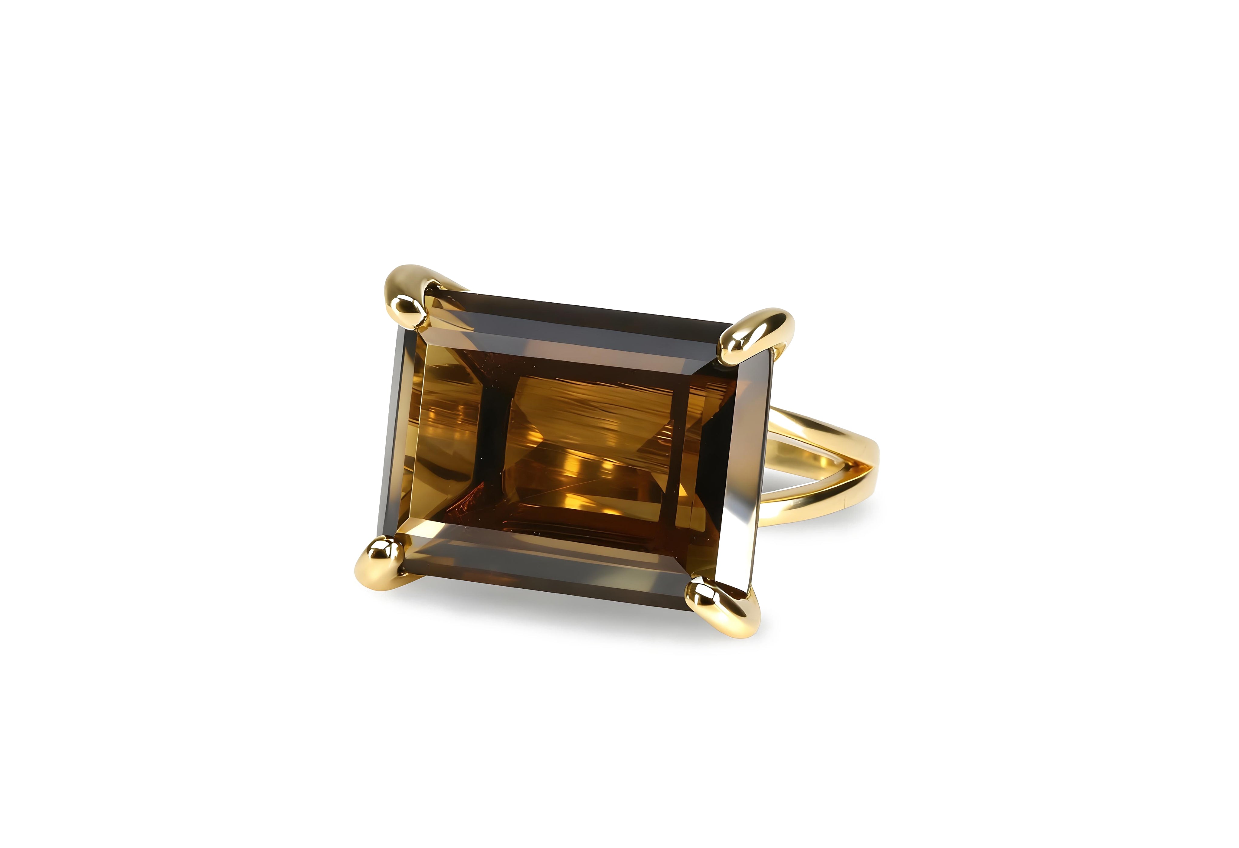 This smoky quartz ring features a horizontal rectangular cut gemstone set in warm 14k gold, blending modern design with classic sophistication. The deep brown hue and clean lines make it a perfect statement piece for any outfit. Ideal as a gift for mom or a self-indulgent treasure, this handmade gemstone ring radiates natural warmth and refined beauty.
