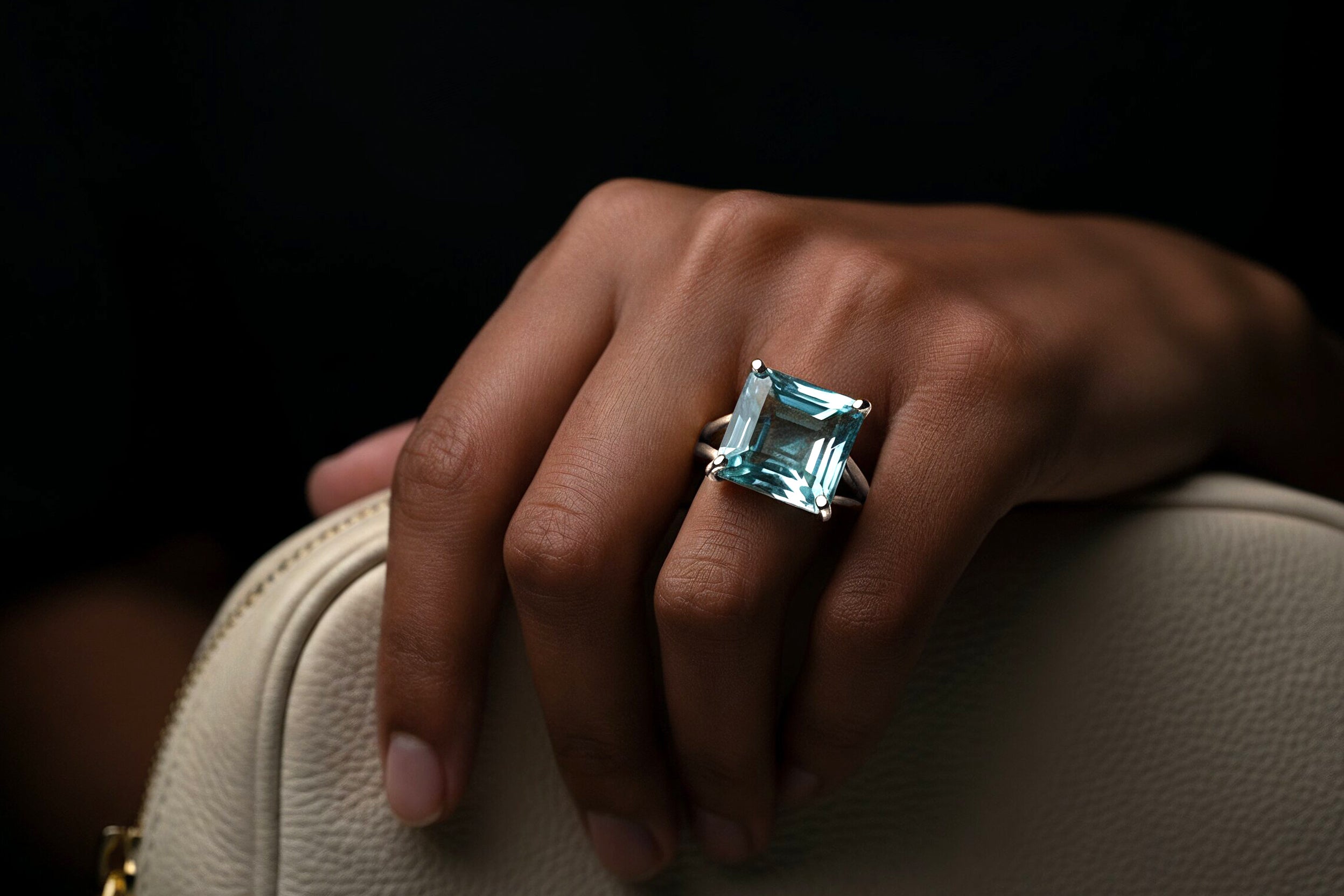 This sterling silver blue topaz ring radiates classic charm with a modern edge. The square-cut gemstone reflects stunning shades of sky blue, beautifully complemented by the polished silver band. Handcrafted with care, this statement piece celebrates timeless elegance, perfect for special occasions or everyday sophistication.