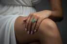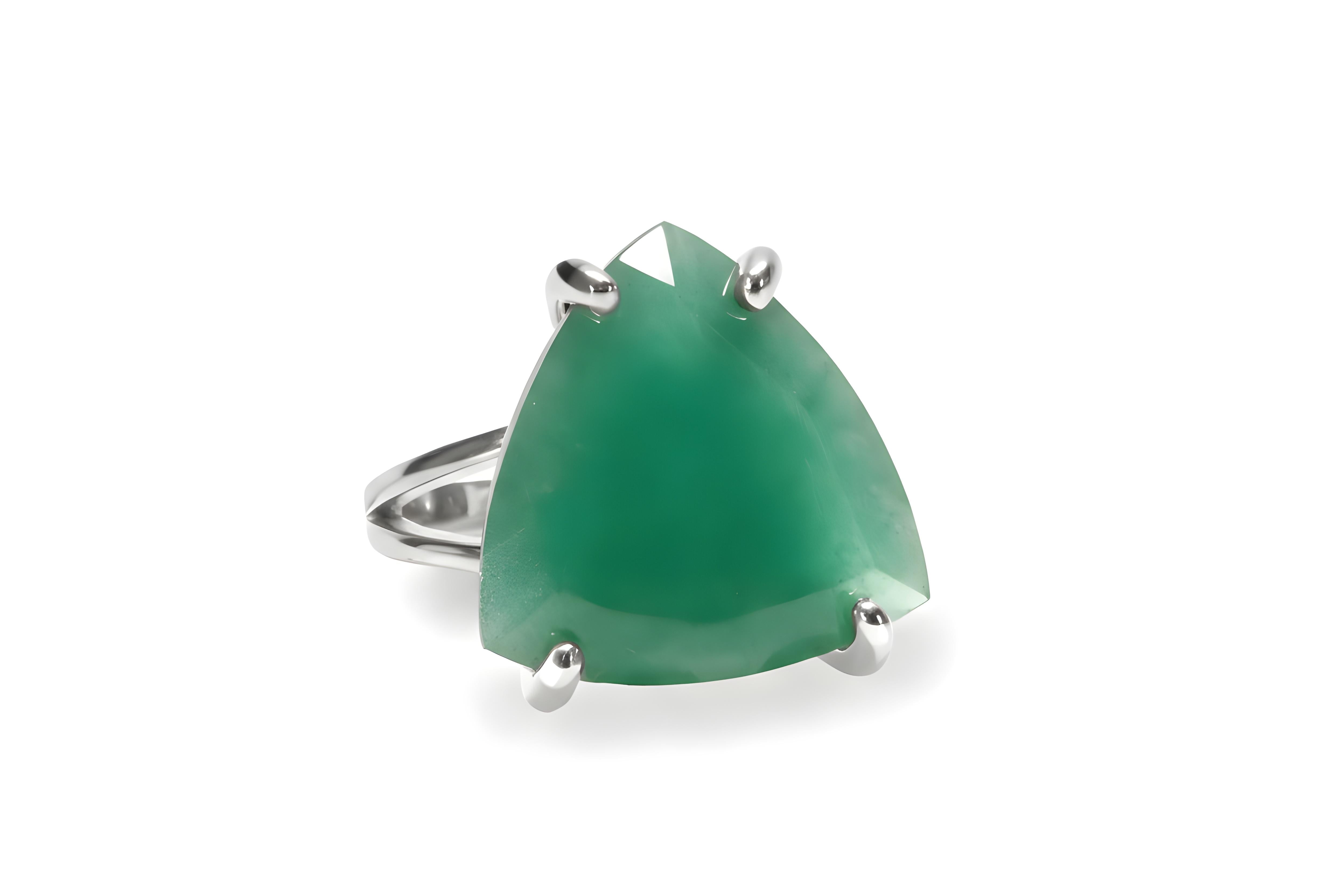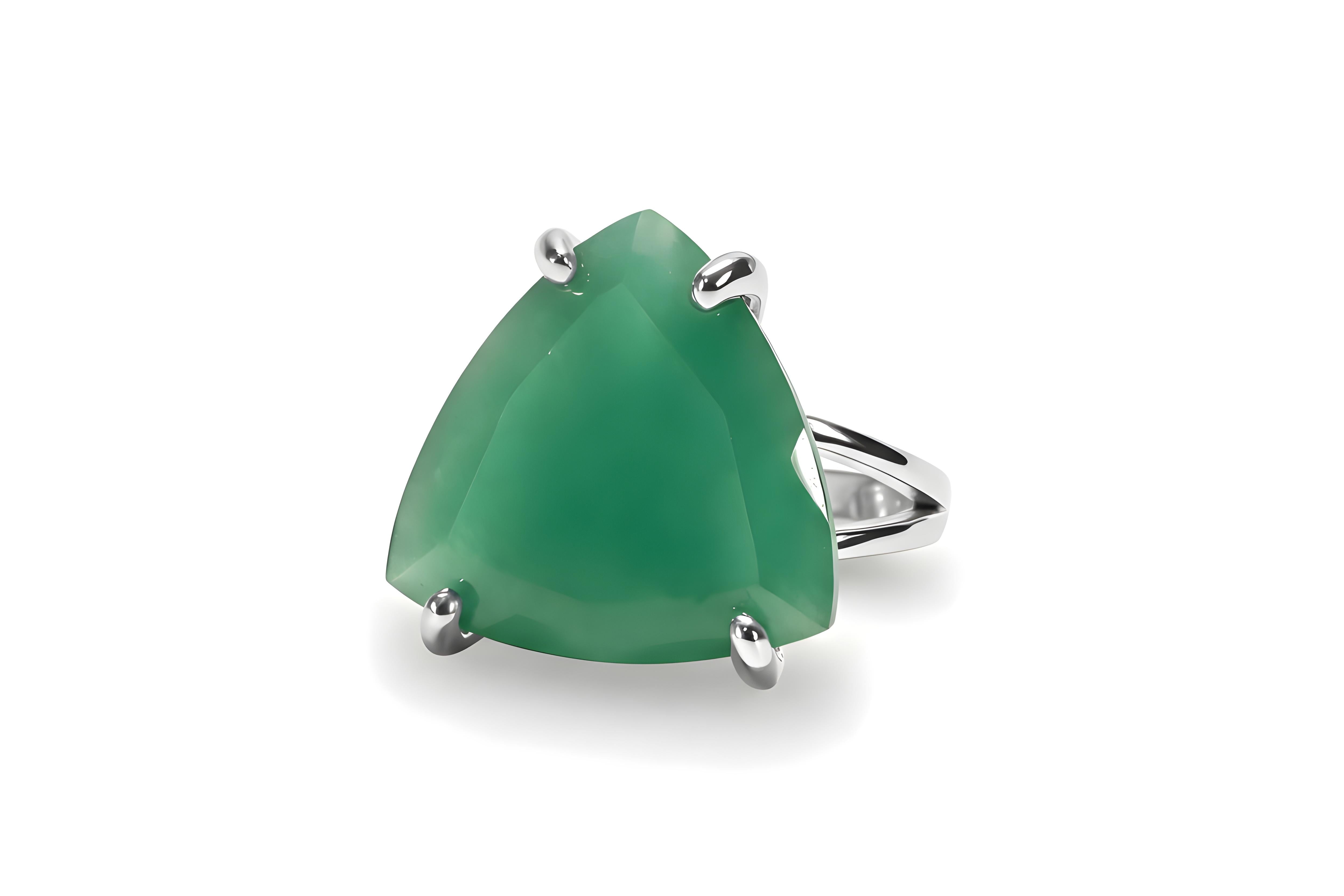Handcrafted in 925 sterling silver, this statement ring showcases a vivid green aventurine gemstone cut in a sharp trillion shape. Its faceted surface reflects the light for a clean and modern finish that complements any style. Each ring is handmade to order and customizable in size and metal type, ensuring a personal and comfortable fit.