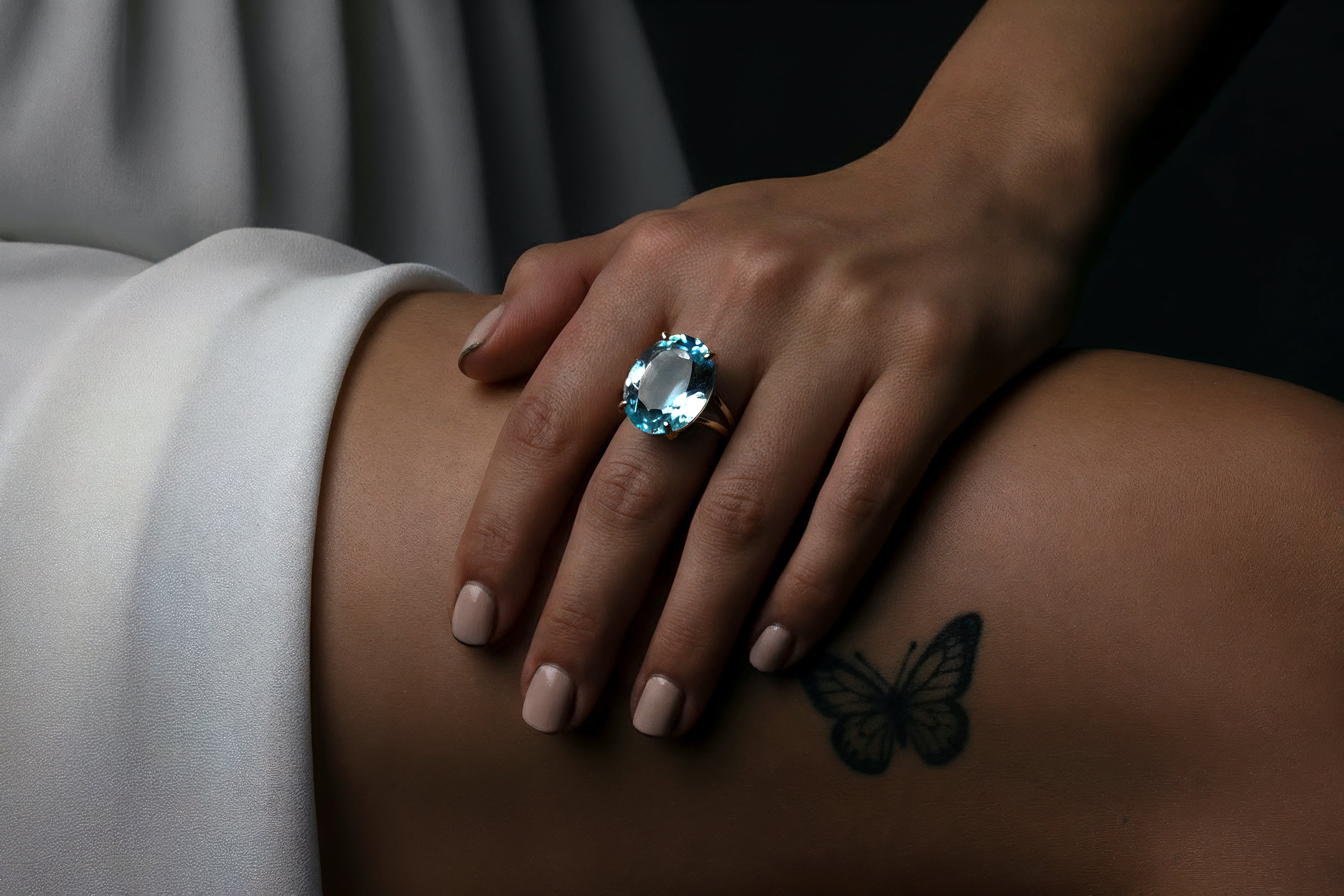 This sterling silver blue topaz ring shines with refined elegance. Featuring an oval-cut faceted topaz in a prong setting, it captures and reflects light beautifully. The handcrafted silver band adds a clean, polished touch, making this statement piece perfect for any occasion — a thoughtful gift for mom or someone special.