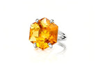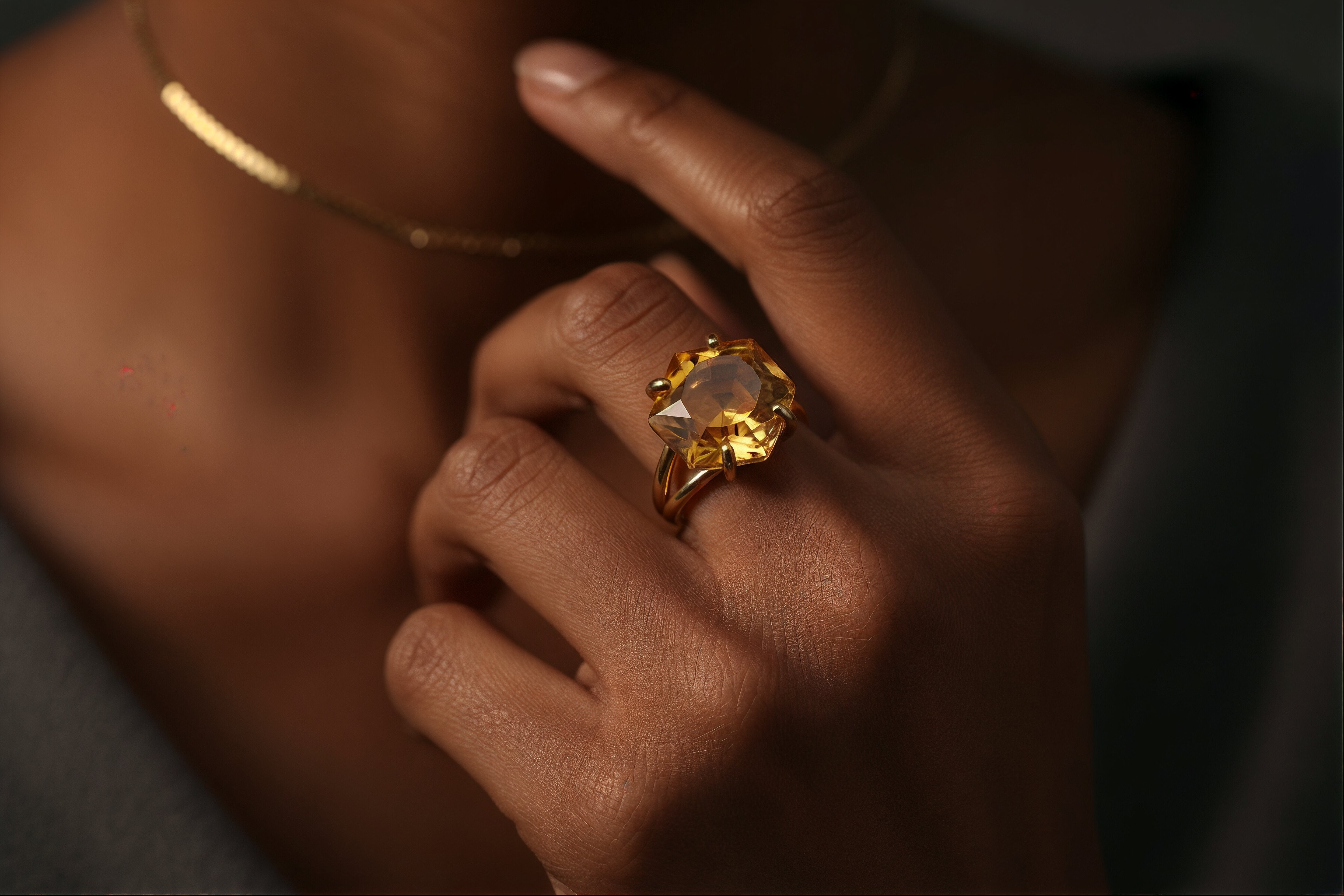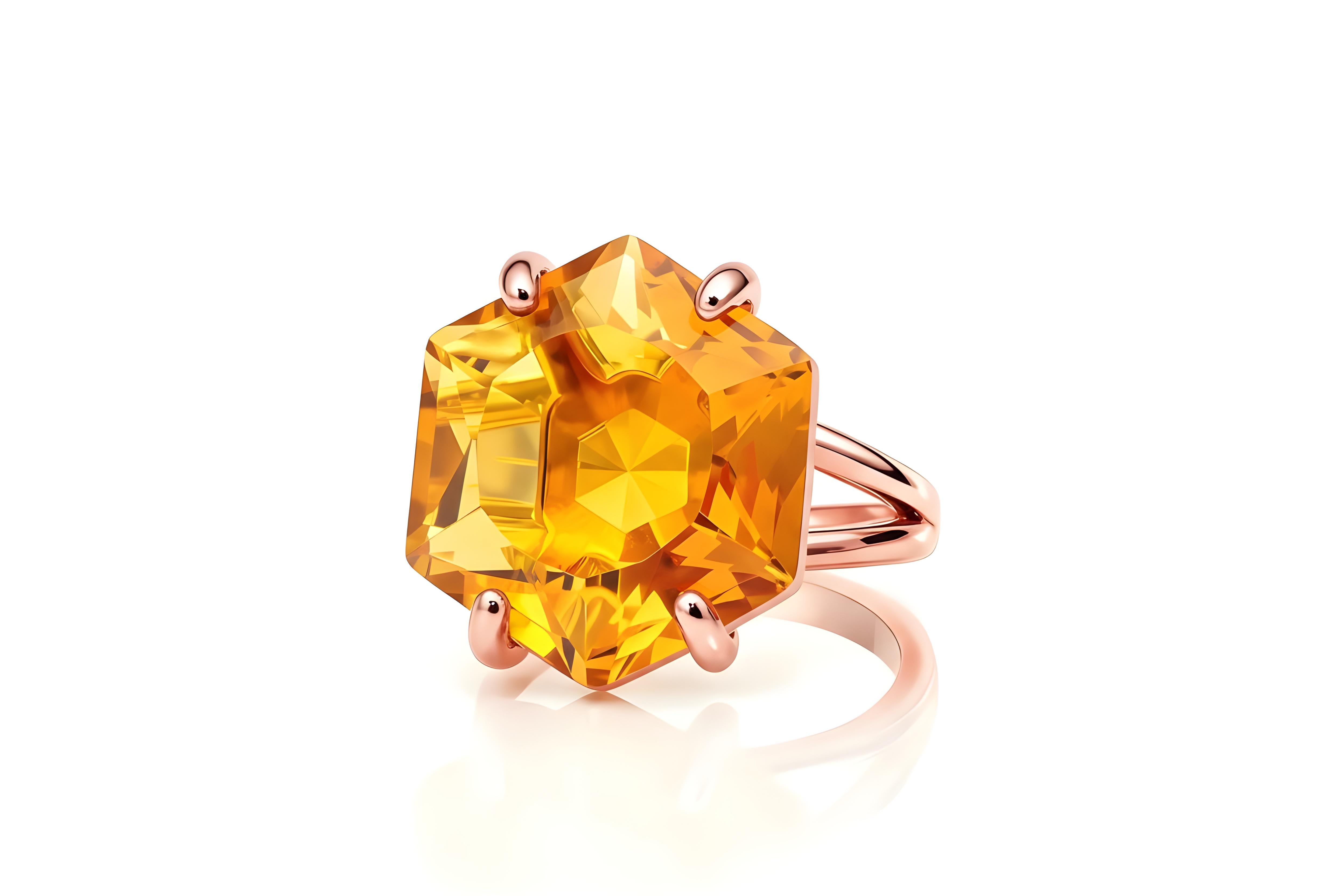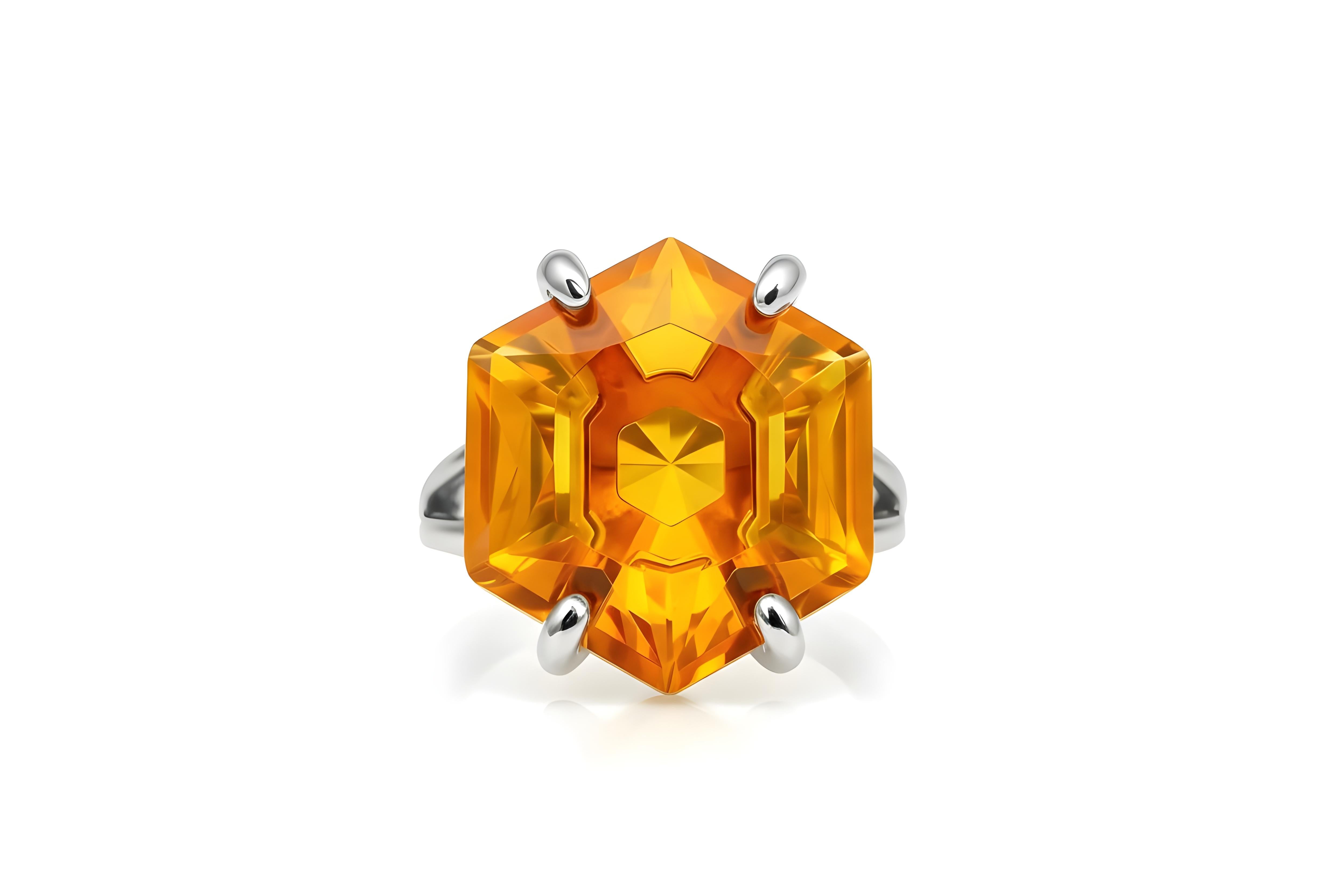 This 925 silver citrine ring features a radiant hexagon-cut gemstone with a smooth rhodium-plated white gold finish for extra shine and durability. The citrine, carefully heated to enhance its natural brilliance, glows with golden tones that represent warmth, abundance, and positivity. Handcrafted with care, this gemstone ring is elegant, refined, and perfect as a statement cocktail ring or a meaningful November birthstone gift.