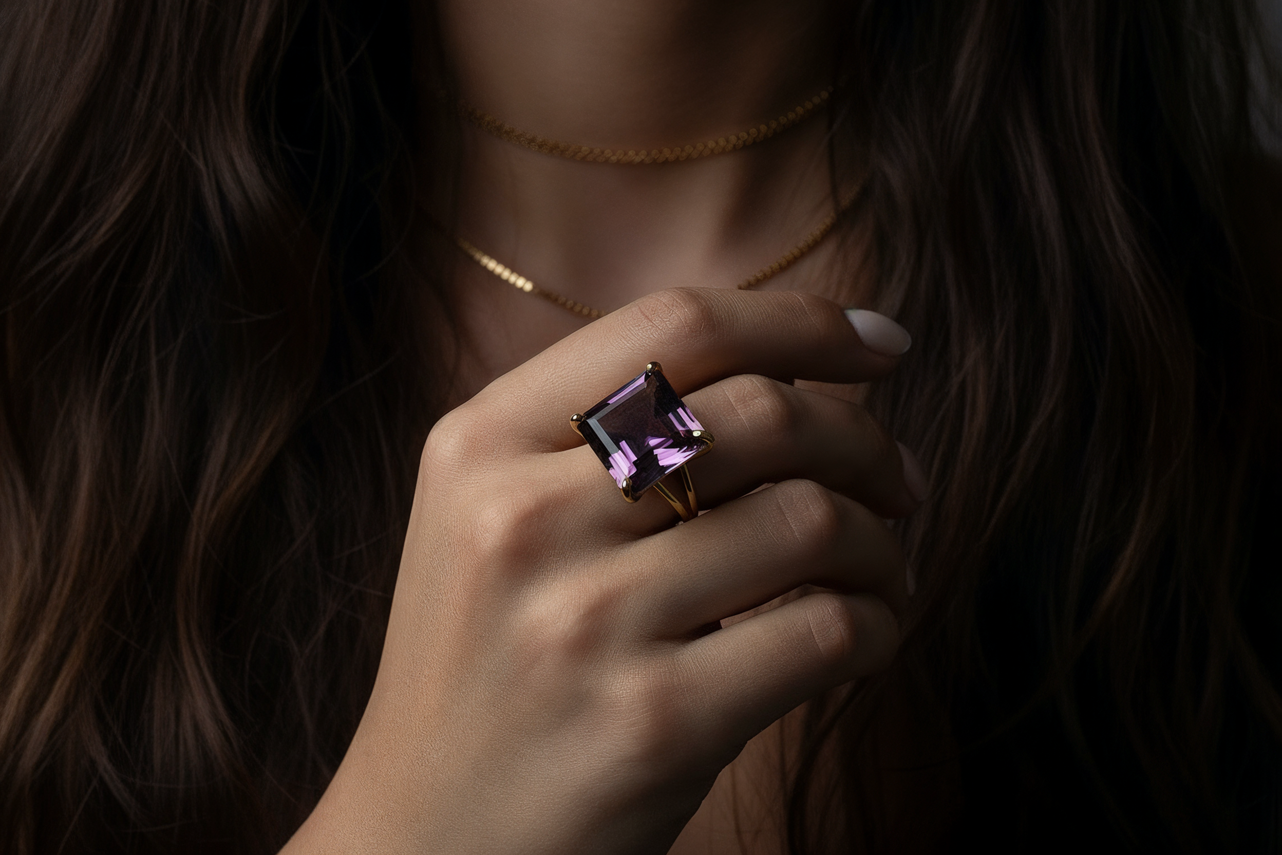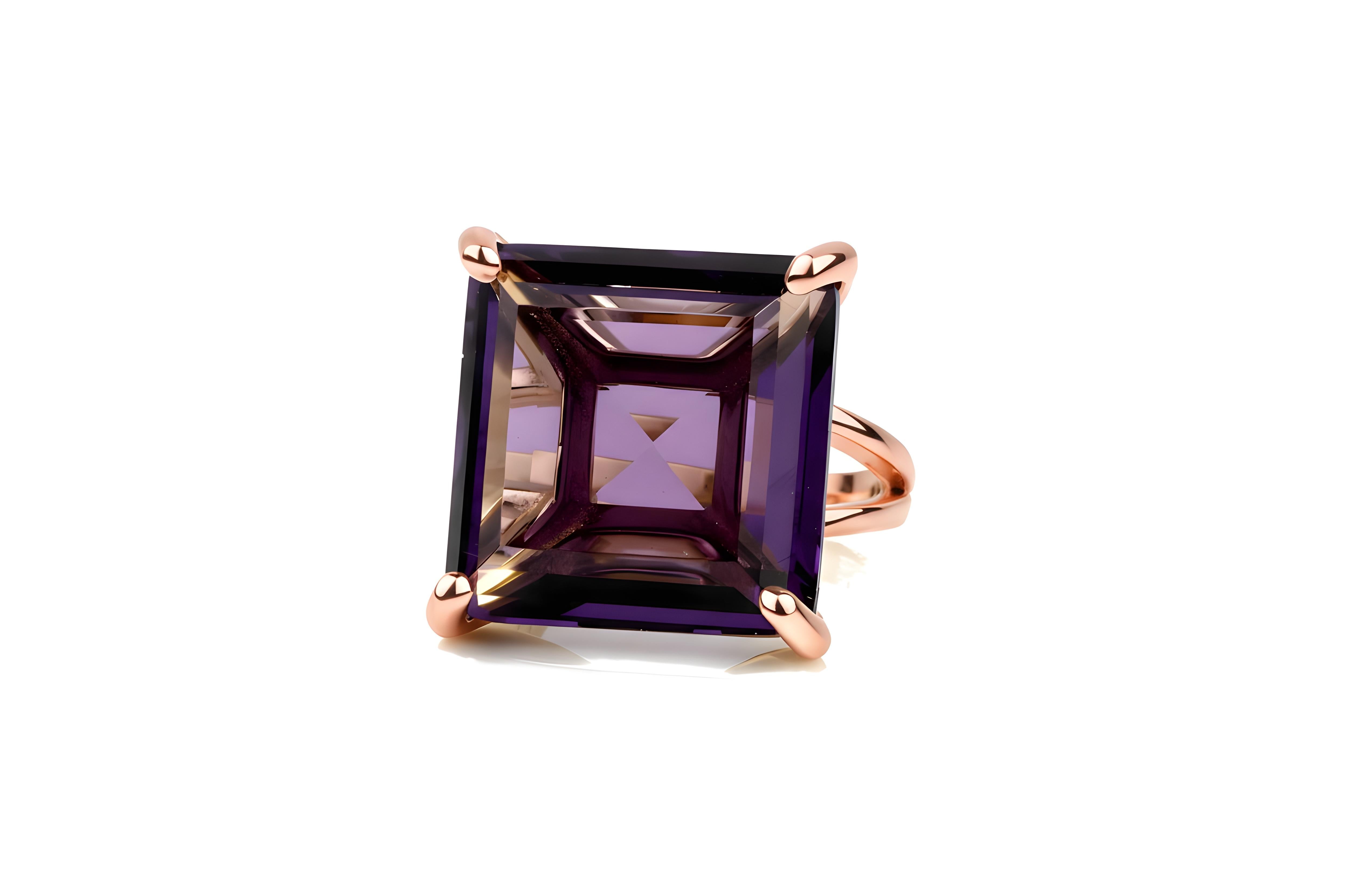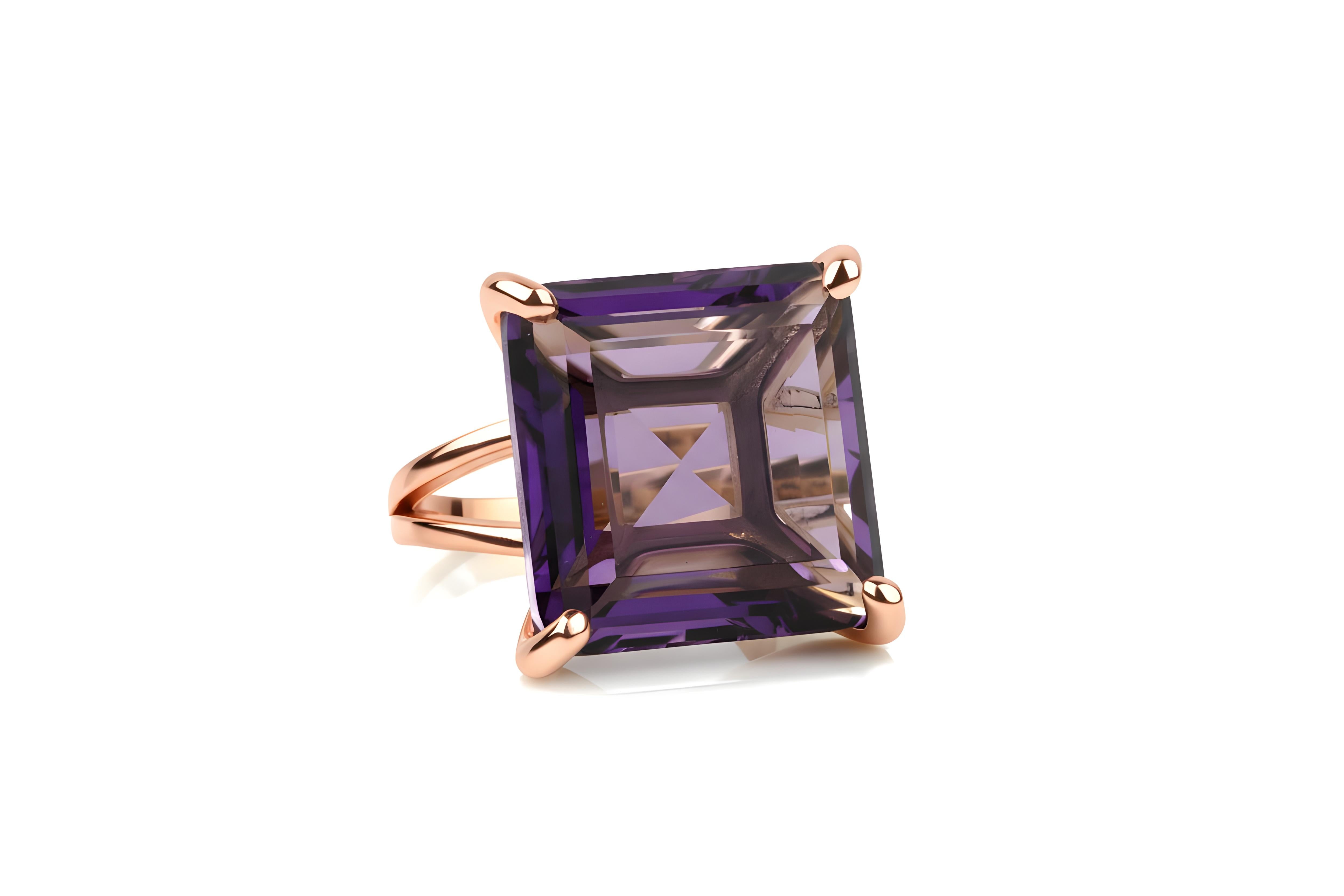 This rose gold filled ring features a captivating square-cut amethyst with a radiant purple tone. The warm rose gold hue complements the gemstone’s brilliance, making it a striking choice for everyday wear or gifting. Handcrafted with precision, it’s perfect as a February birthstone, promise, or statement ring.
