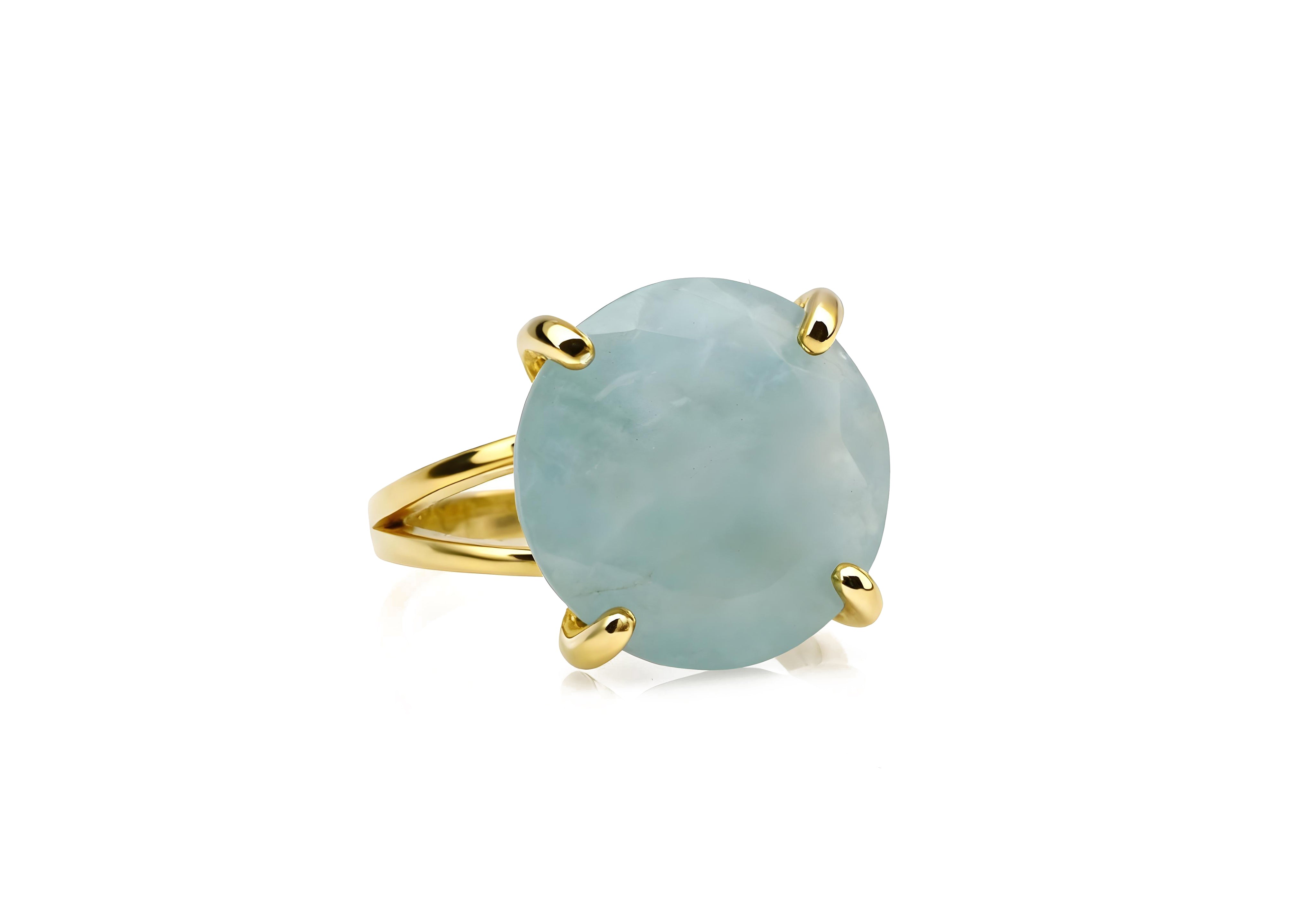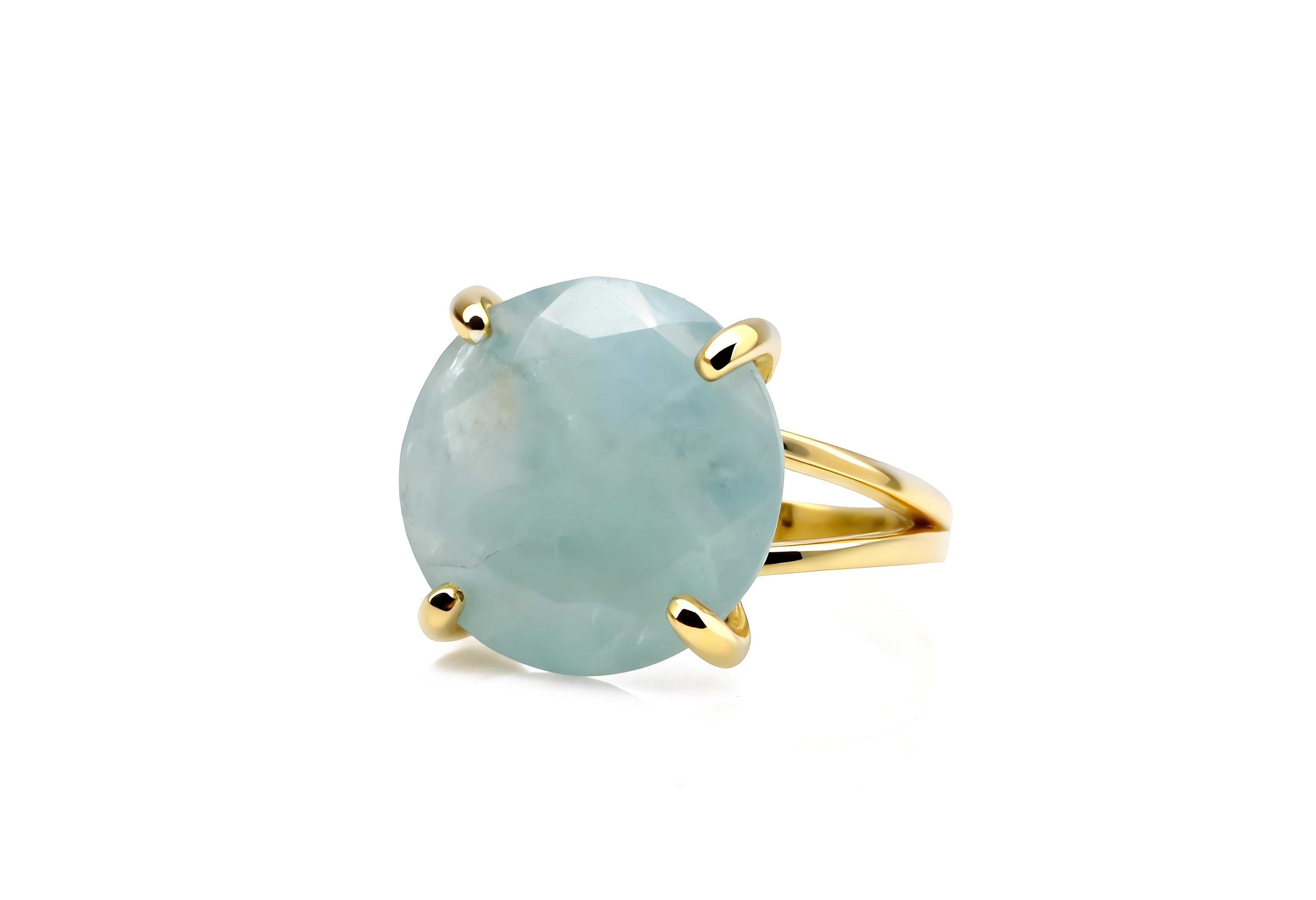 This handcrafted gold ring showcases a luminous aquamarine gemstone with soft, ocean-inspired hues. The faceted round cut reflects a gentle sparkle, while the sleek split band adds a touch of modern balance. Each ring is made to order, customizable in both size and metal type, and polished to a mirror shine for lasting beauty.