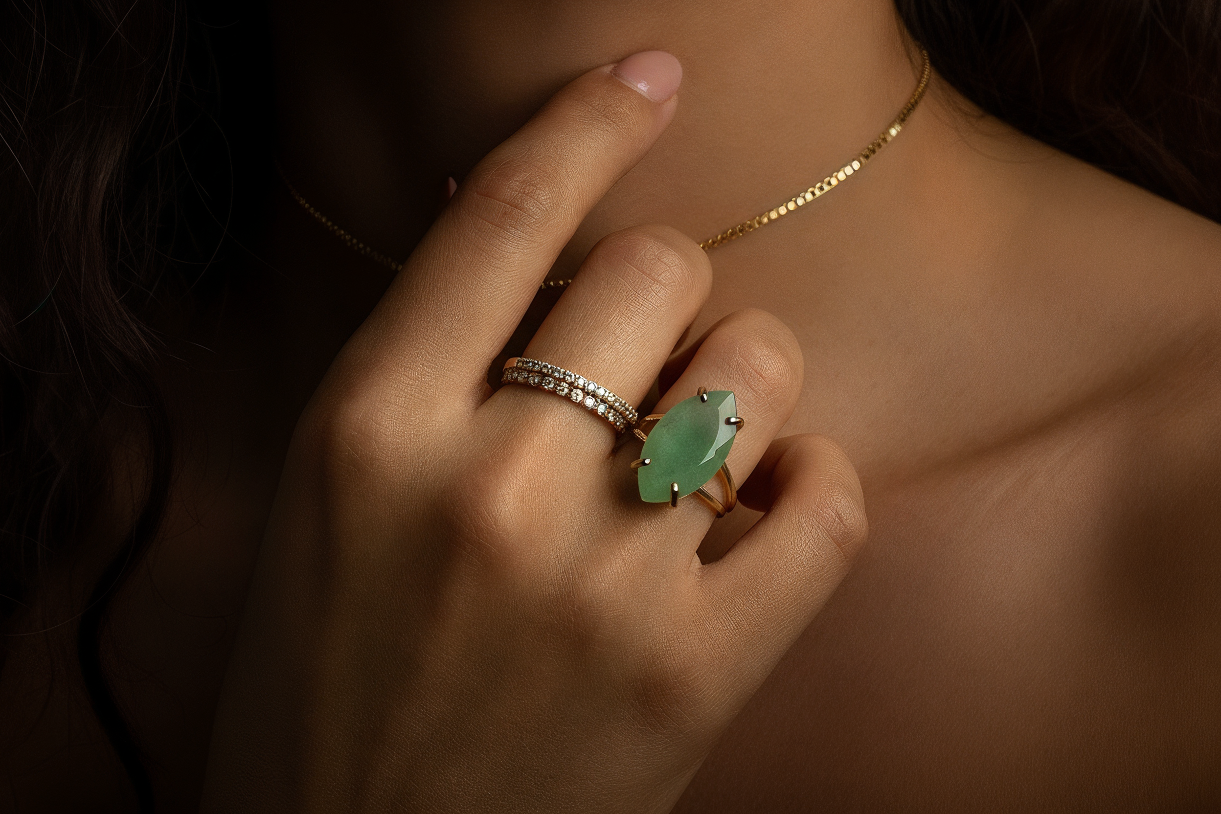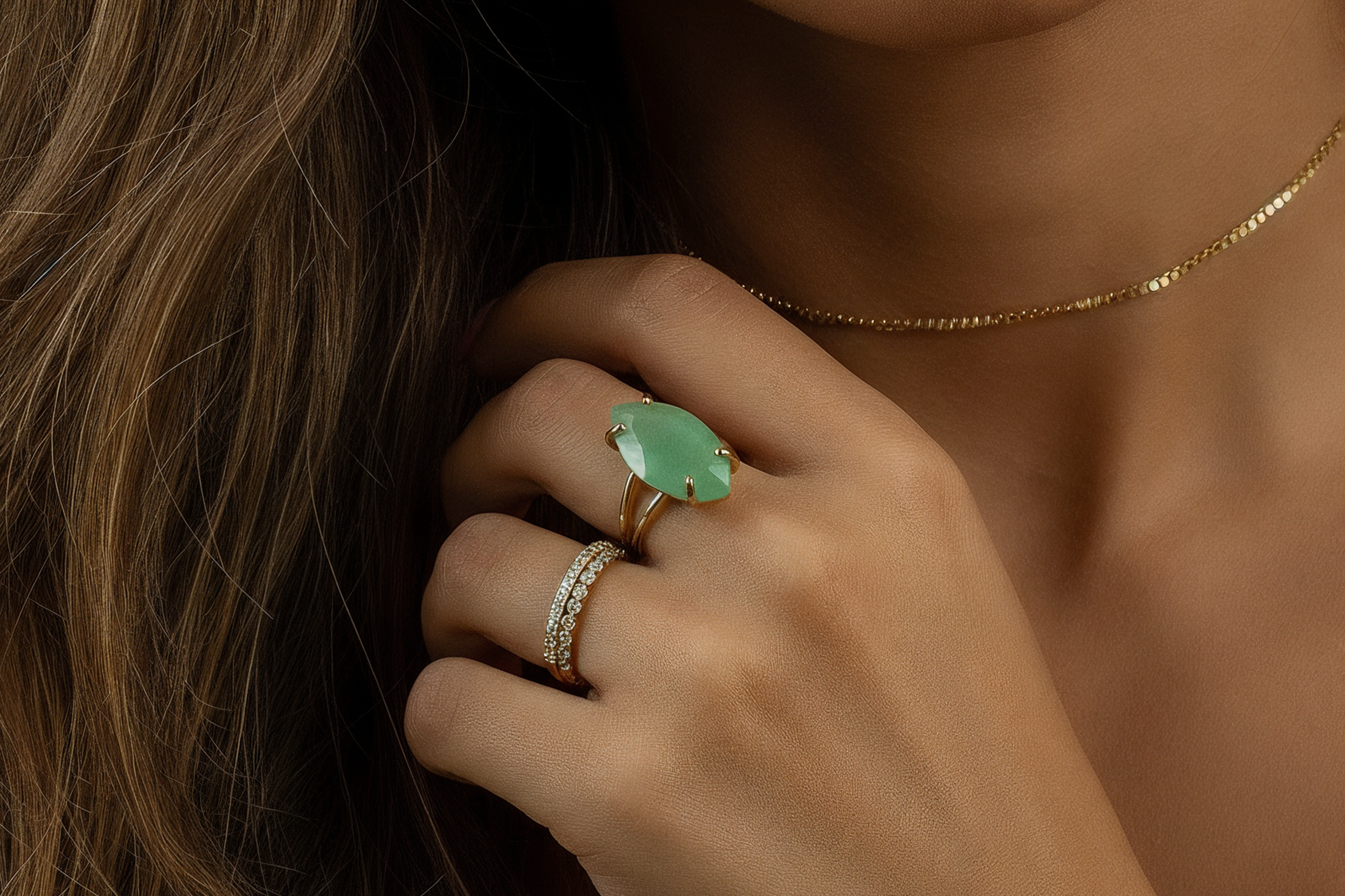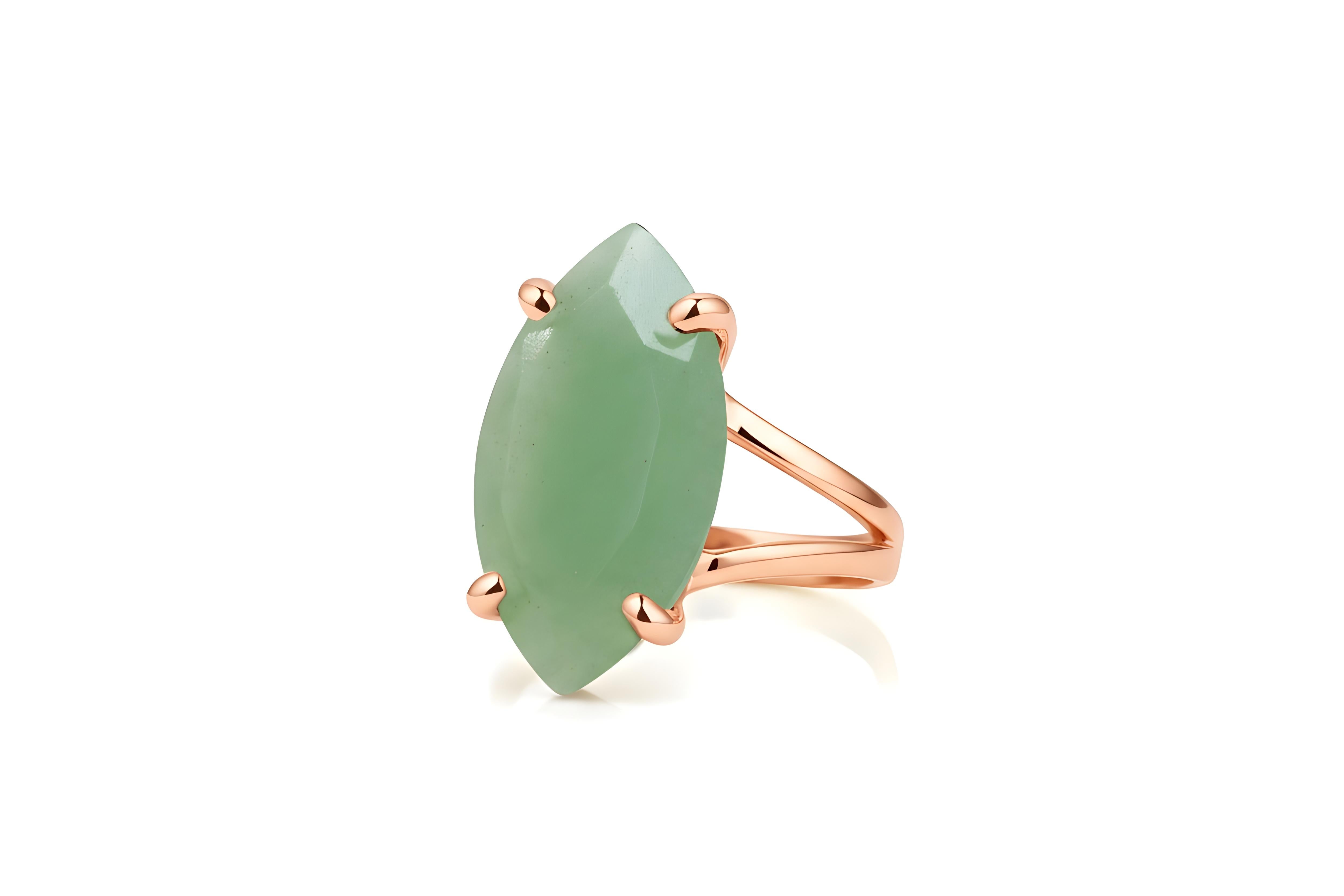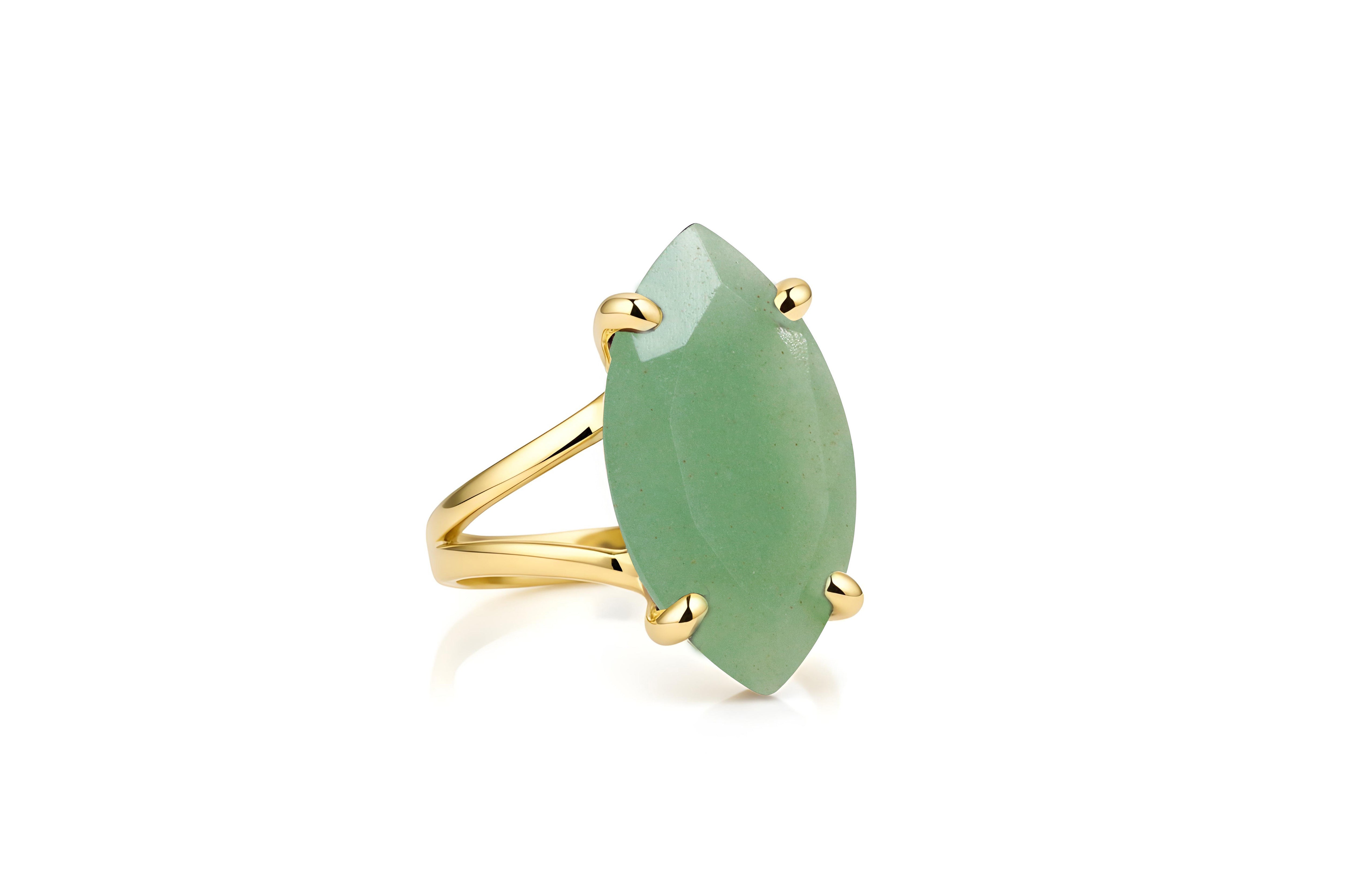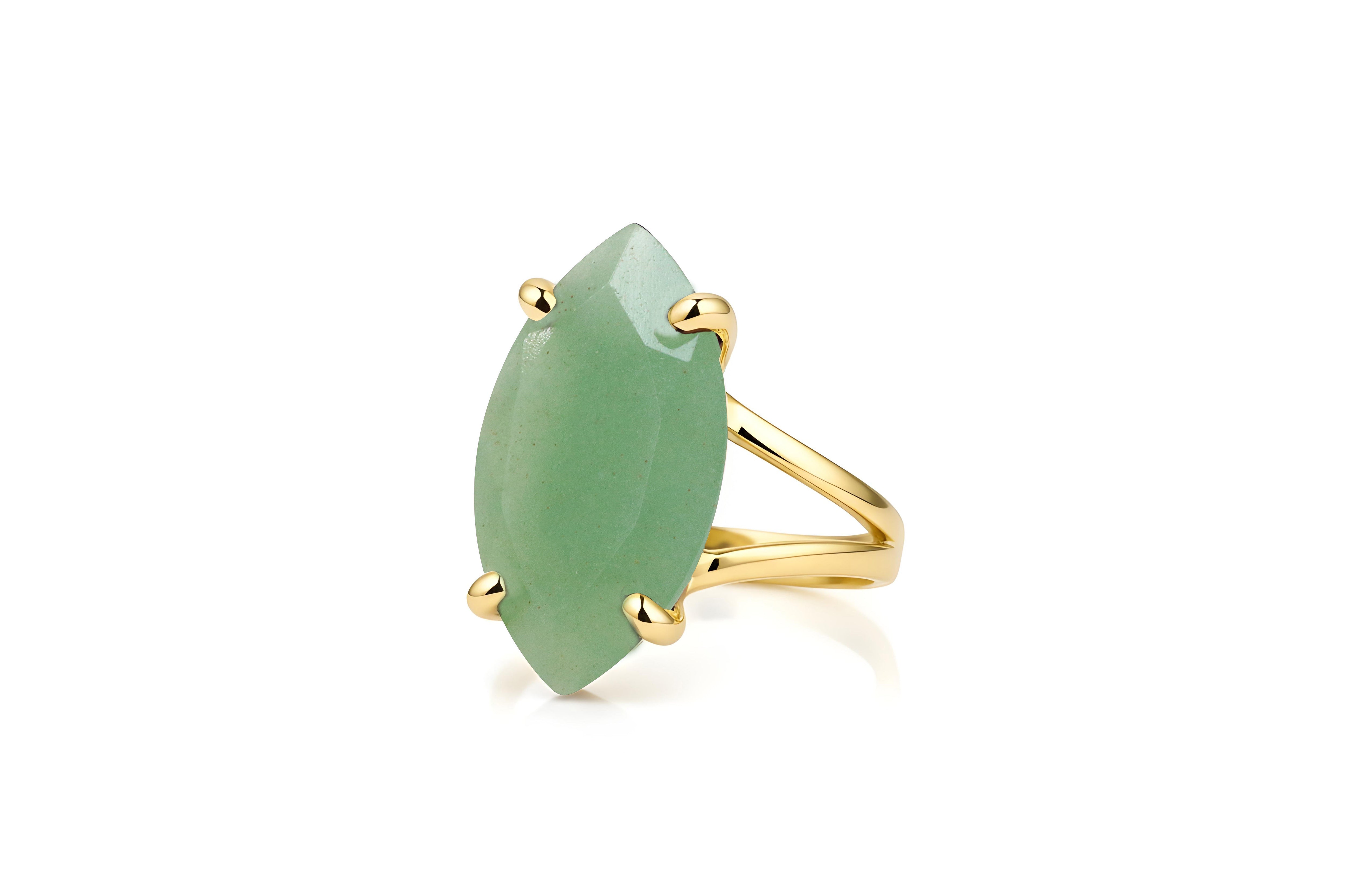 This marquise aventurine ring is crafted in 14k gold filled metal, featuring a smooth green gemstone that radiates natural serenity. The sleek prong setting and modern double band make it a versatile statement piece that balances elegance and organic charm — ideal for women who love refined, nature-inspired jewelry.