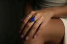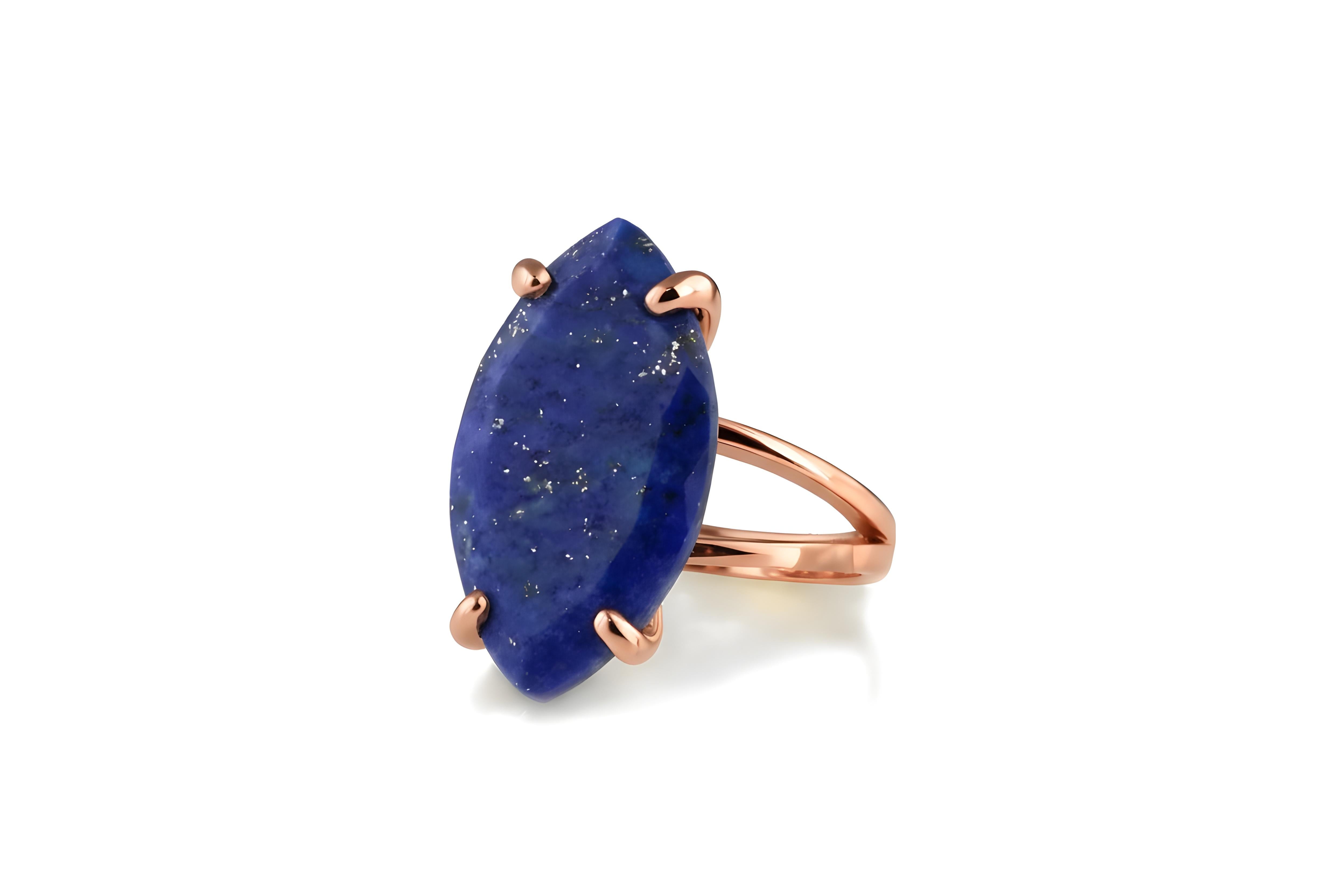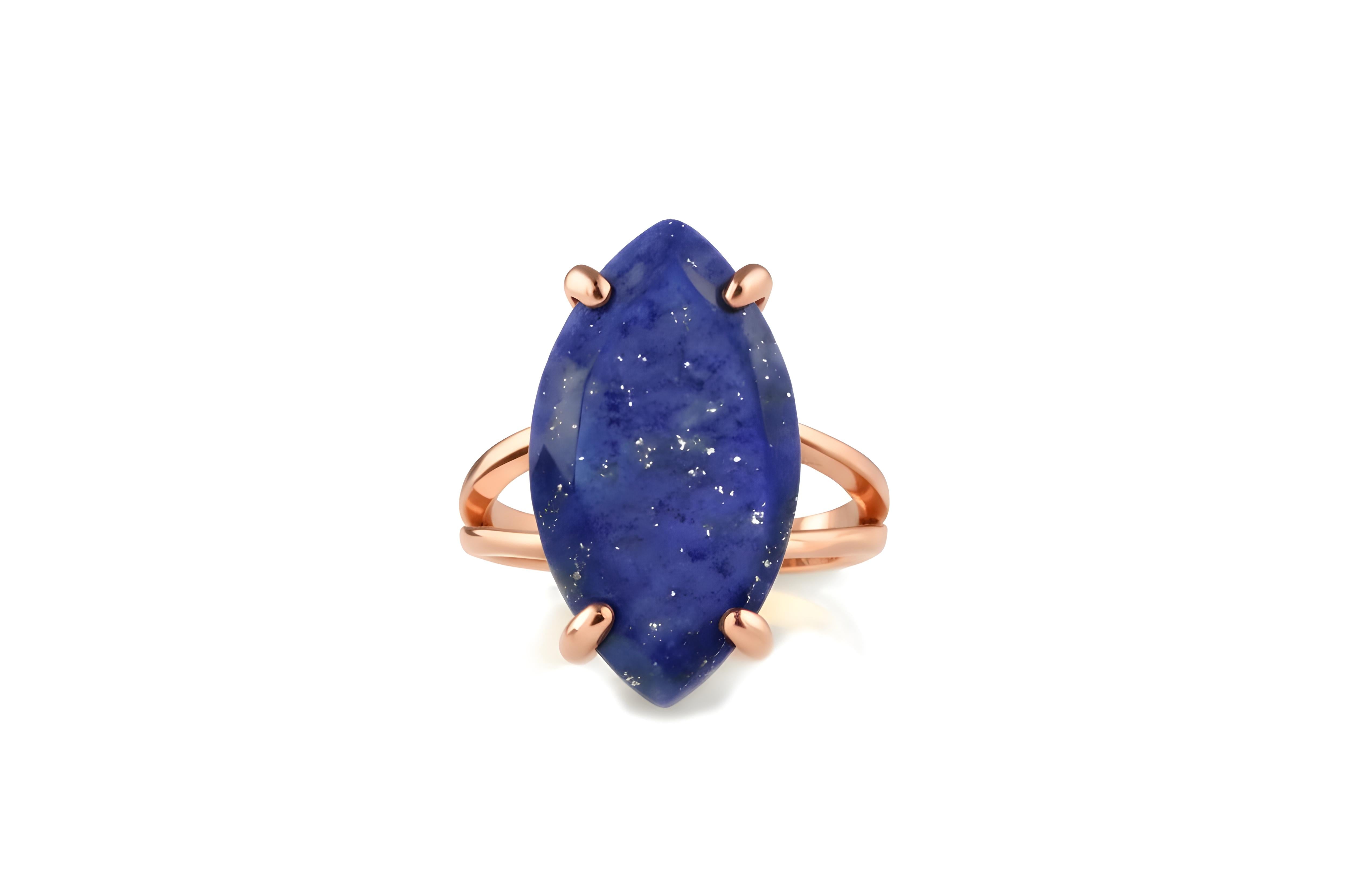 This exquisite rose gold ring features a faceted marquise-cut lapis lazuli, shimmering with natural golden pyrite inclusions that resemble a night sky full of stars. Set in a polished rose gold band, it’s a modern yet timeless piece celebrating September’s birthstone — symbolizing wisdom, balance, and truth. Perfect for both everyday wear and special occasions.