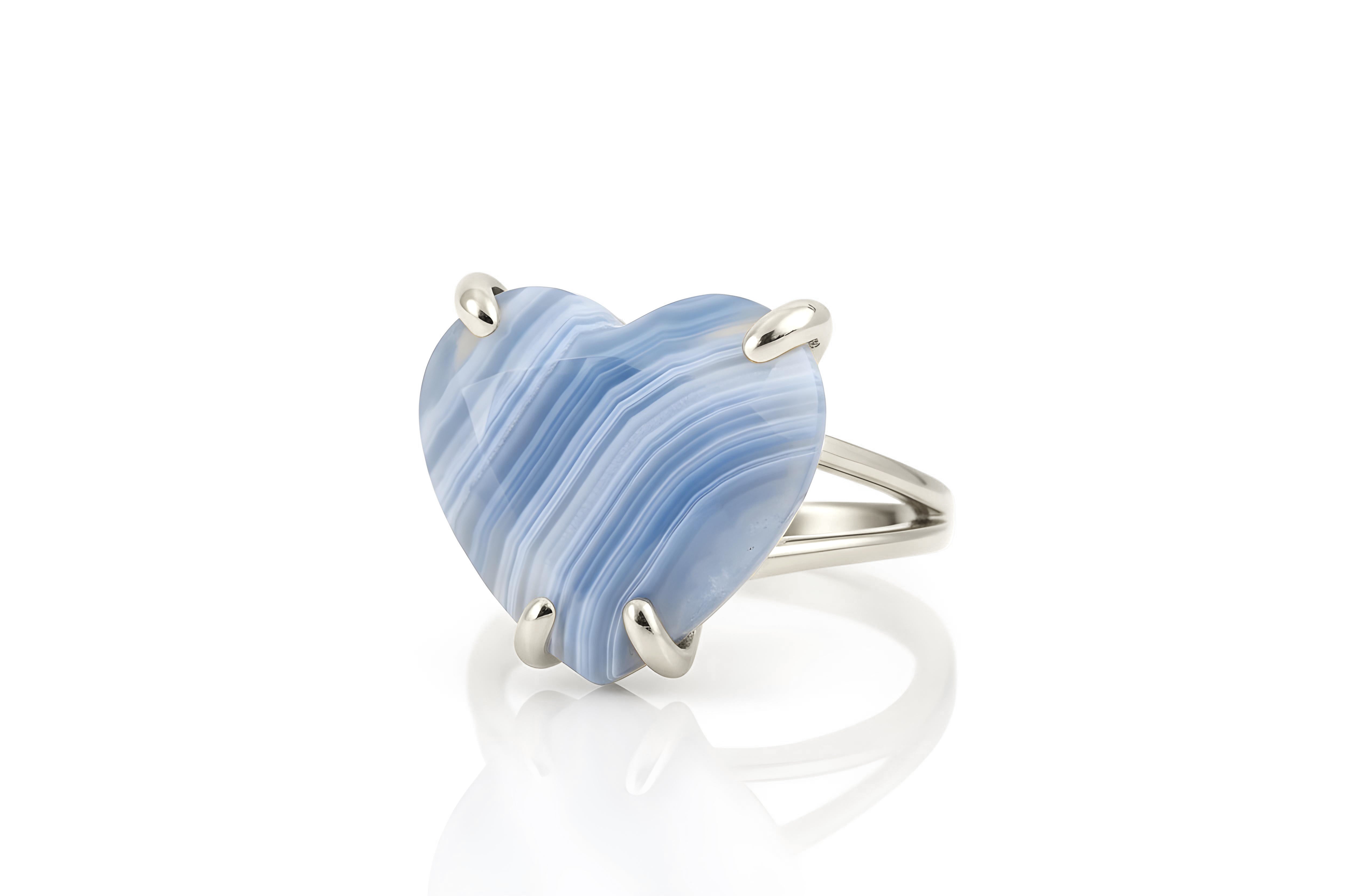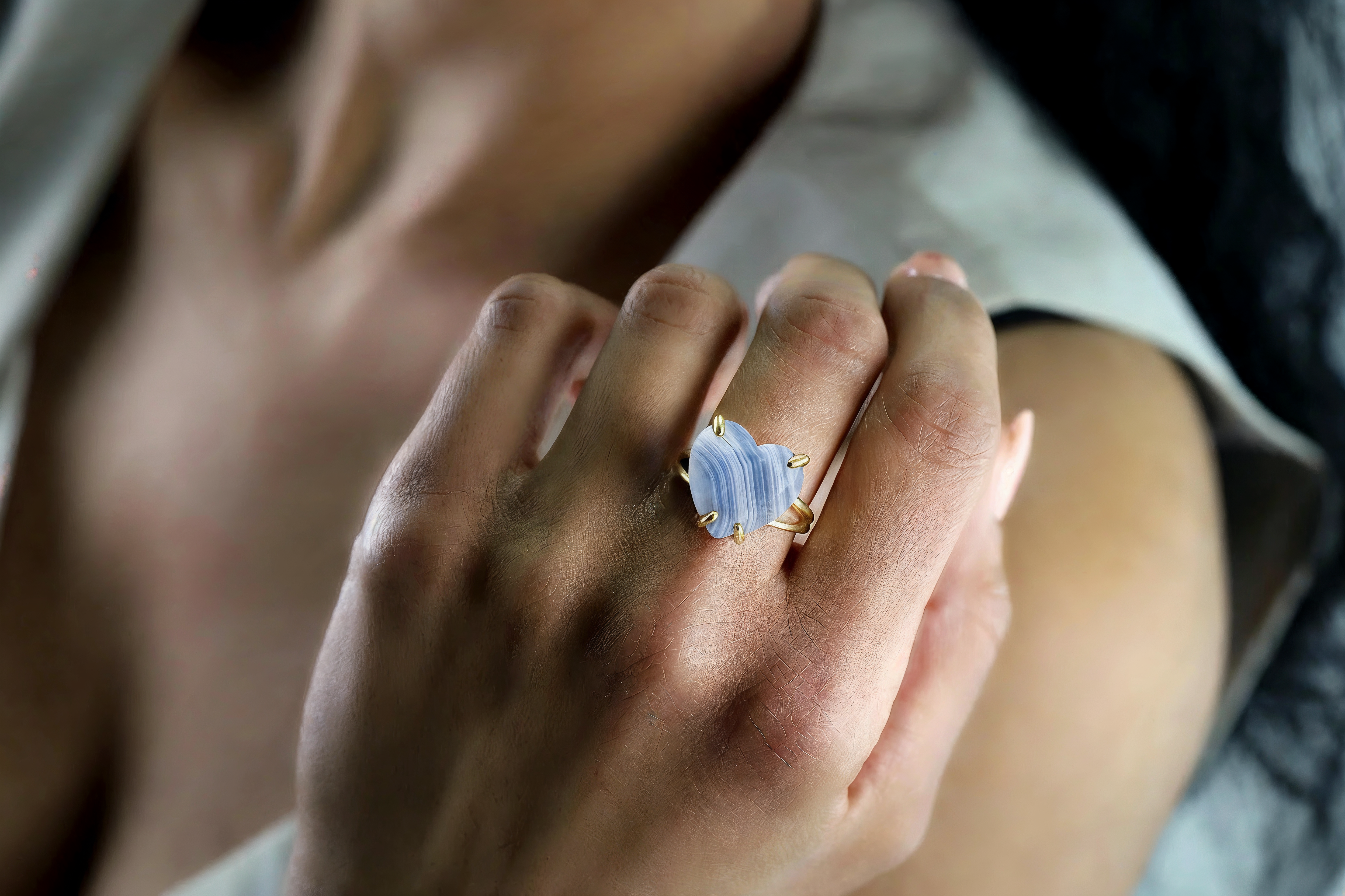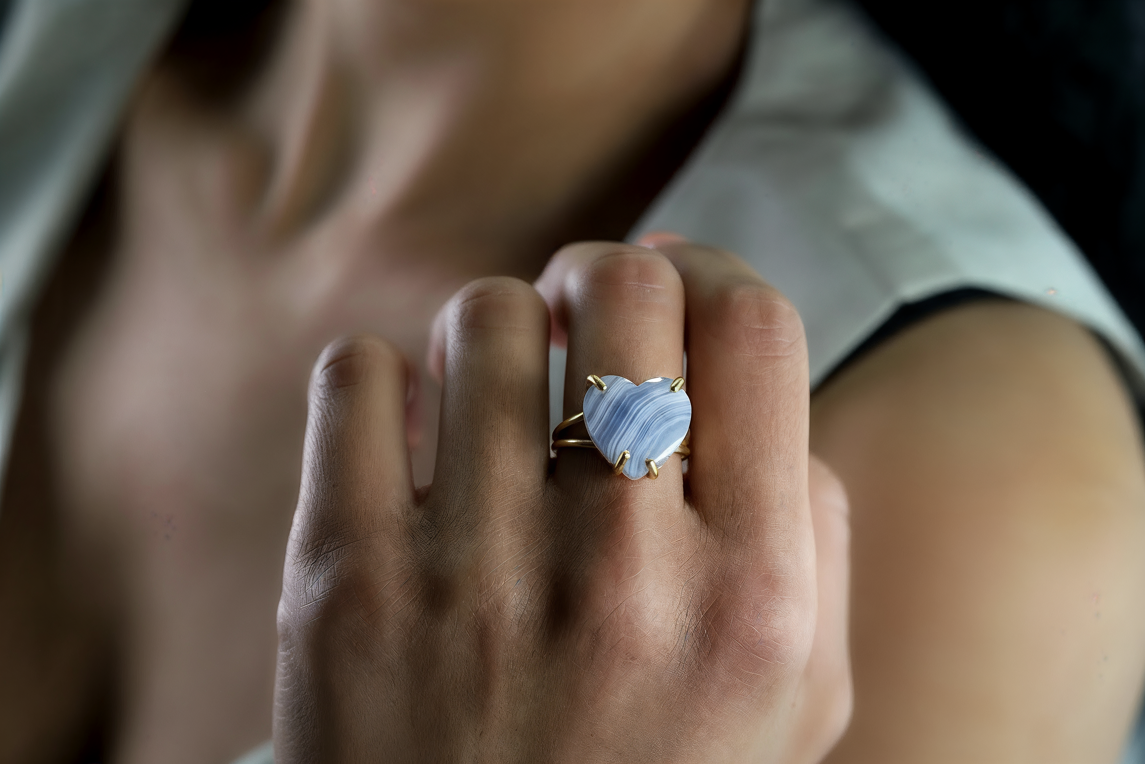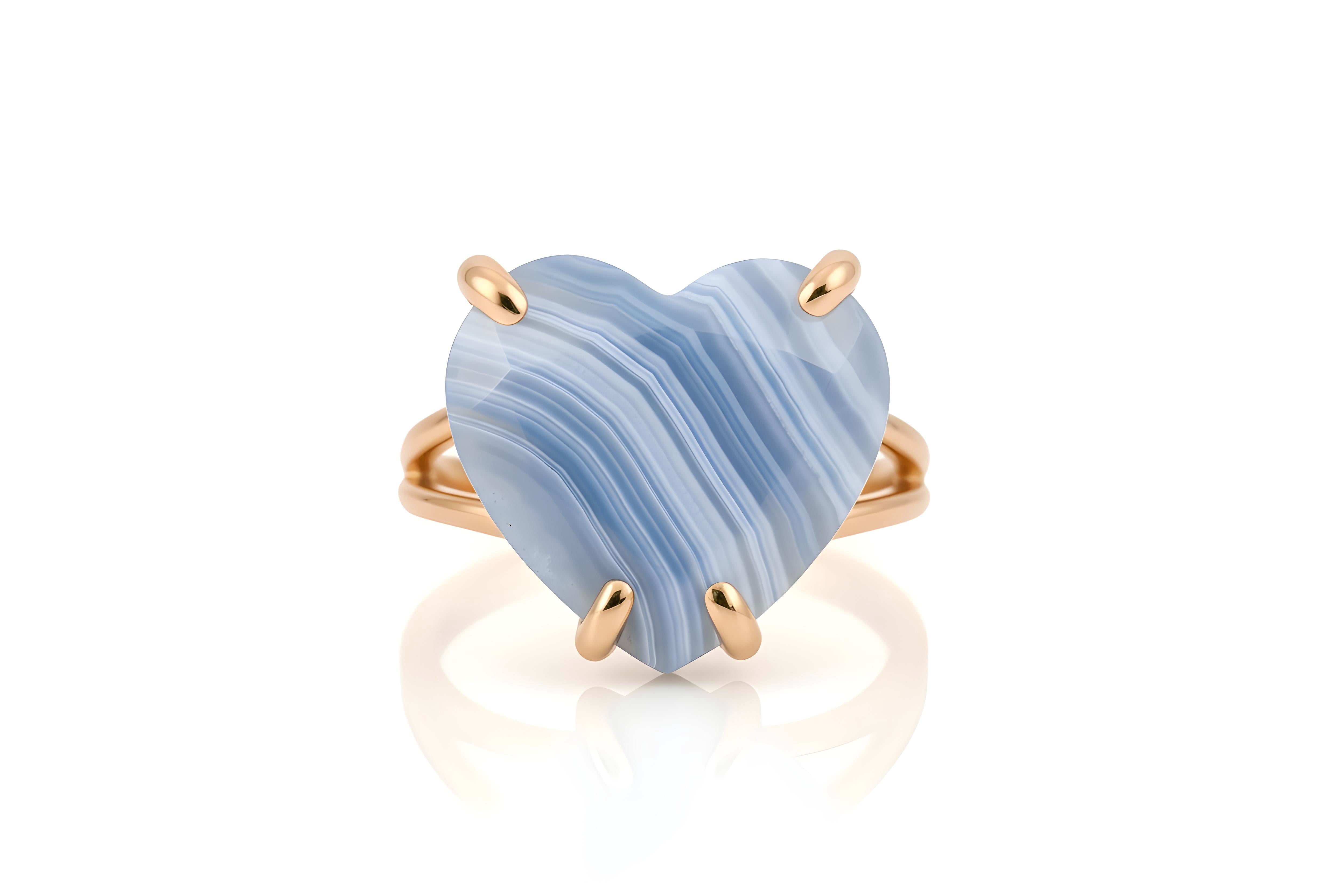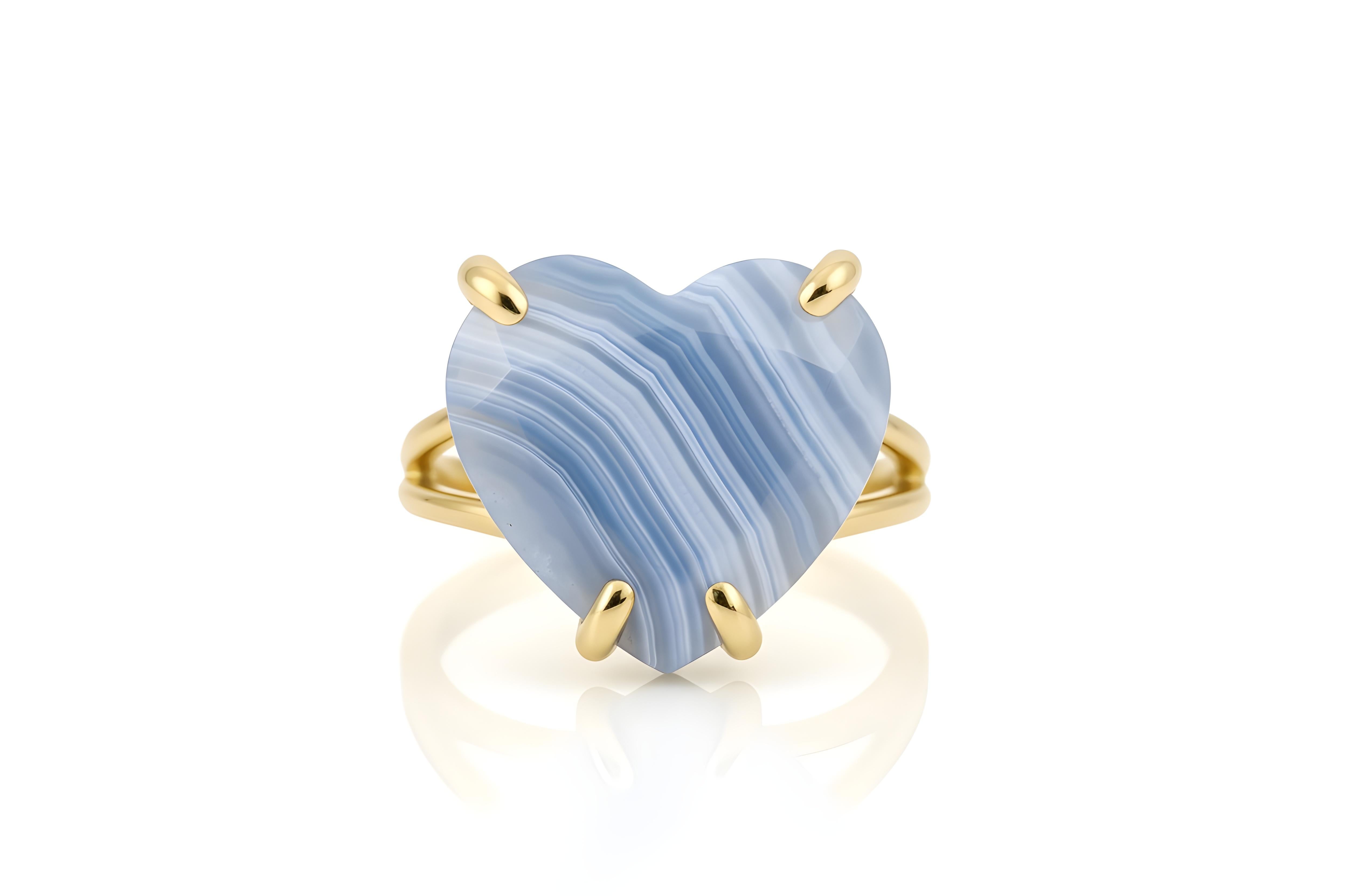 This blue lace agate ring is crafted in 14k gold, featuring a heart-shaped gemstone set in a polished double band design. The soft blue patterns of lace agate bring calmness and beauty, making it both meaningful and stylish.