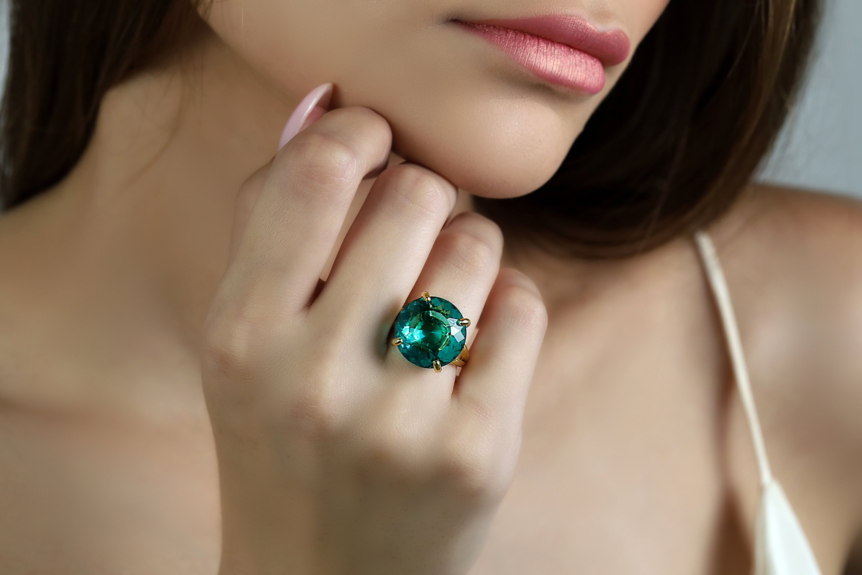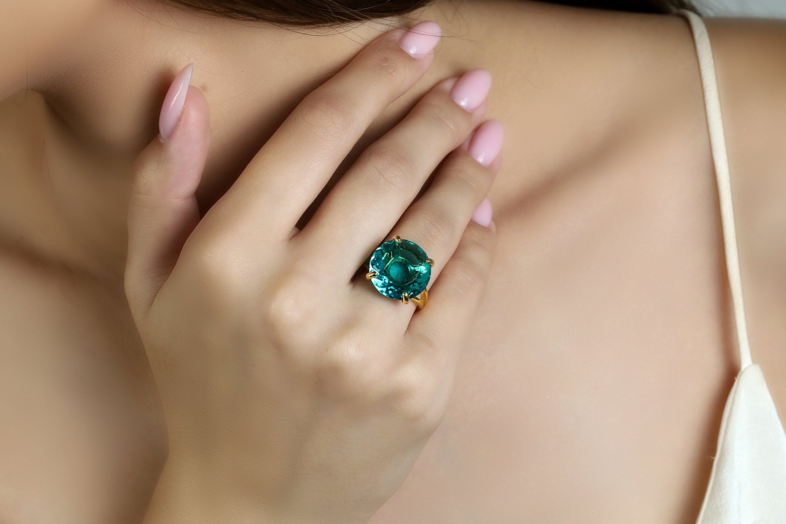 Make a statement with our Blue Tourmaline Solitaire Ring, featuring a stunning round cut blue tourmaline set in a luxurious gold band. This elegant ring is perfect for women who appreciate bold and beautiful jewelry. The blue tourmaline, an October birthstone, adds a touch of sophistication and color to any outfit. Whether you're dressing up for a special occasion or adding a pop of color to your everyday look, this ring is a perfect choice