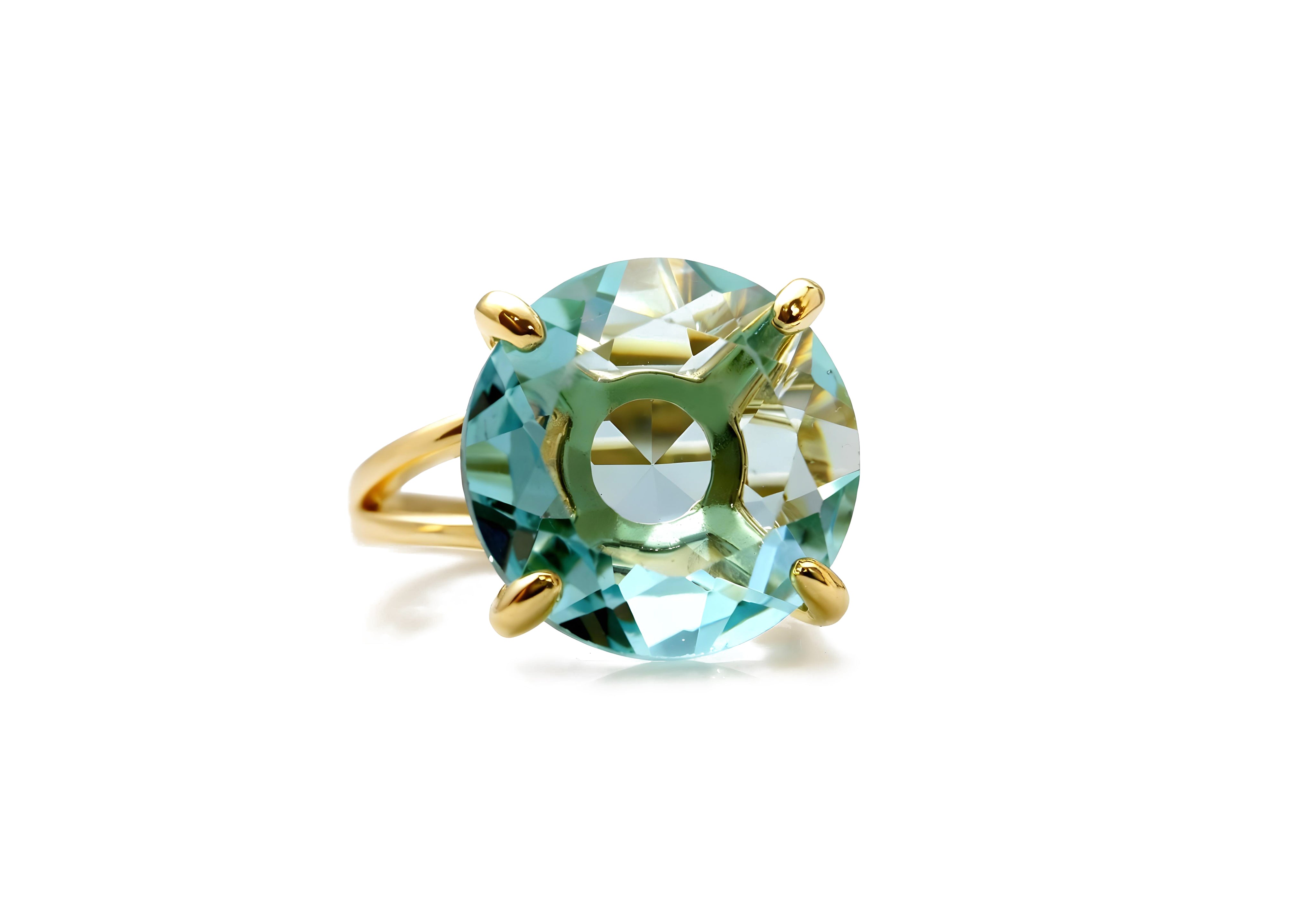 This blue topaz ring radiates brilliance with its vibrant sky-blue hue and faceted round cut. Crafted in 14k gold filled metal, the gemstone’s sparkle is amplified by the high-polish finish and secure prong setting. Each ring is handmade to showcase the natural clarity of the topaz, creating a sophisticated and refreshing piece. Perfect for special occasions or everyday wear, this statement ring brings a touch of light and elegance to every look.
