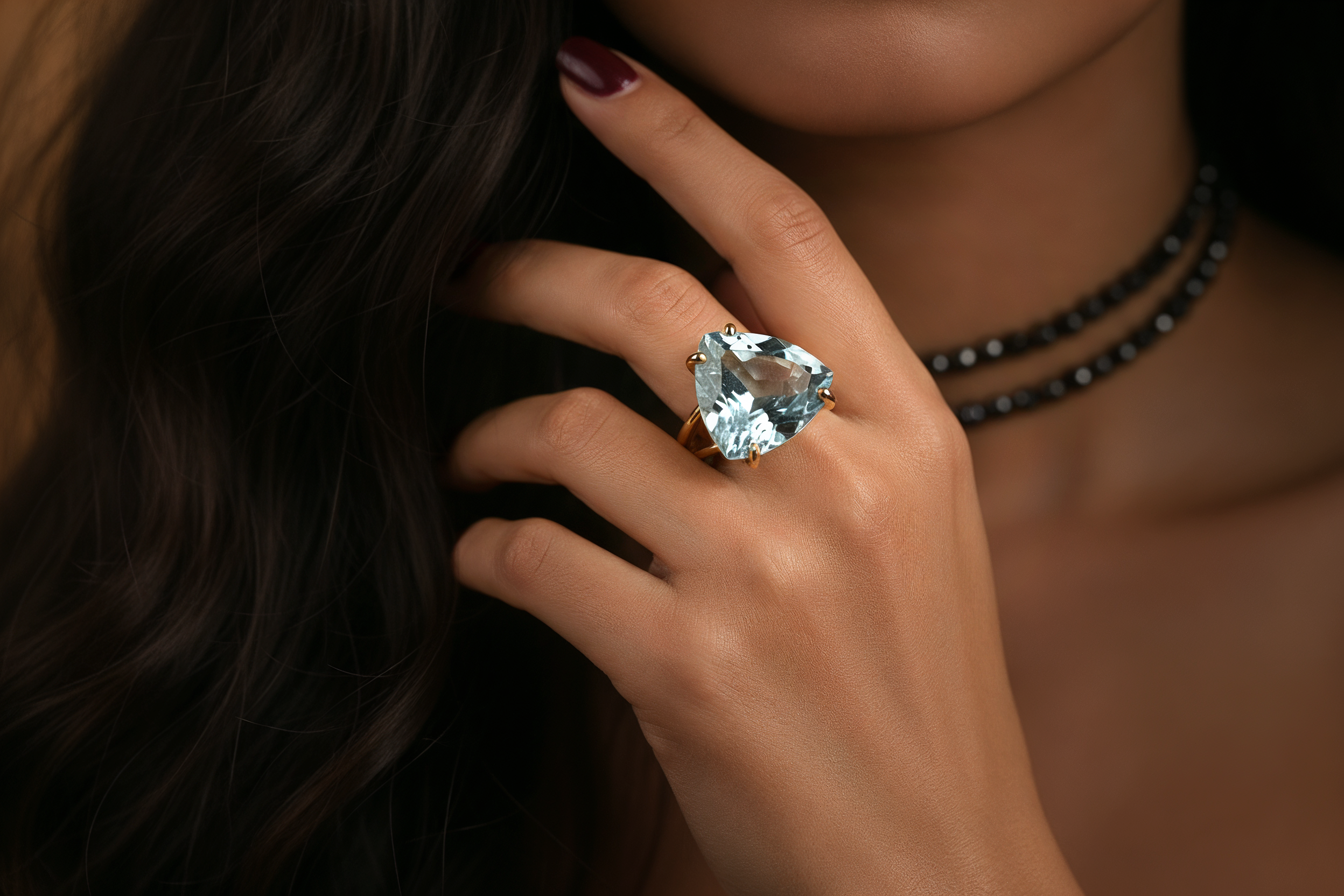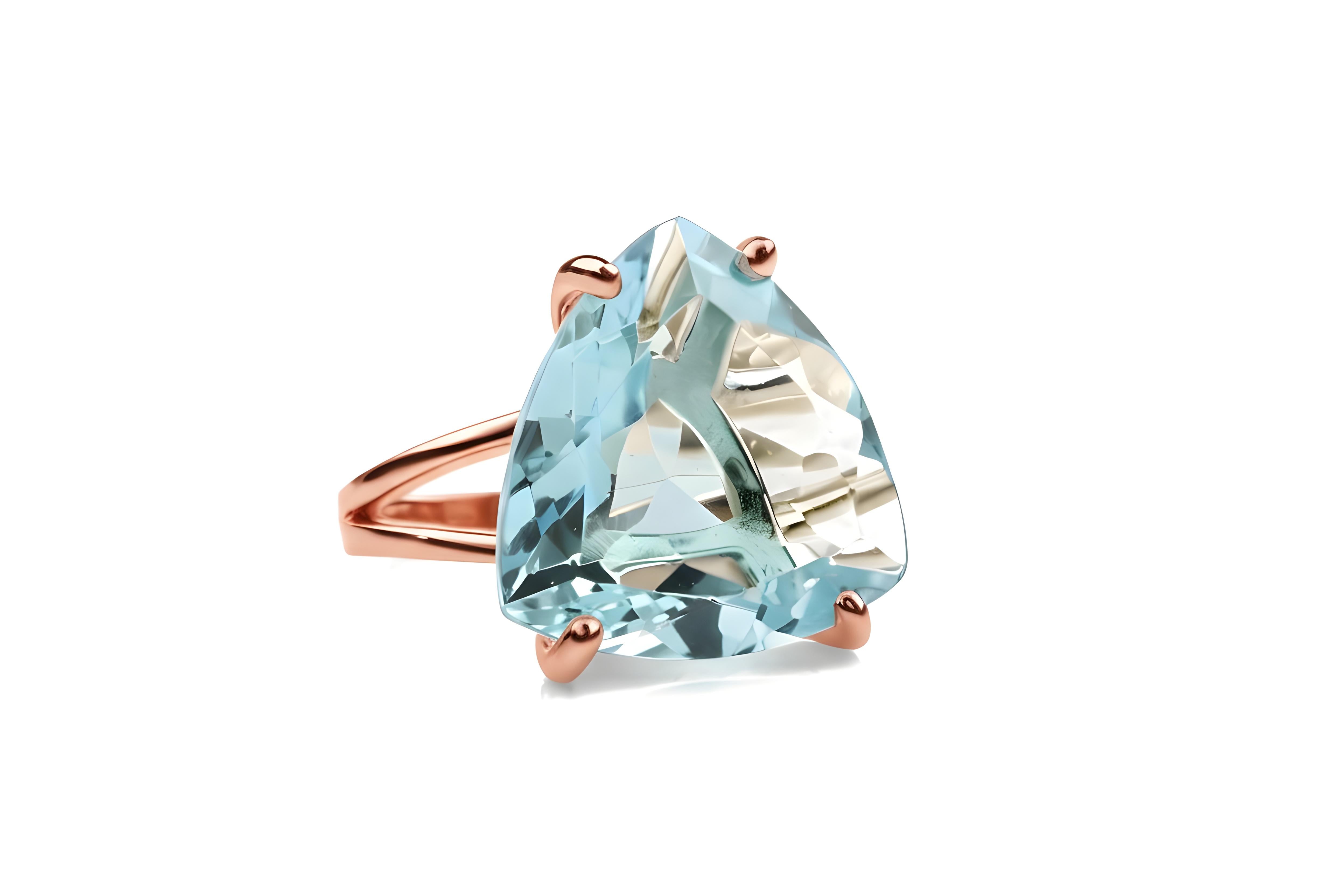 This exquisite rose gold blue topaz ring showcases a stunning trillion-cut gemstone that sparkles with icy blue brilliance. Set in 14k rose gold with a sleek double band, it blends contemporary design with timeless beauty. A perfect handcrafted statement piece and an elegant October birthstone gift.
