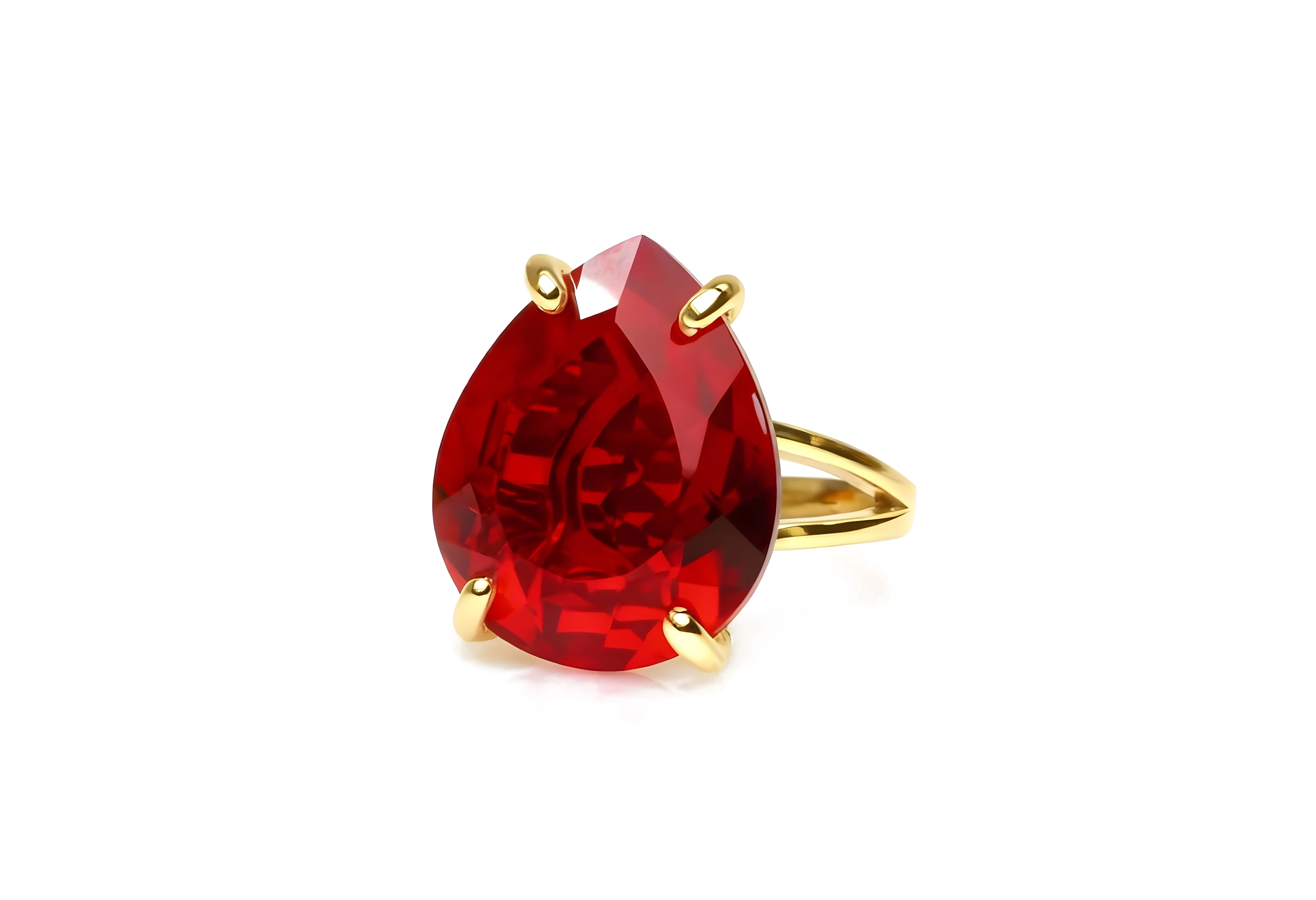 A breathtaking pear-cut ruby steals the spotlight in this 14k gold ring. Its deep red hue embodies passion and love, while the teardrop shape adds a touch of sophistication. Perfect for celebrating July birthdays, anniversaries, or special moments, this handcrafted statement piece blends elegance with timeless charm.