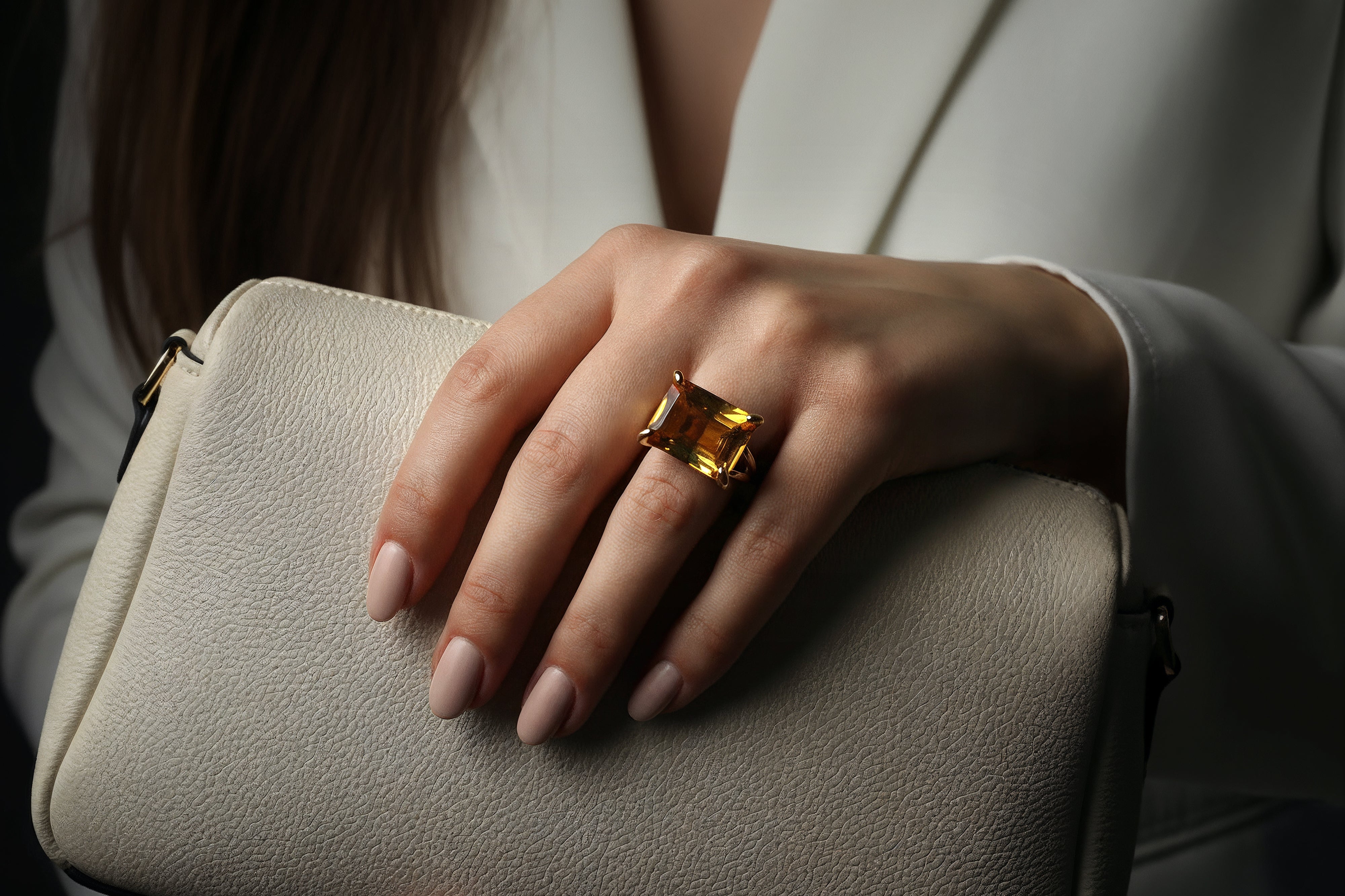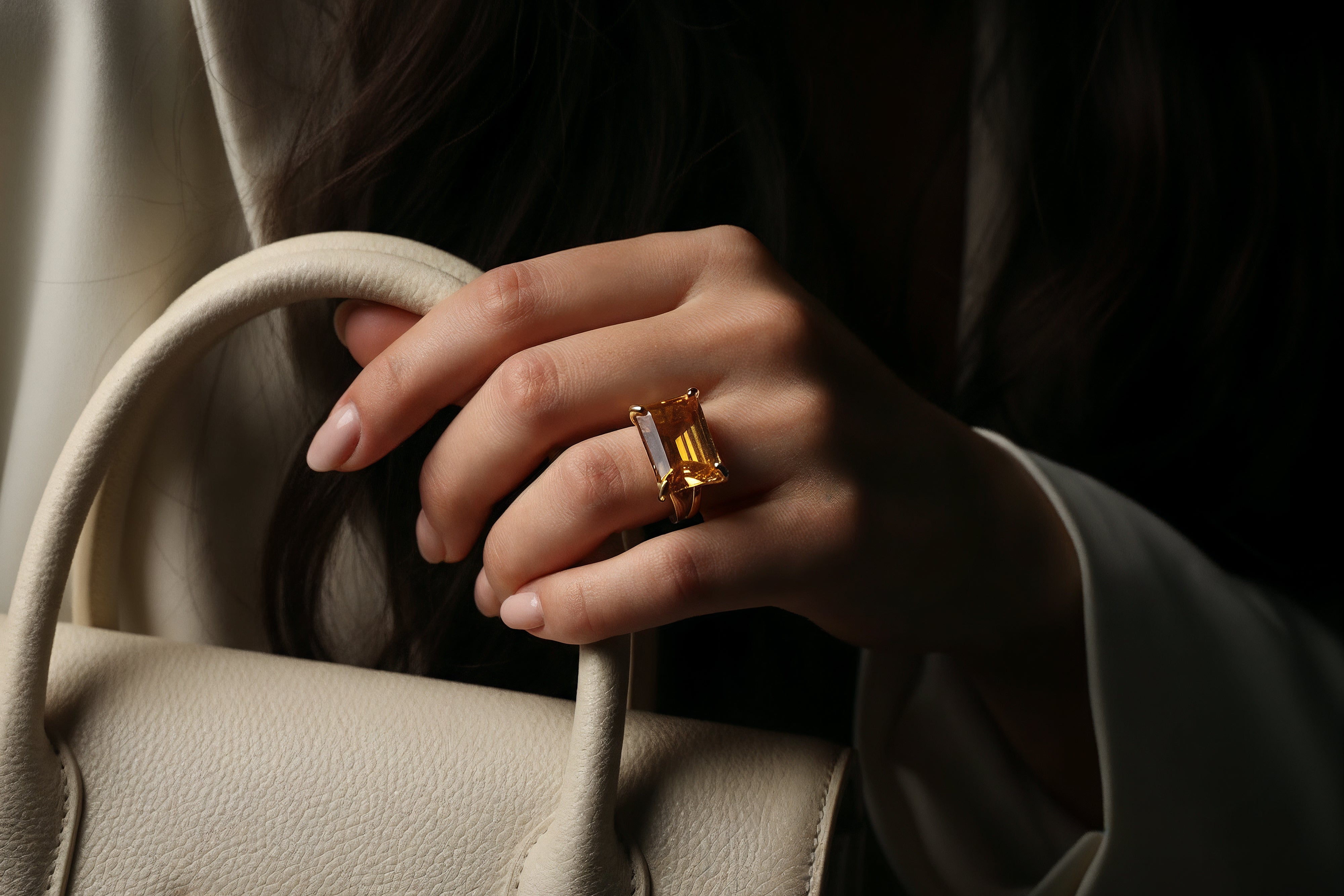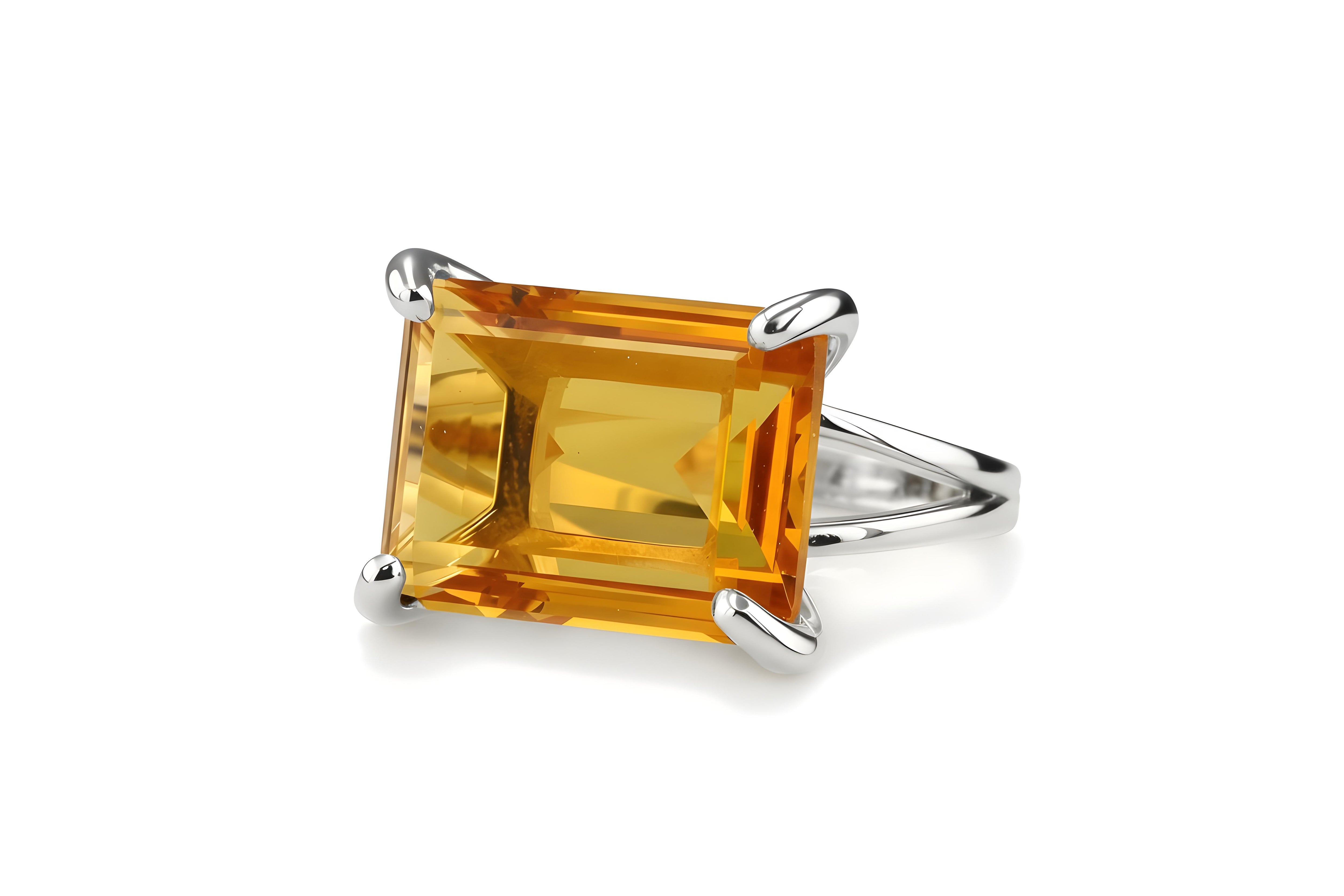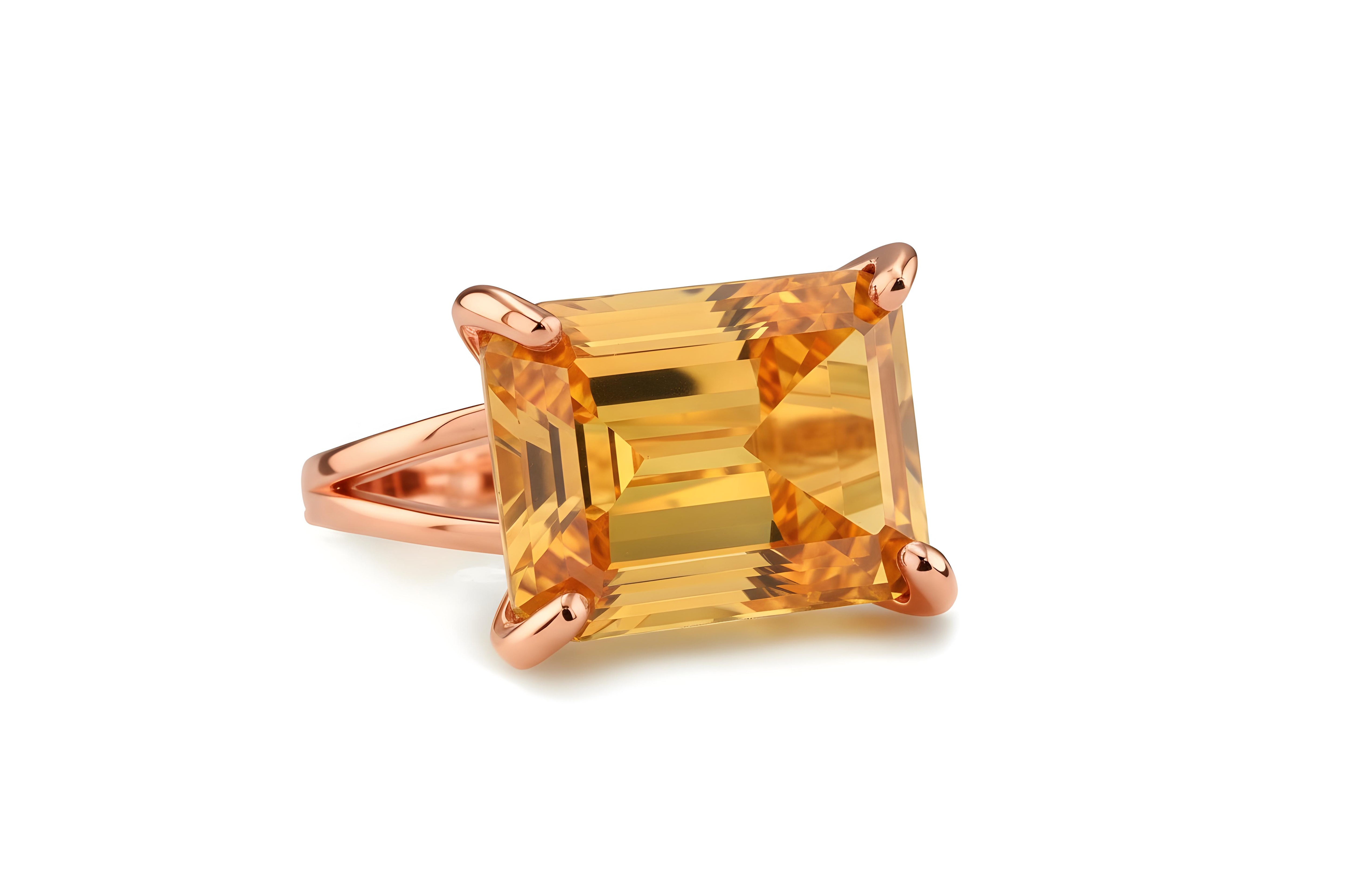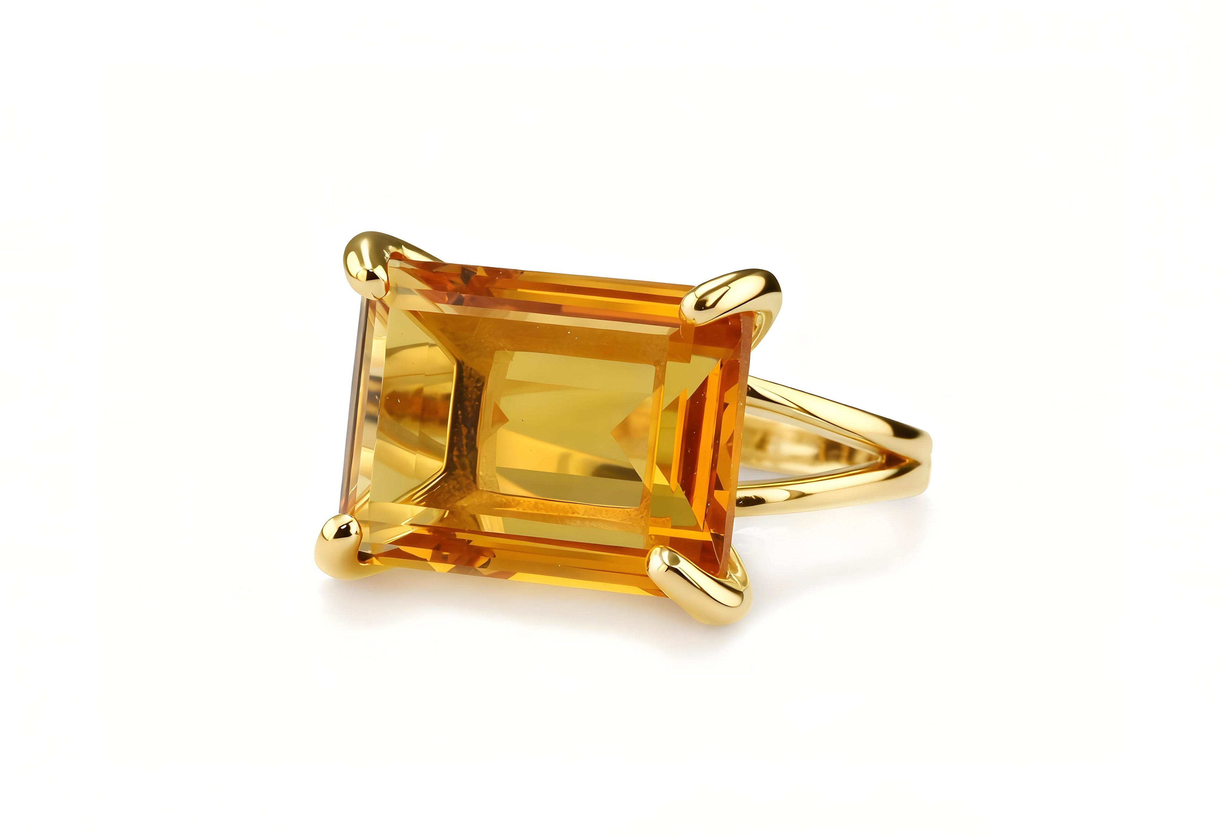 This rose gold citrine ring features a radiant emerald-cut gemstone that glows with warm golden-orange tones. The November birthstone, citrine, symbolizes positivity, abundance, and energy. The rectangular cut creates a sleek, modern silhouette complemented by the soft rose gold finish. Handcrafted with care, this ring makes a luxurious statement piece or a meaningful gift for women who love vibrant gemstone jewelry.
