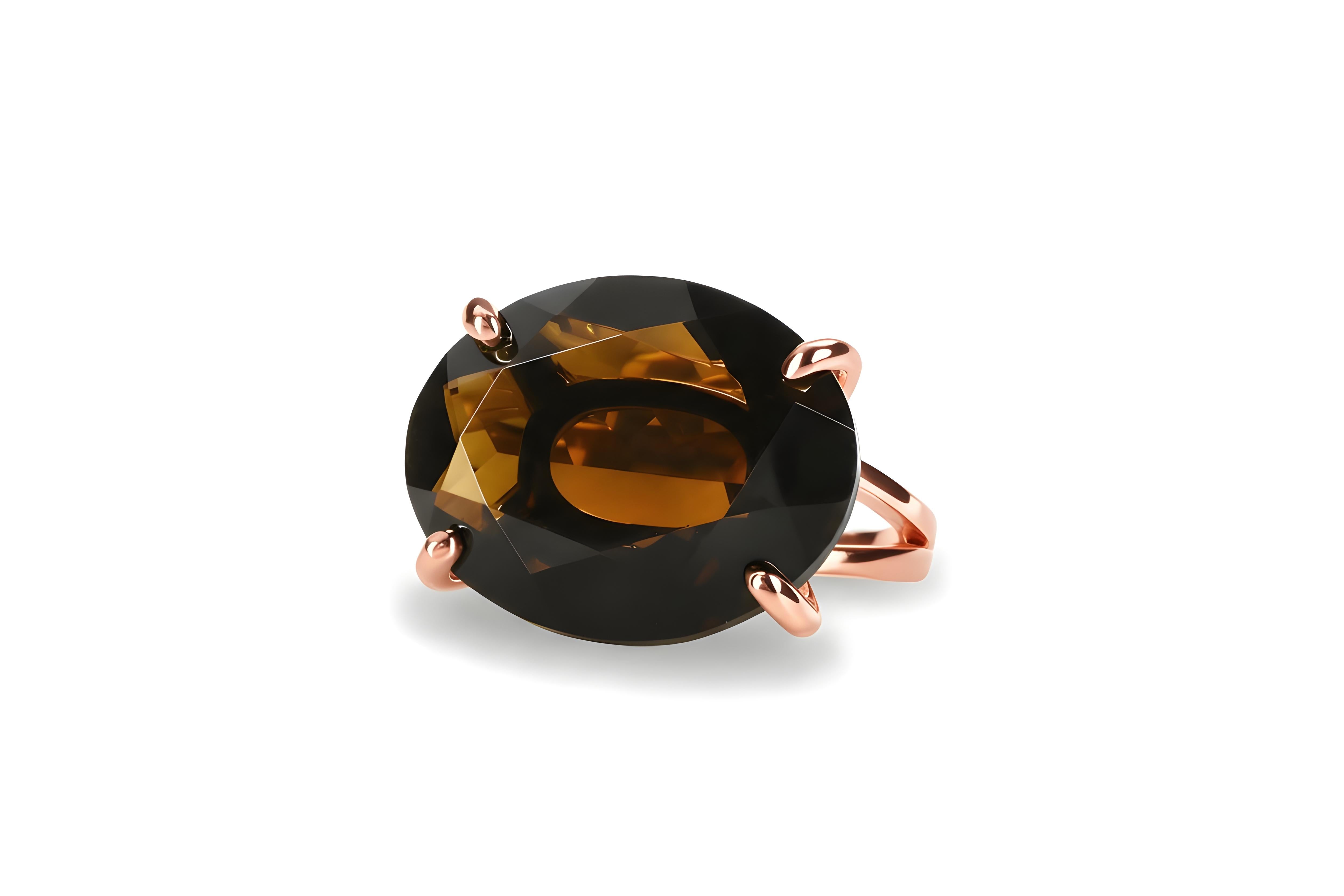 This rose gold smoky quartz ring features a glowing oval-cut gemstone in warm earthy tones. Handcrafted in 14k rose gold vermeil, it combines soft pink hues with rich brown brilliance — a modern, romantic statement piece made for any occasion.