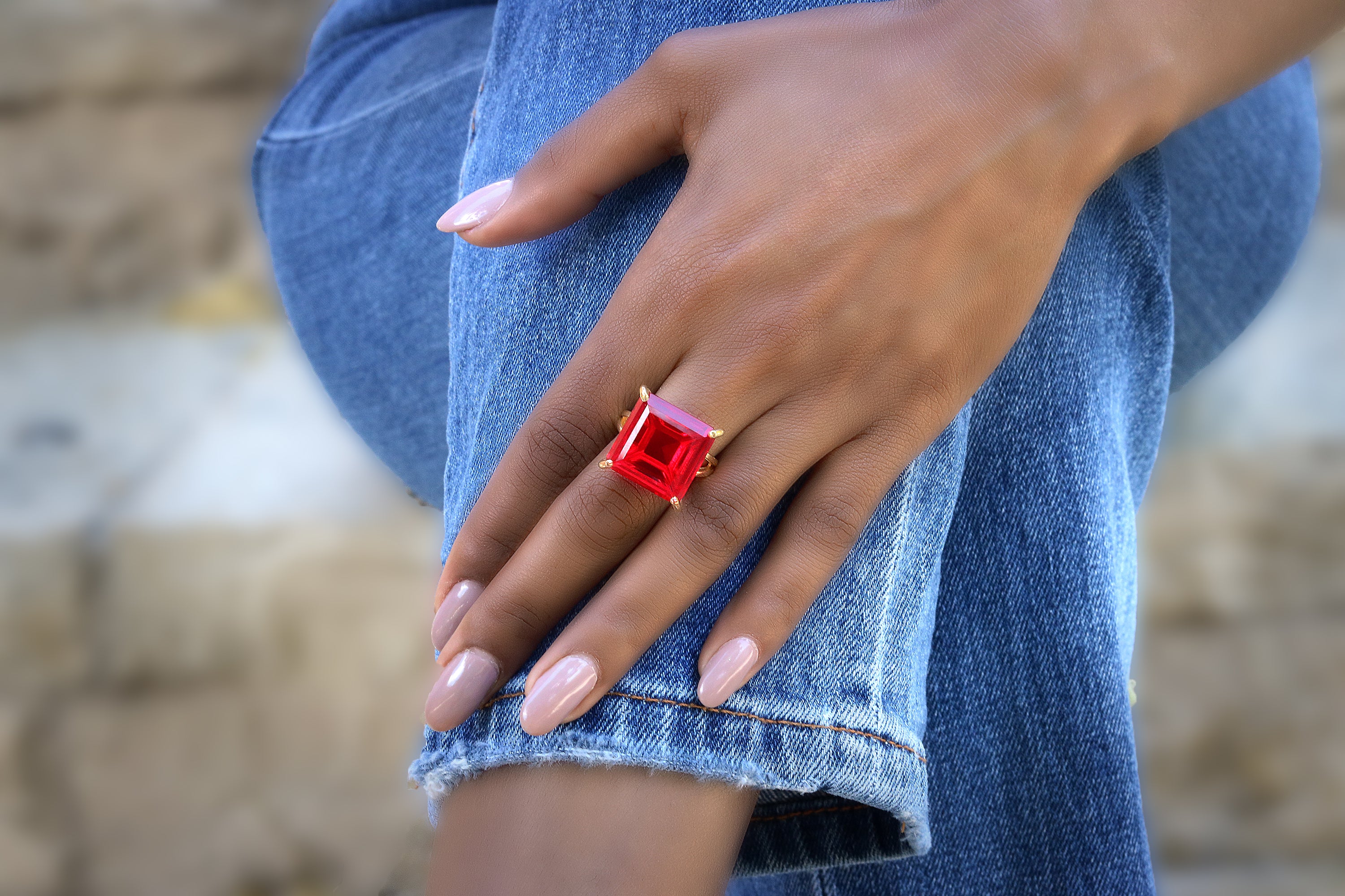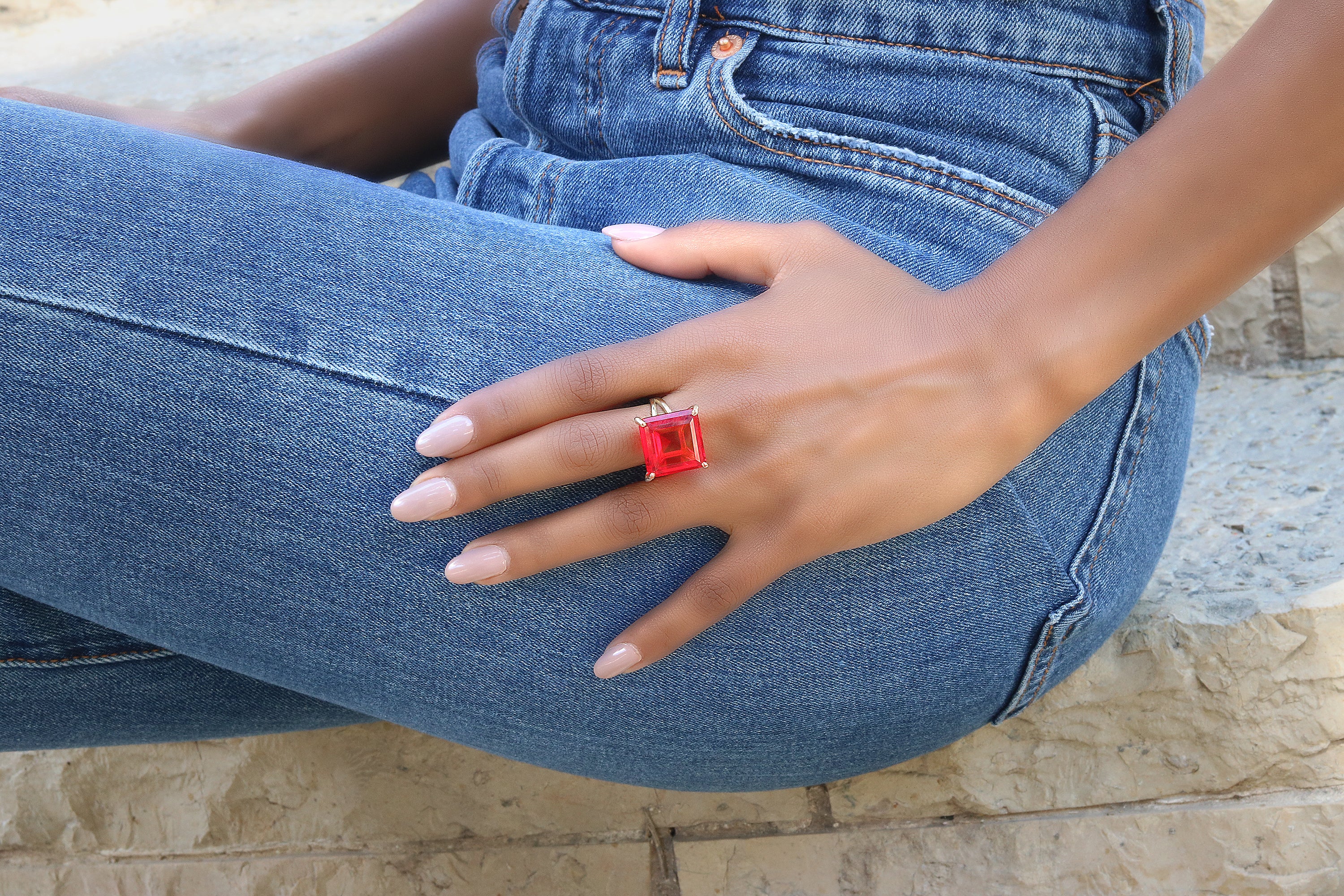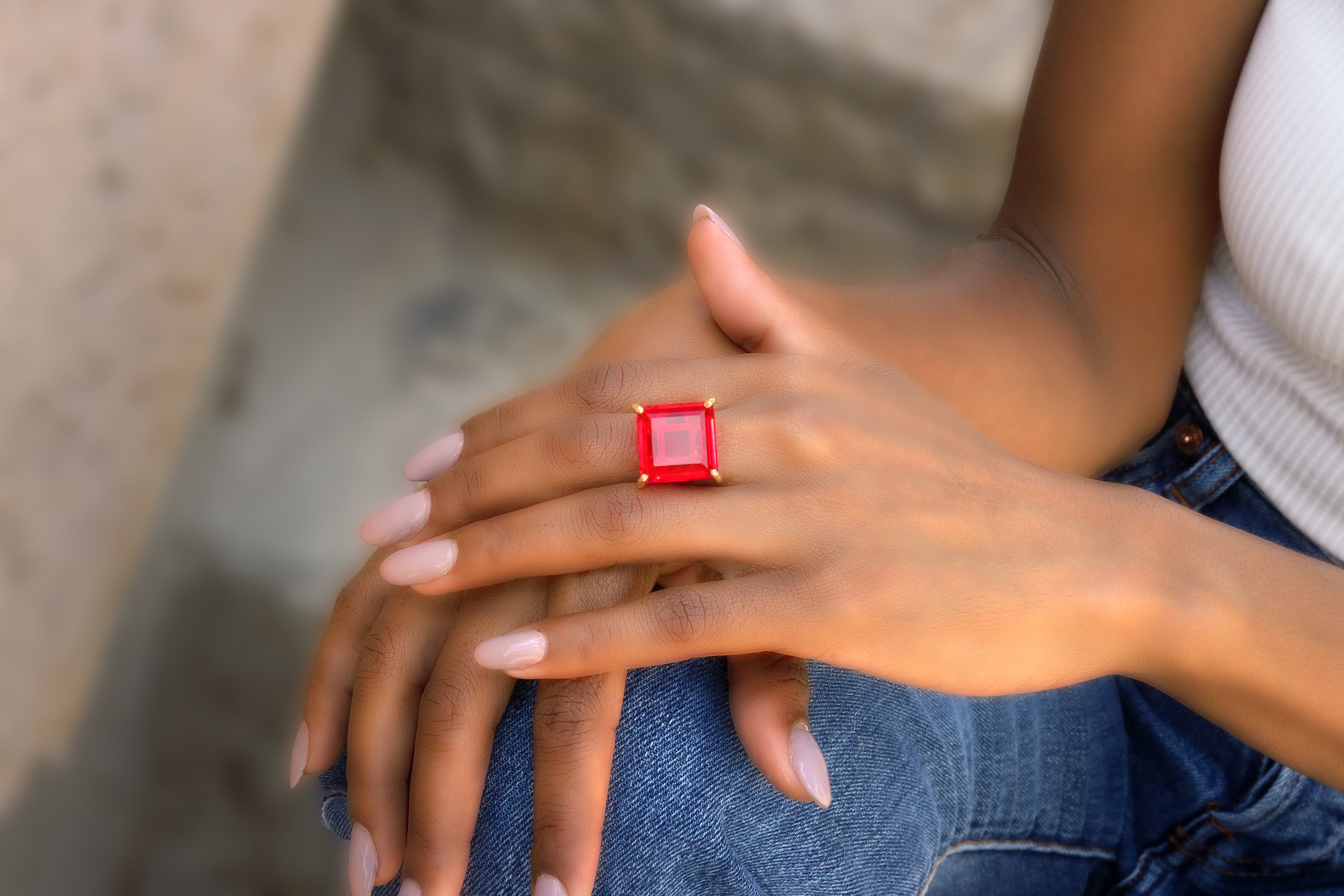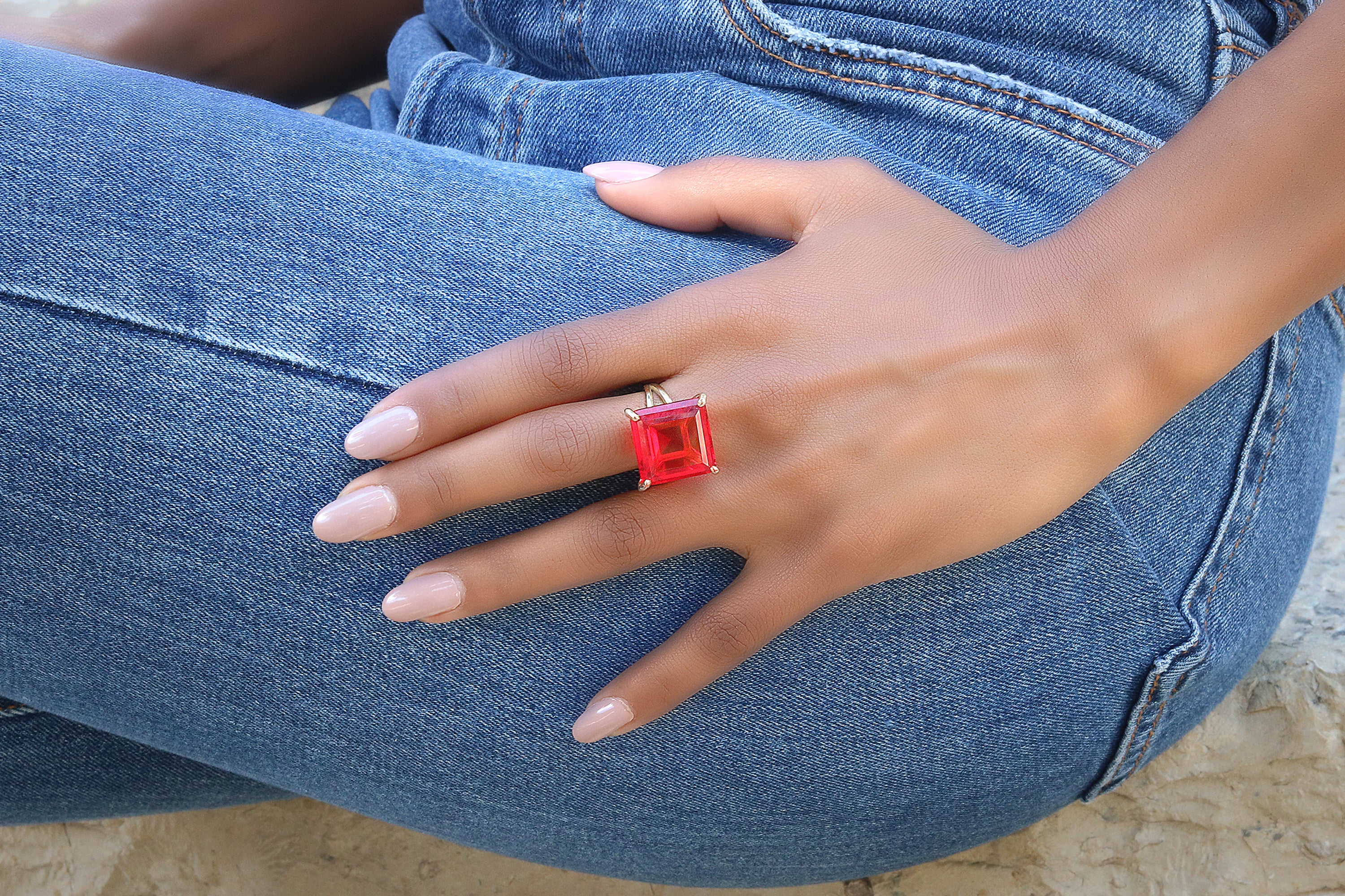 Featuring an eye-catching stone, this lab created Ruby ring is ready to bring a bold vibrance to your style. This square ring has an unmistakable beauty that is stunning to wear with a lovely dress for a sophisticated style. Big rings for women are classic styling pieces that every woman must-have.