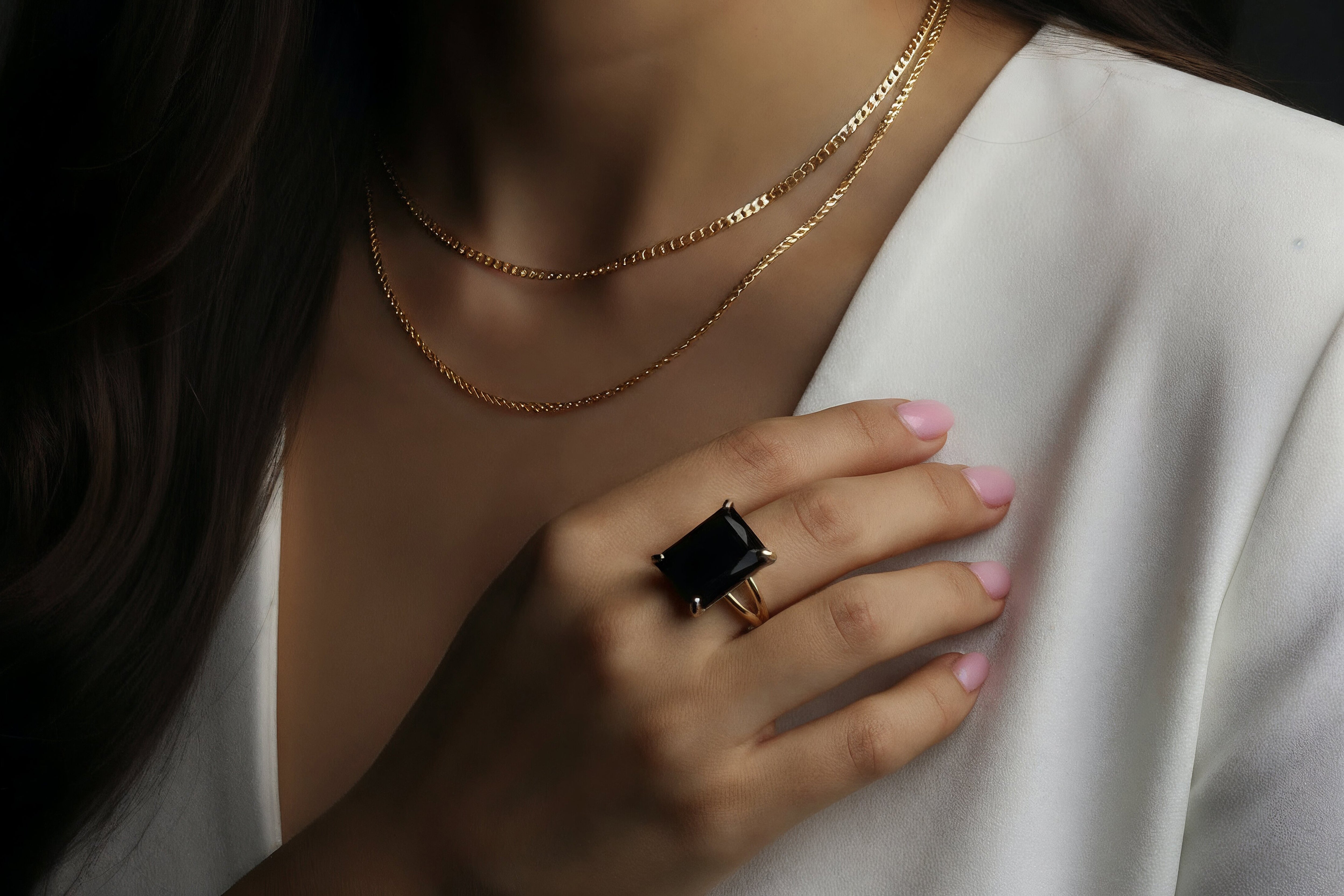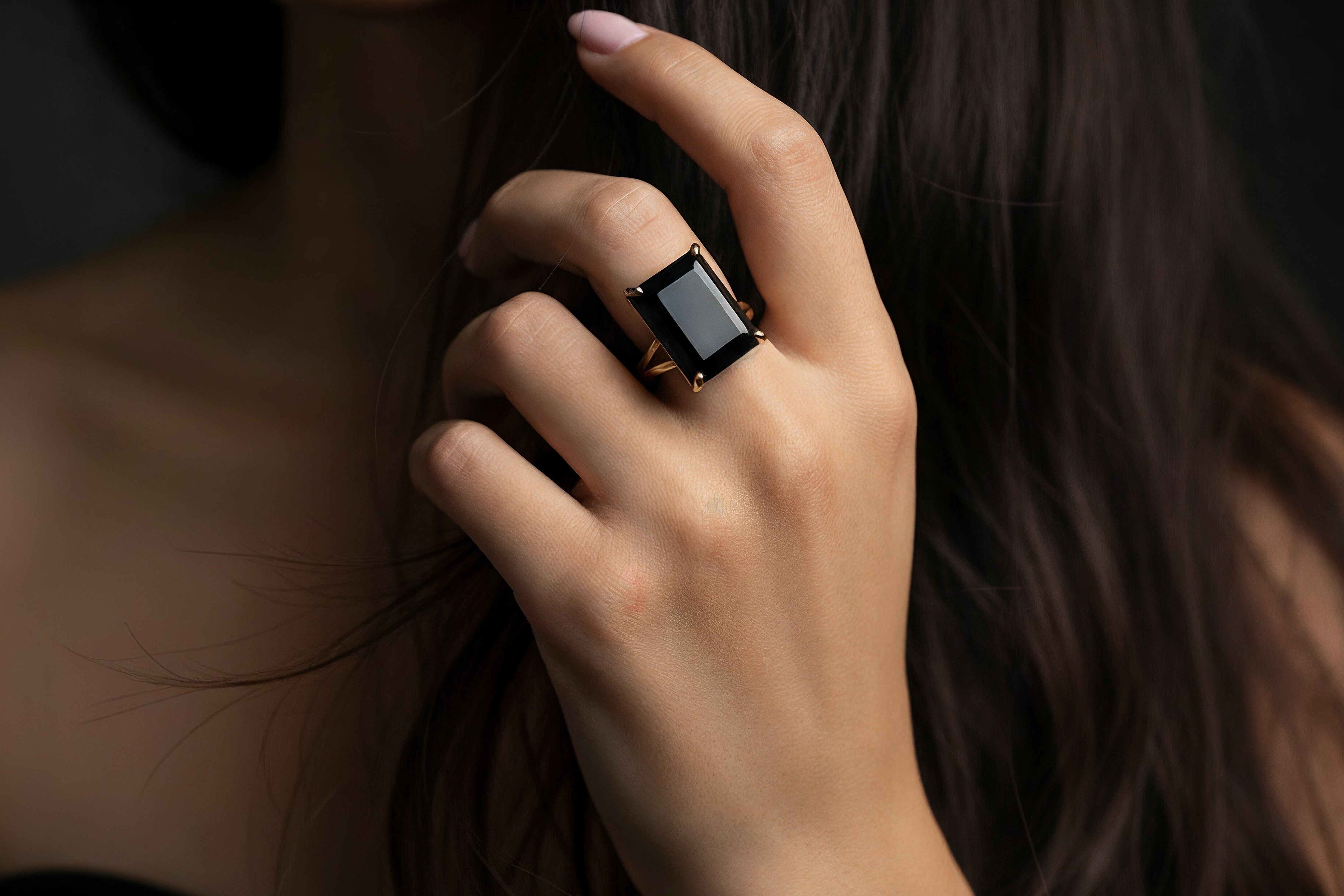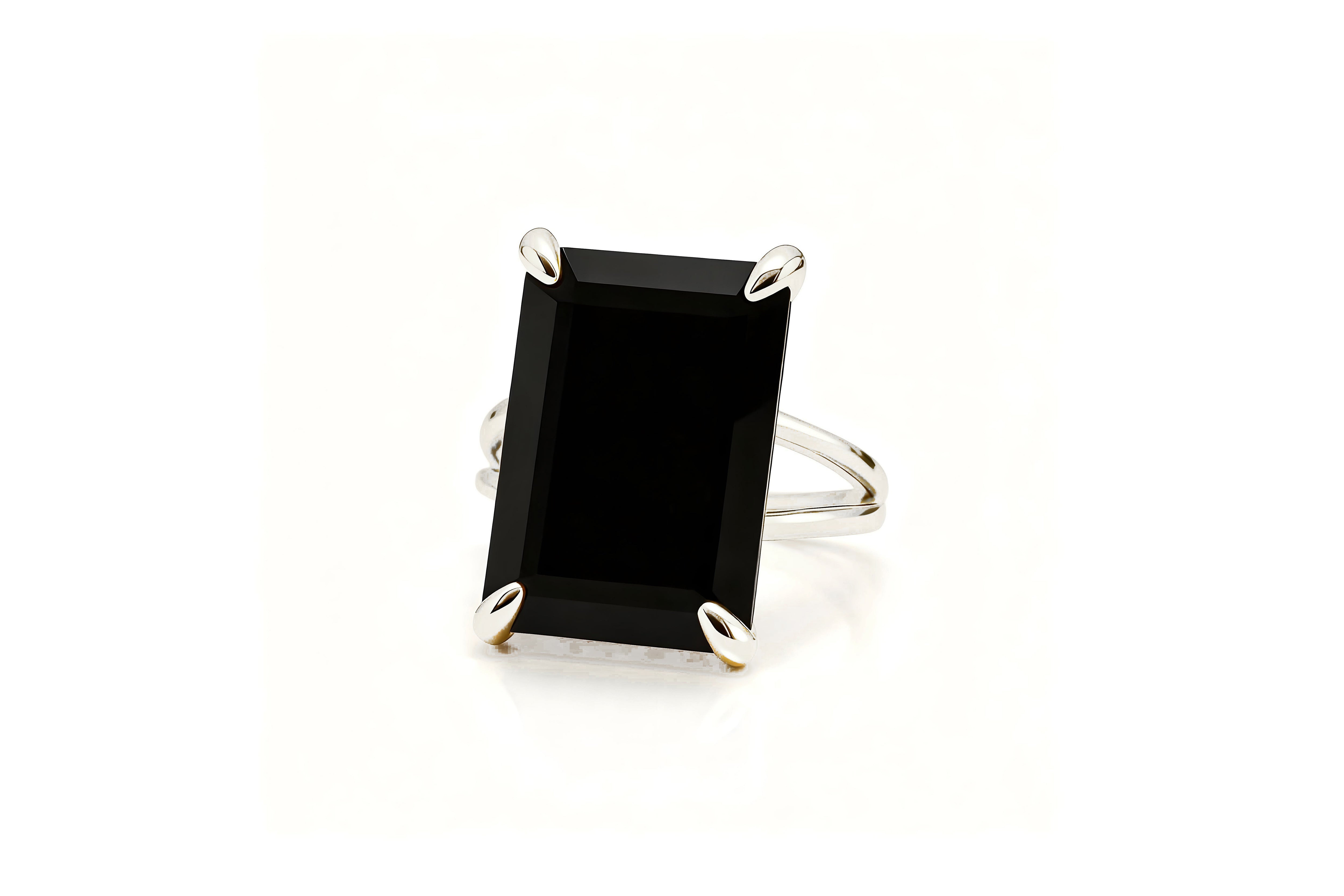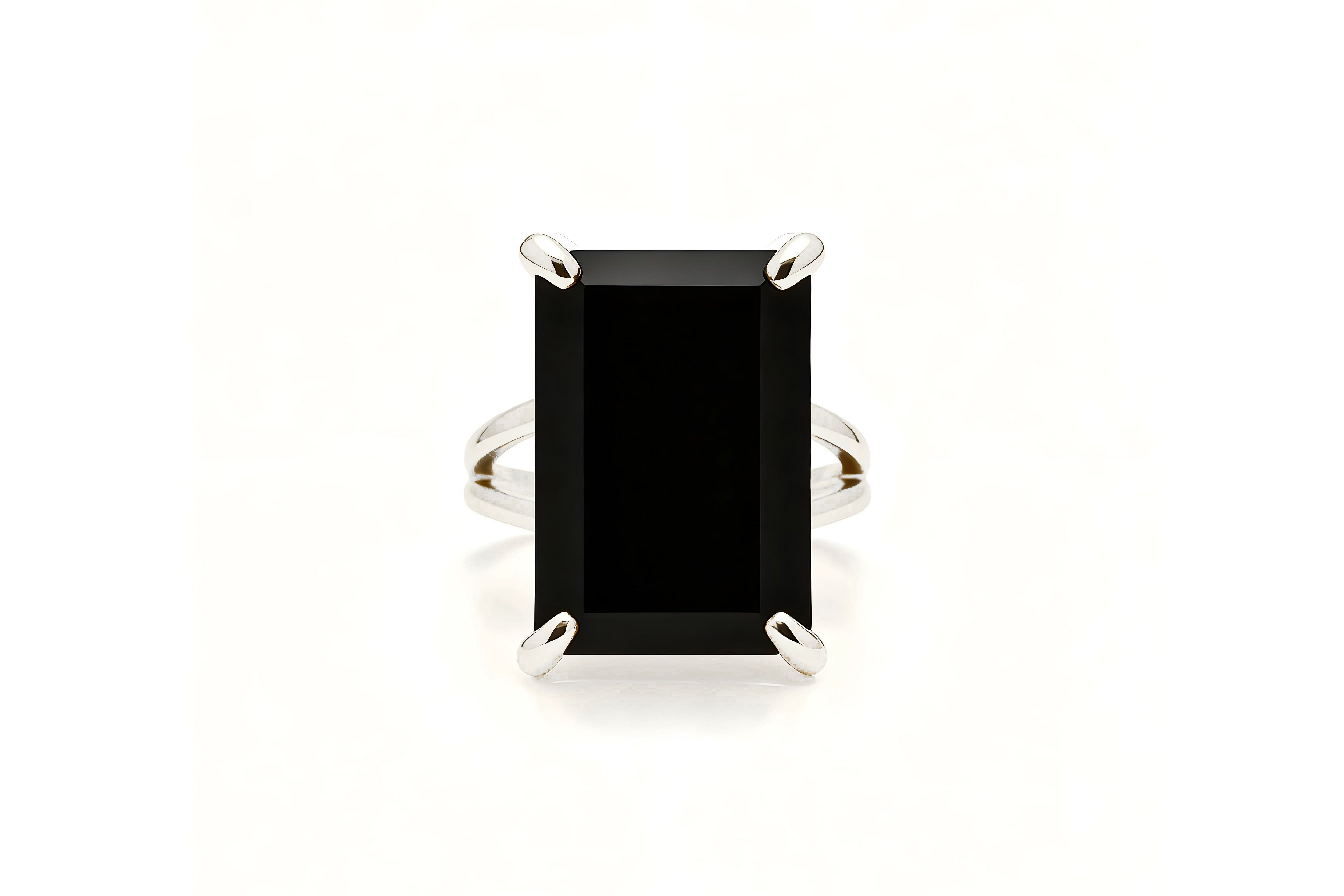 This sterling silver ring showcases a rectangular-cut black onyx gemstone set in a polished silver band. The sleek, modern design highlights the deep black tones of natural onyx, known for strength and balance. Perfect as a cocktail ring or an everyday piece, this handmade gemstone ring offers timeless style and versatility. Crafted with care, it’s a meaningful gift or a lasting addition to any jewelry collection.