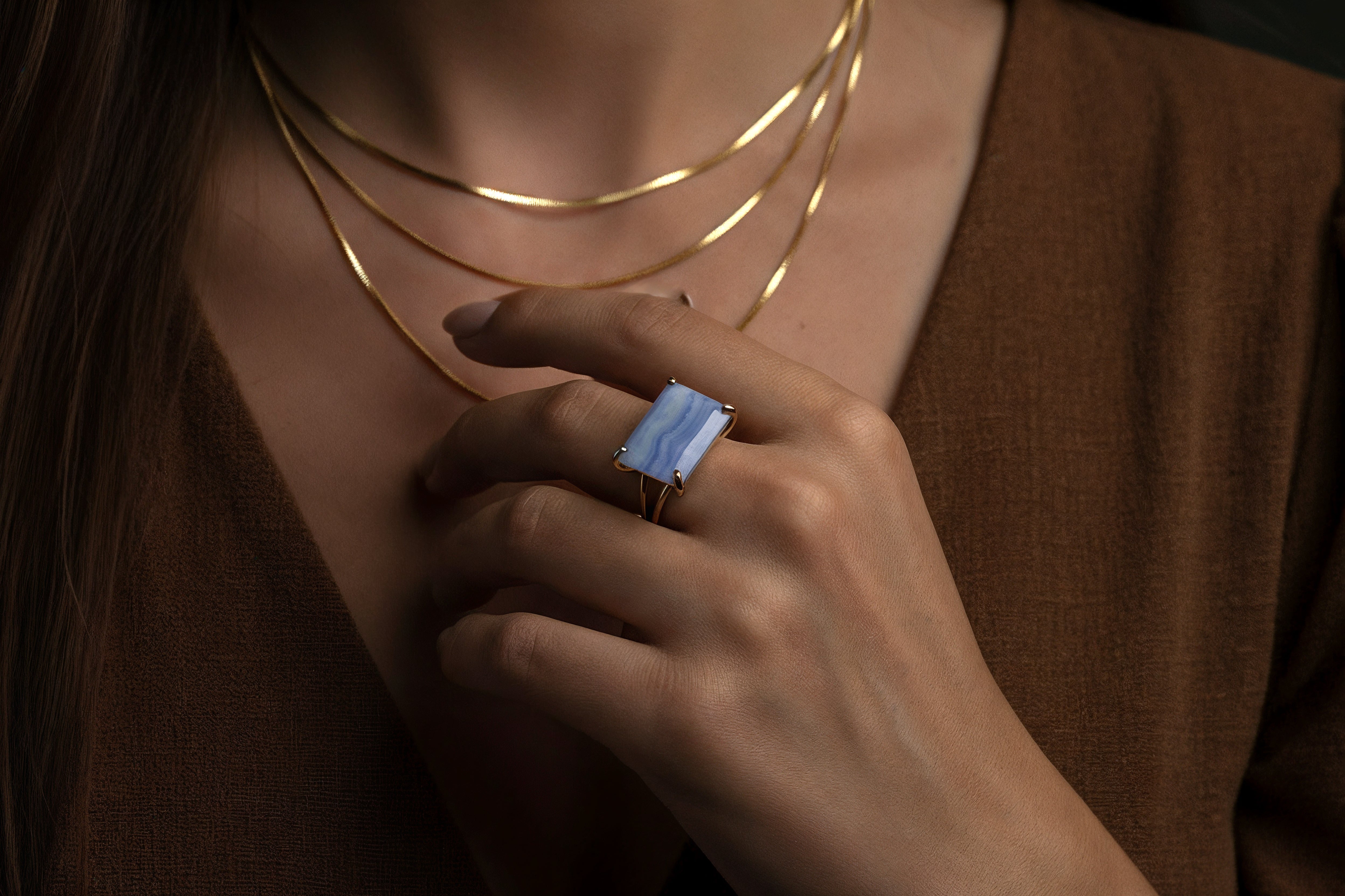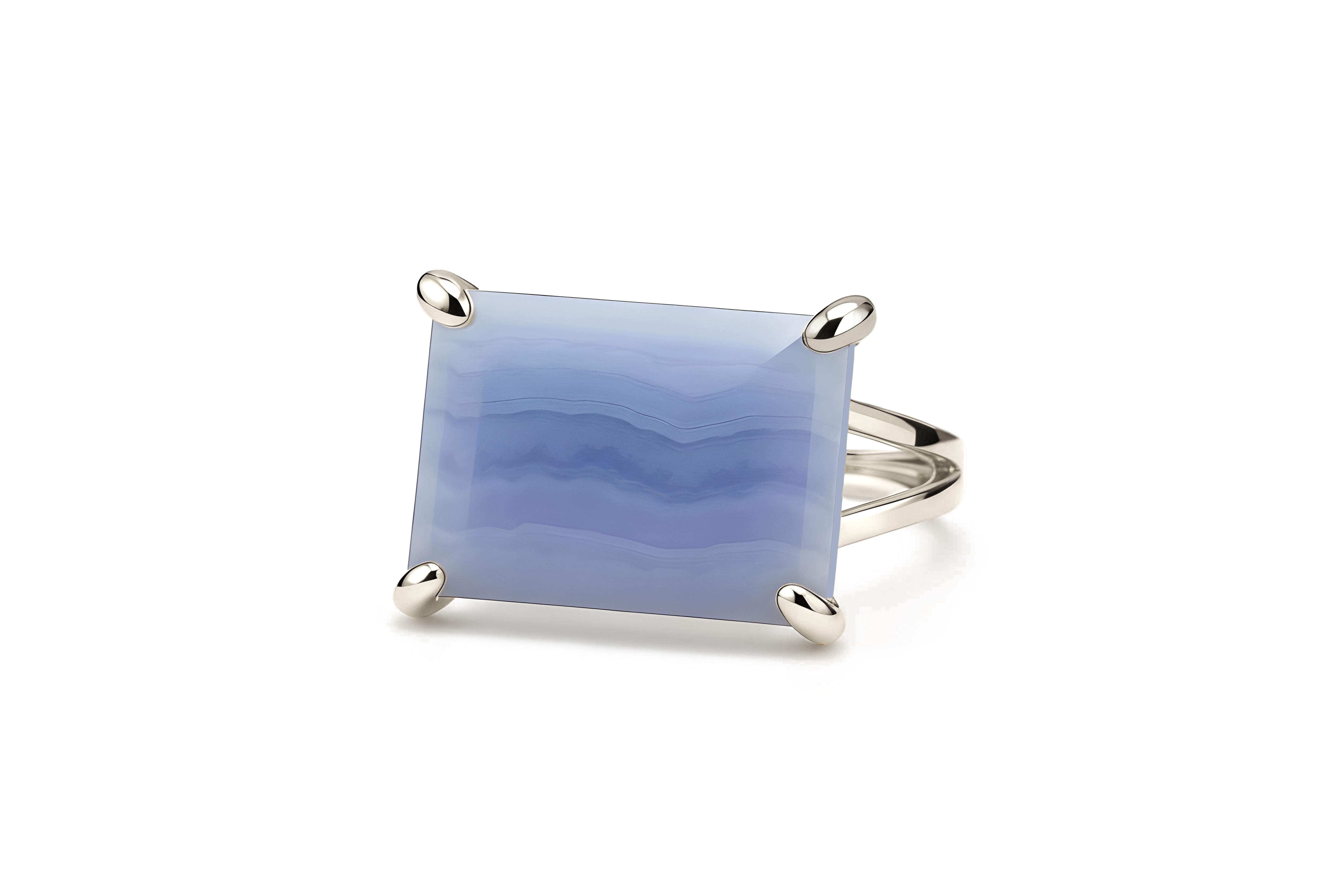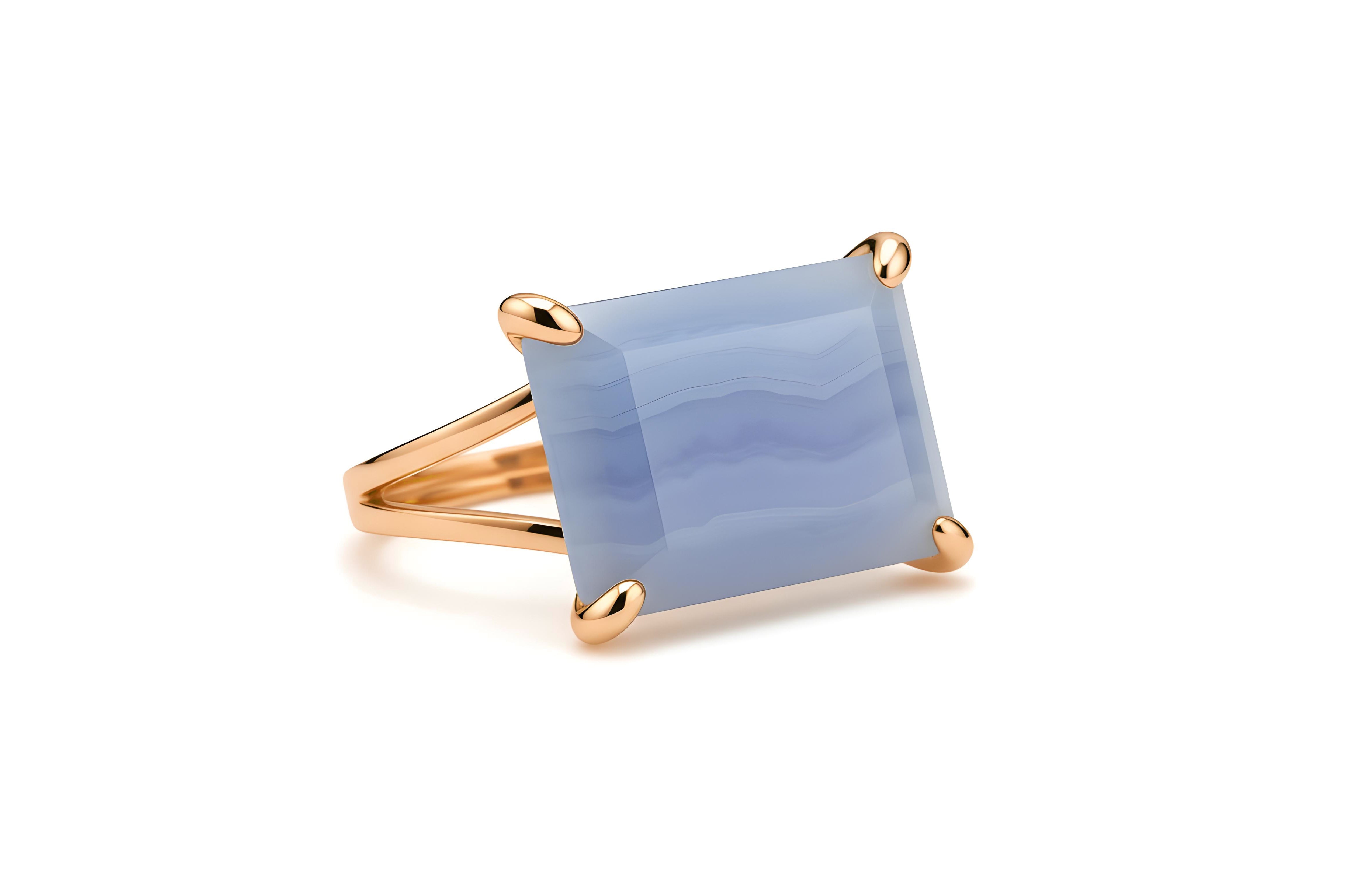 This blue lace agate ring features a rectangular-cut semiprecious gemstone set in a polished rose gold band. The wide prong setting highlights the natural blue banded patterns of lace agate, known as a stone of balance and calming energy. Bold yet elegant, this cocktail ring makes a modern statement while remaining versatile for daily wear. Handcrafted with care, it’s a perfect gemstone ring for women who love both style and meaning.